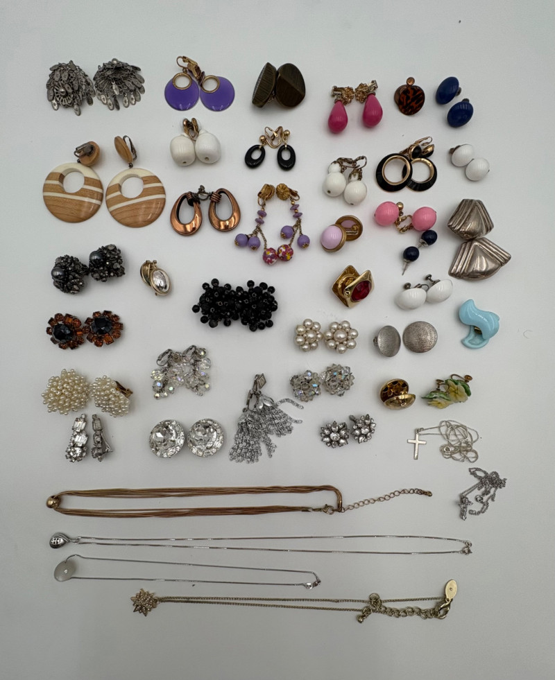 Mixed jewelry lot of clip earrings - some vintage - and a couple of necklaces. What you see is what you get. Please note that while we gave the pieces a look, they were not inspected; nothing egregious was noted during that quick look, however.