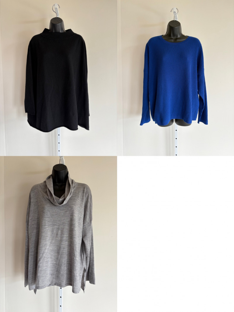 Trio of soft Eileen Fisher sweaters for all occasions. All measure 27" pit to pit and size tags say XL. Black sweater has mock turtleneck, 3/4 raglan sleeves, and rolled cuffs/hem. Recycled cashmere/wool blend. Brilliant blue sweater has dropped shoulder seams, ribbed curved neckline/cuffs/hem, and vertical rib knit pattern. Super soft hand in wool/polyester blend. Grey lightweight sweater has dropped shoulder seams, ribbed sleeves, wide modified funnel neck/cowl, and split hem with back several inches longer than front. 100% merino wool.