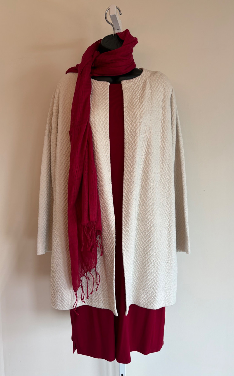 Terrific soft separates with a punch of color from Eileen Fisher. Ivory jacket has round neckline, open front, and soft small diamond shape quilting. Silk/cotton/nylon/spandex blend. Measures 24" pit to pit and 29.5" from back neckline to hem. Size tag says L. Blood red smooth knit dress is sleeveless and straight-cut with small split hem. Viscose/spandex blend. Measures 22.5" pit to pit and 38" from back neckline to hem. Size tag says L. Paired with blood red scarf with fringe on short ends. Measures approx. 24" x 76". No fabric tag, but feels like cotton.