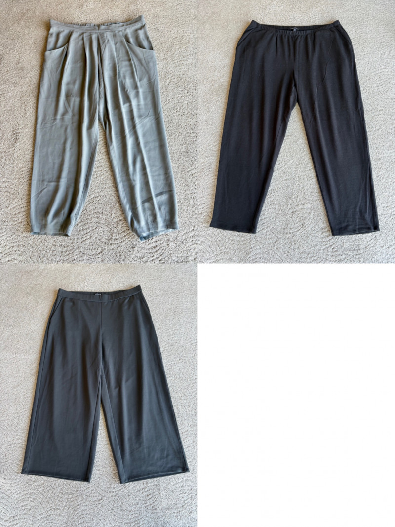 3 neutral colored pants in tones of gray/black from Eileen Fisher. All measure 19" side to side at waist. Gray pleated silk pants have flat front waistband, elasticated back waistband, double front pleats, set-in pockets, and a flowing leg that is darted in at the cuff for a lantern shape. 100% silk. Size tag says L. Black super soft pants (feel similar to old school fleece sweats with soft inside!) have narrow elasticated waist and set-in front pockets. Tencel Lyocell/organic cotton blend. Size tag says XL. Gunmetal grey knit pants have flat elasticated waistband, set-in side pockets, and fairly wide legs. They feel and hang like a very good quality ponte. Tencel Lyocell/nylon/spandex blend. Size tag says XL.