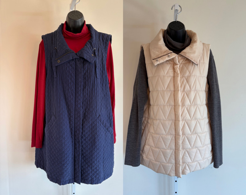 Vests for you every need from Eileen Fisher. Blue longer length vest from Eileen Fisher has funnel neckline with ties, zip front closure with snap hidden placket, and welted slash pockets in relatively thin silk fabric. Measures 24" pit to pit and 32" from back neckline to hem. Size tag says XL. Note this piece has overall wear - we waffled on including it, but believe it would be greatly improved by a date with your sweater shaver. Paired with deep red Tencel blend turtleneck from Eileen Fisher. Measures 23" pit to pit by 25" from back neckline to hem. Size tag says 1X. Off-white Eileen Fisher triangle-quilted vest has 2-way zip front, seven snap packet, welted slash pockets, and smooth interior. Made of recycled and virgin polyester. Measures 23" pit to put and 26.5" from back neckline to hem. Size tag says XL. Paired with grey Eileen Fisher lightweight turtleneck in merino wool. Measures 22" pit to pit and 24" back neckline to hem. Size tag says L.