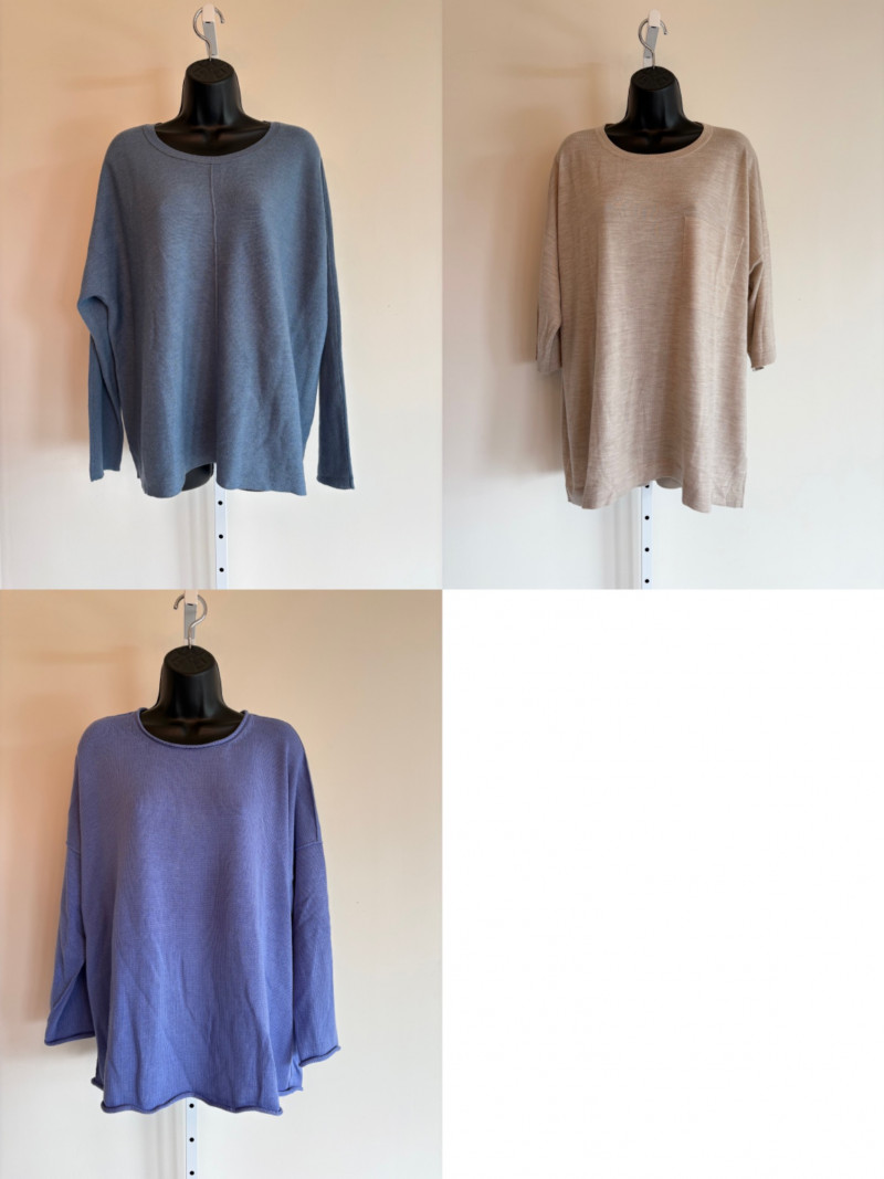 Trio of casual sweaters from Eileen Fisher. All measure 27" pit to pit. Blue lightweight sweater has round neckline, center front/back seaming, long sleeves, and ribbing at neckline. 100% merino wool. Size tag says XL. Super soft beige lightweight sweater has round neckline, short sleeves, ribbing at neck/arms/bottom hem, and a breast pocket. 100% merino wool. Size tag says XL. Amethyst purple sweater has crew neck, deconstructed seaming, dropped shoulder seams, long sleeves, and rolled neck/cuffs/lower hem. Cotton/Tencel blend. Size tag says 1X.