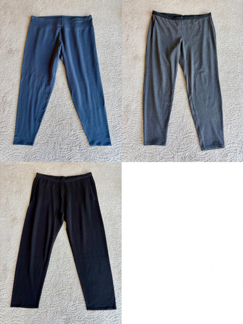 Trio of dark toned pants for fall days from Eileen Fisher. All measure 20" side to side at waist. Deep navy blue knitted pants have yoga type yoke/waistband and tapered legs - very close to a legging. Tencel Lyocell/organic cotton/spandex blend. Size tag says 2X. Gray and black herringbone pants are slim cut with no detail except black elastic waistband and back darts along with tapered leg. Perfect for under a flowing top when a slim bottom is needed. Polyester/recycled polyester/spandex blend. Size tag says XL. Black sweater-weave pants have elasticated ribbed waistband with drawstring, in-seam side pockets, and ribbed hem. Legs are fairly straight. New with tag. 100% fine merino wool. Size tag says XL.