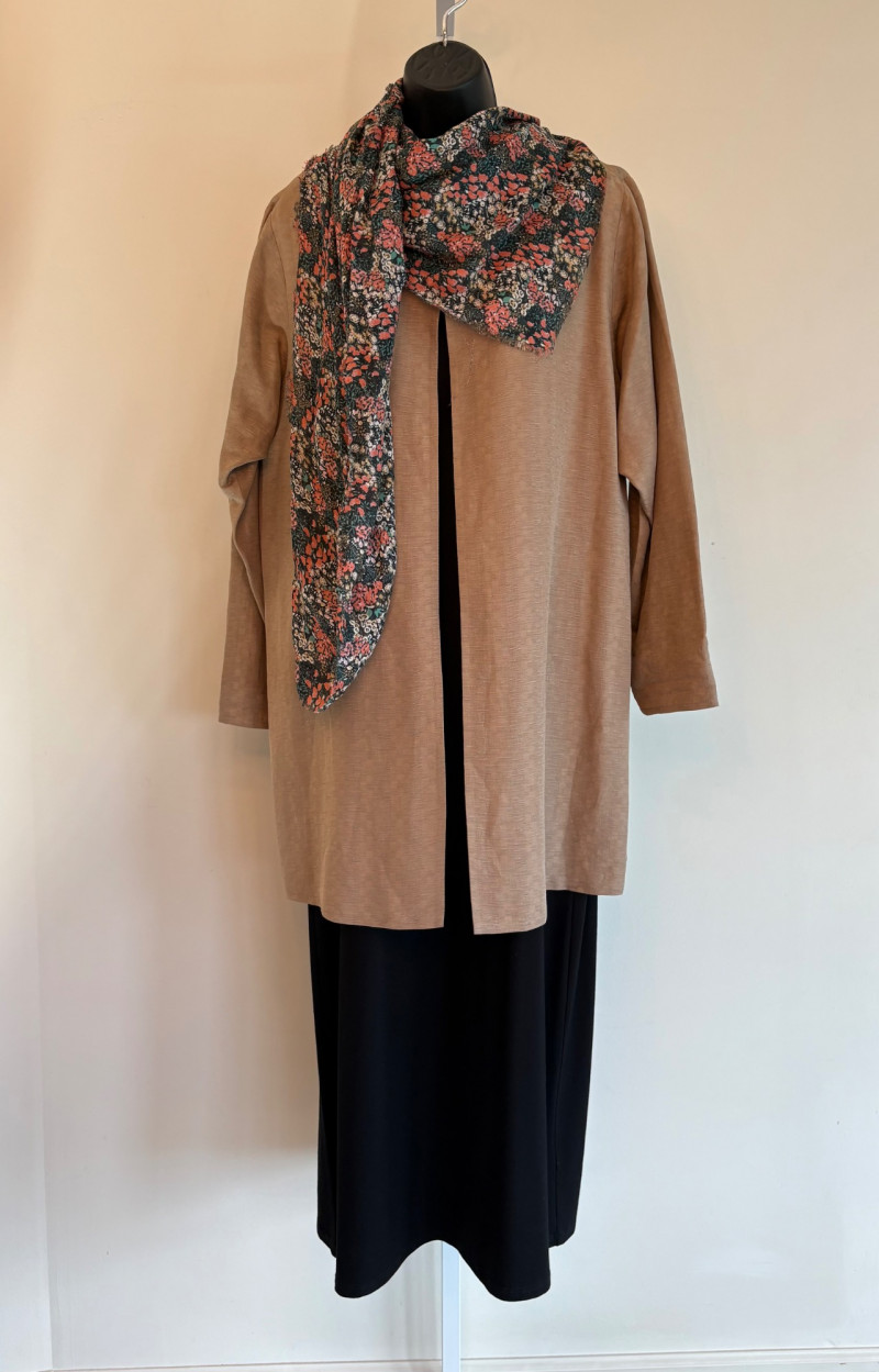 Classic duo from Eileen Fisher with scarf from Garnet Hill. Full-length black sleeveless dress is one of those basics everyone should have to dress up or down. This one has has round neckline, straight cut, and a lot of body/heft in the stretch knit. Viscose/spandex blend. Measures 21" pit to pit and 50" from shoulder to bottom hem. Size tag says XL. Collarless taupe jacket has round neckline, open front, textured weave, and self-faced front panels along with a magnetic closure at the collar. Fabric tag is missing. Measures 21" pit to pit and 33" from back neckline to bottom hem. Size tag says 2X and while it is generous, it doesn't seem to be quite this big... Paired with soft floral scarf from Garnet Hill in coordinating colors. Measures approximately 50" x 54". Modal/cashmere blend.