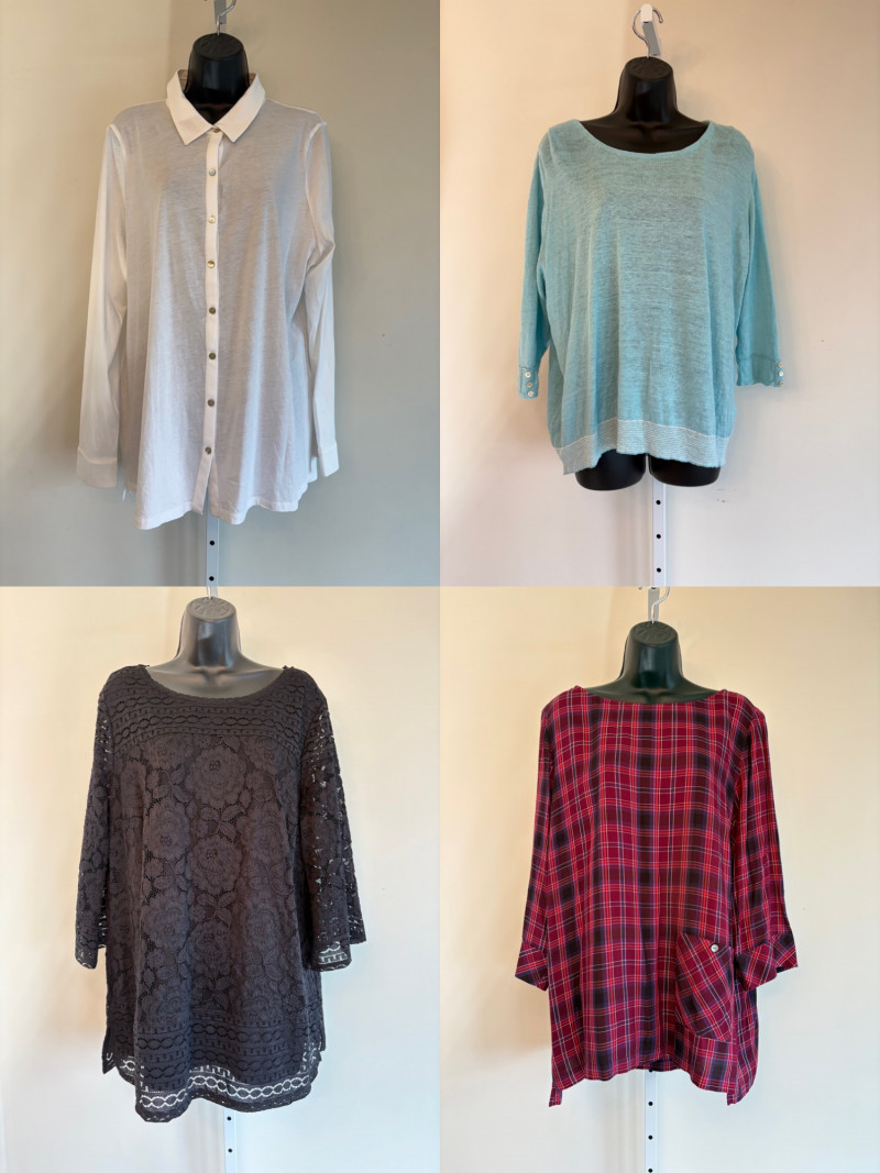 This is a real variety lot, but all pieces measure between 23" - 23.5" pit to pit. Black lace top from Isaac Mizrahi has 3/4 sleeves, yoke, solid stretch lining, and split hem. Nylon/spandex blend. Size tag says 1X. Intense blue top from Poetry is has long sleeves with button detailing, ribbed waistline, and criss-cross back. 100% linen. Size tag says says 18, but it looks a bit smaller to us. Note that we waffled on including this top - not only does the sizing appear to be off, but there are also several issues with small pulls in the fabric/loose threads - a sweater shaver might help but we aren't sure. We decided to put it in anyhow, but be warned that the quality here is definitely not up to the usual of the other items in this auction - see last 2 photos for most egregious examples. Soft smooth white knit shirt has collar, button front closure, back yoke with pleat, split hem with back lower than front, and long sleeves with button cuff. 100% organic cotton. Size tag says XL. Red plaid top from J. Jill has 3/4 banded sleeves, back yoke with pleats, and front left patch pocket along with a split hem that is lower in back than front. 100% rayon. Size tag says XL.