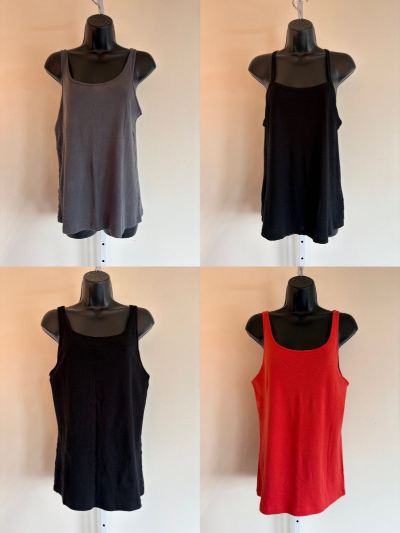 4 tanks from Eileen Fisher on the small side for this auction - all measure 17" pit to pit (unstretched, of course) Grey tank is 100% organic cotton. Size tag says L. Black butterfly back tank is Tencel/Spandex blend. Size tag says L. Shows small pilling overall - a quick date with a sweater shaver will make it look great again, although it is certainly wearable as is. Black tank is 100% organic cotton. Size tag says XL. Red tank is 100% organic cotton. Size tag says XL.