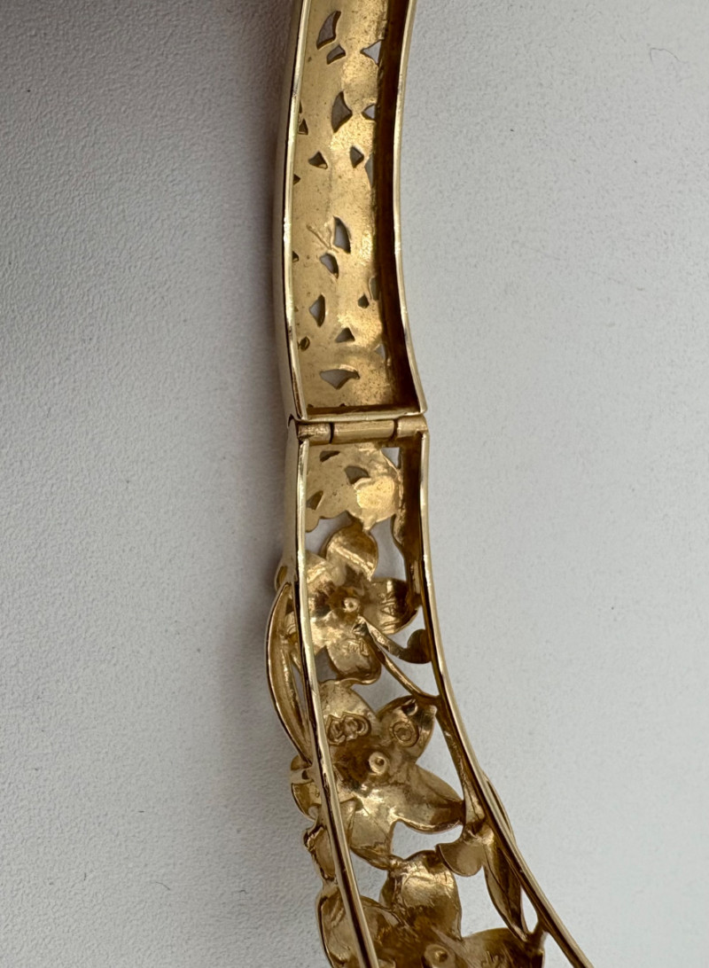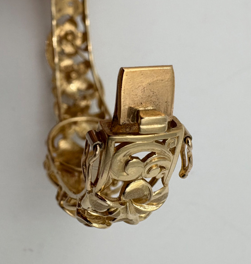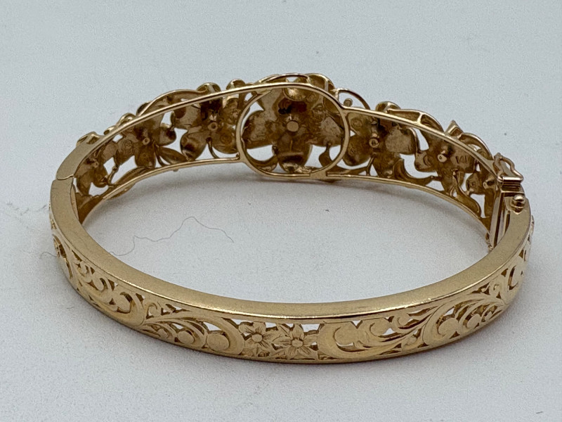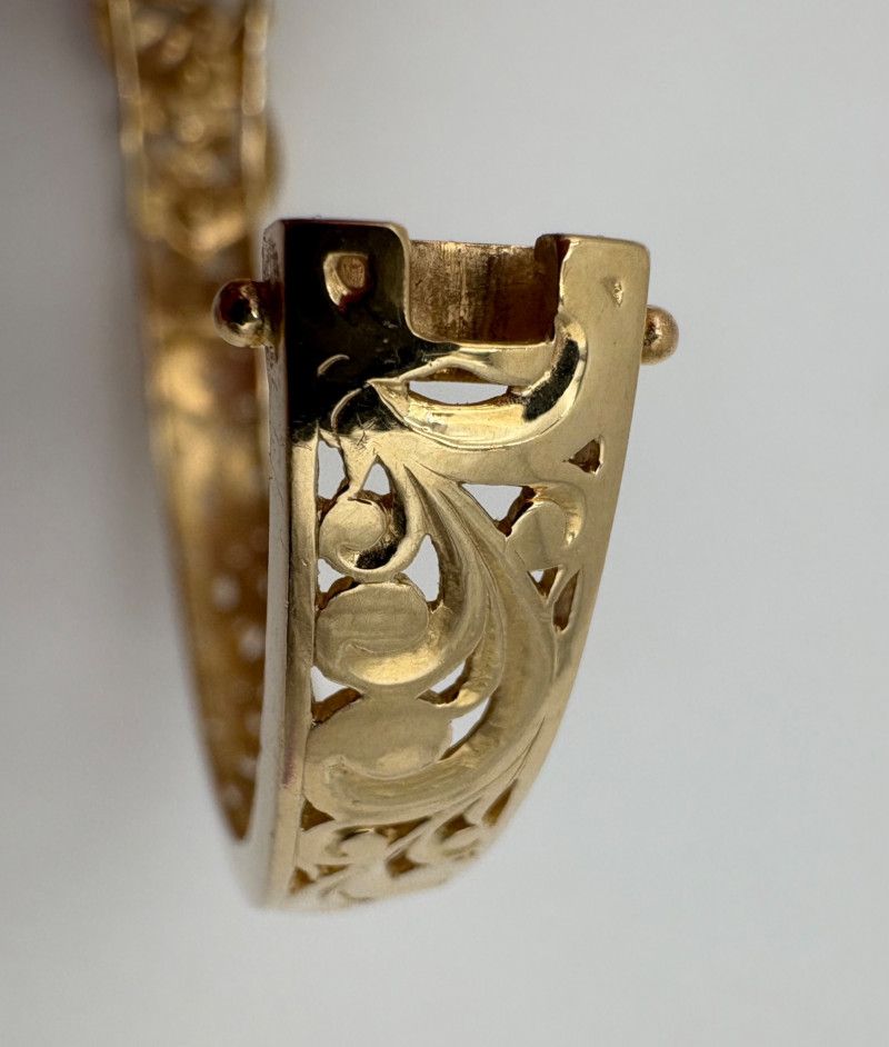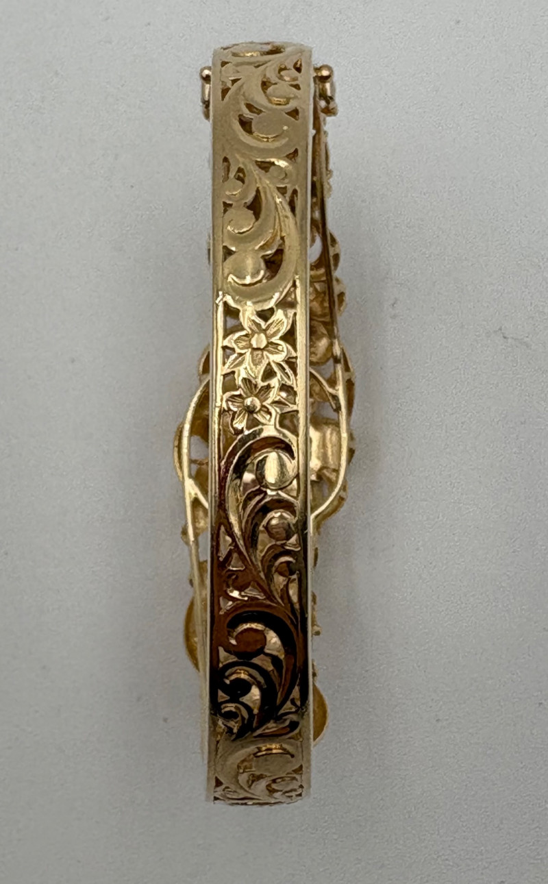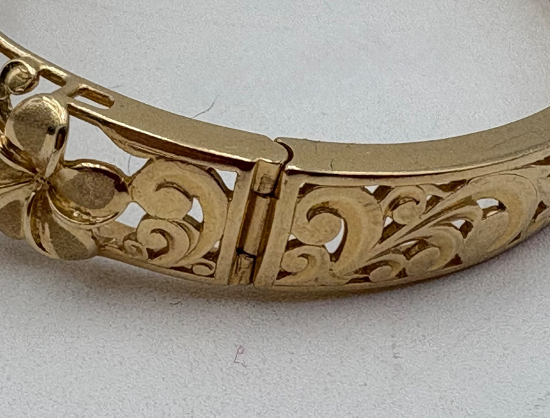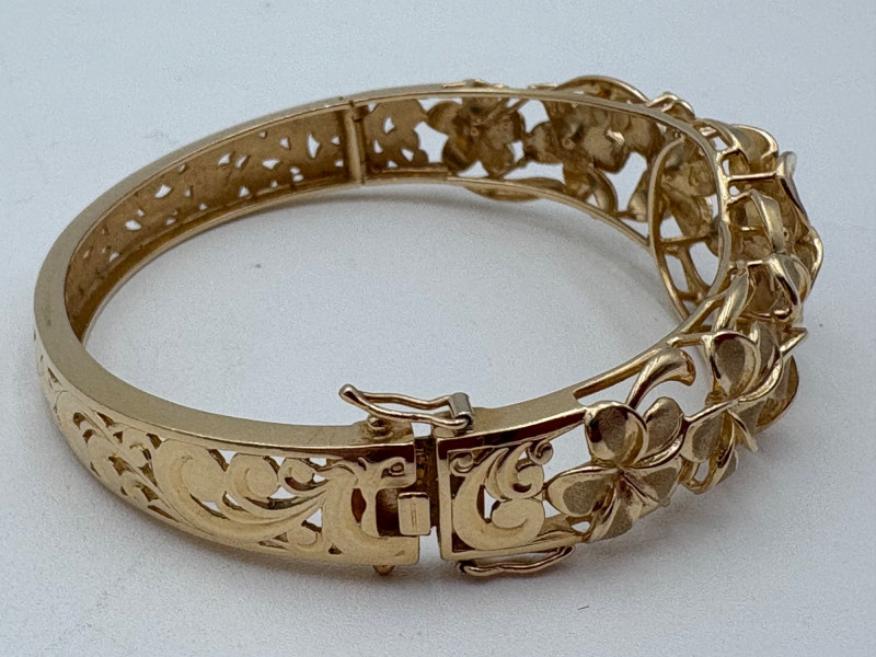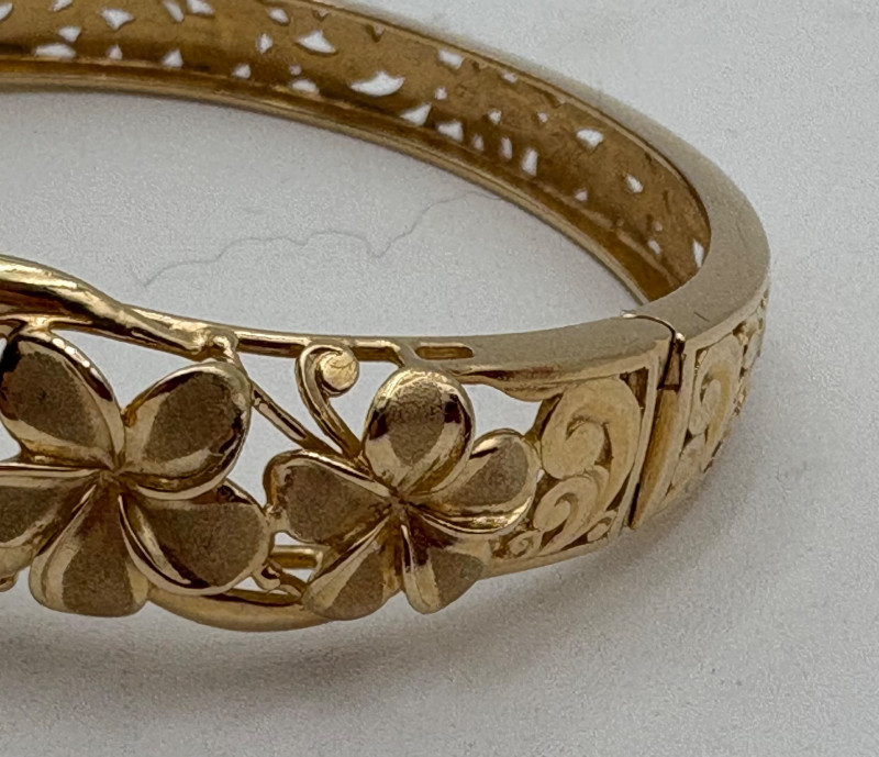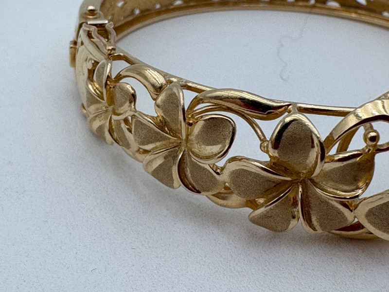 This exquisite bracelet is 14K gold with 7 plumeria blossoms across the front mounted on delicate wire framing/filigree. The bracelet is hinged with a safety clasp and the back of the bracelet is a floral motif with swirls and cutouts. Delicate without being fussy, this piece could be worn for an evening affair with a little black dress or with a t-shirt for a day out. Truly versatile and well-made. Marked "14K" and copyrighted with a double heart logo - we are unsure of the maker, but assume it is one of the higher end Hawaiian makers and is similar to the jewelry sold by Na Hoku or The Honolulu Jewelry Company given the quality, irregular spacing of the blossoms, and workmanship. Measures 2.25" across interior of bracelet, .75" at widest part of band, and weighs 23 grams.