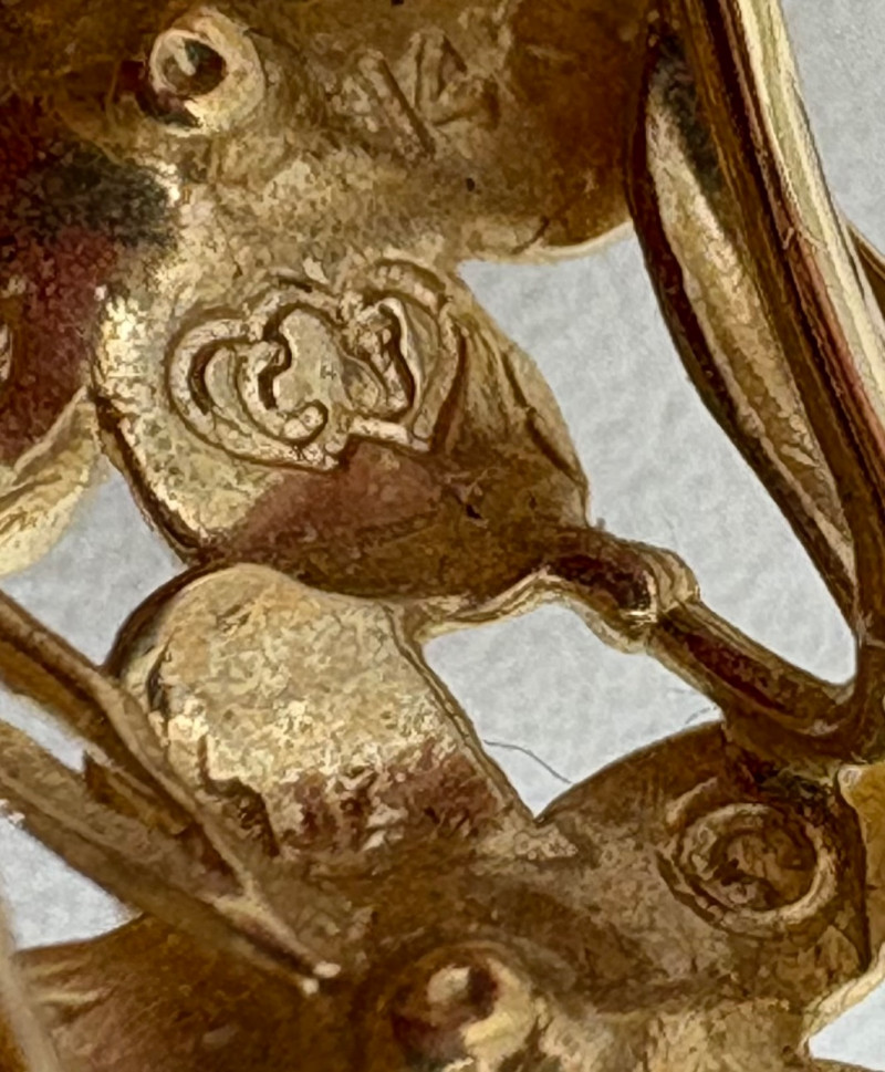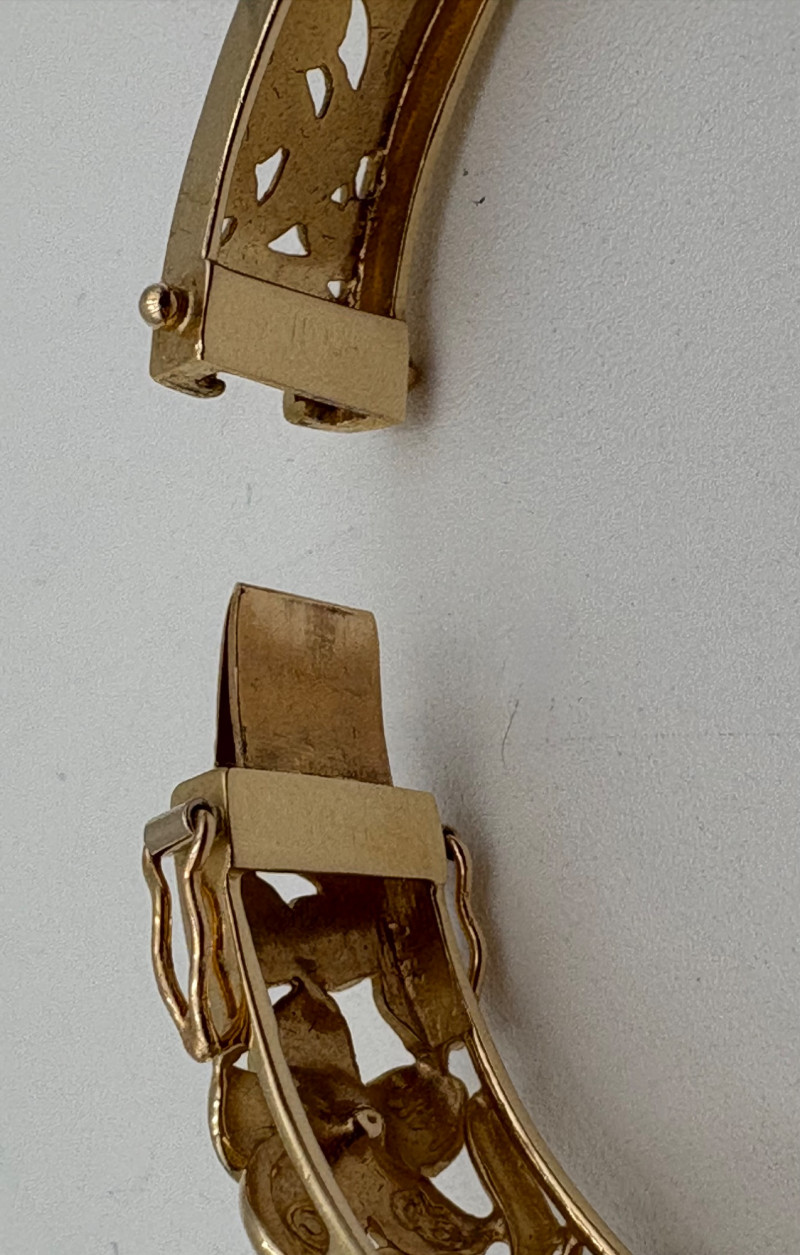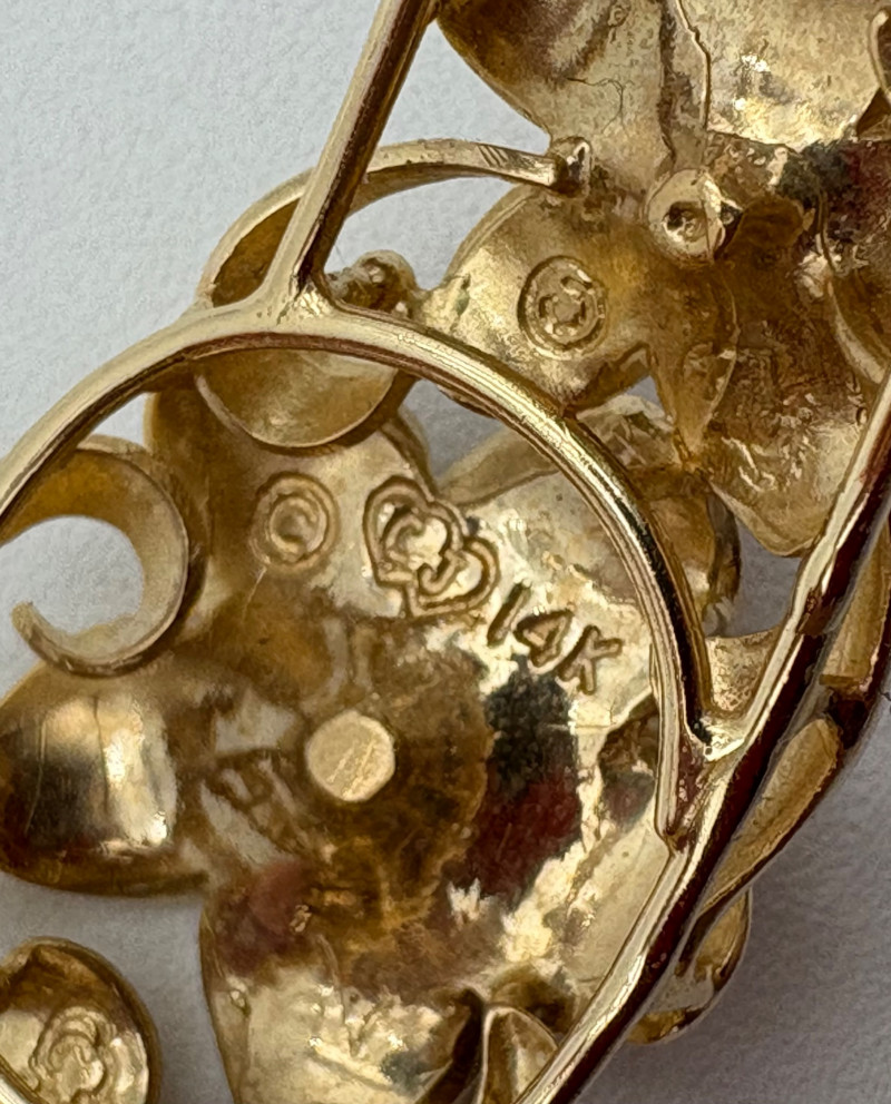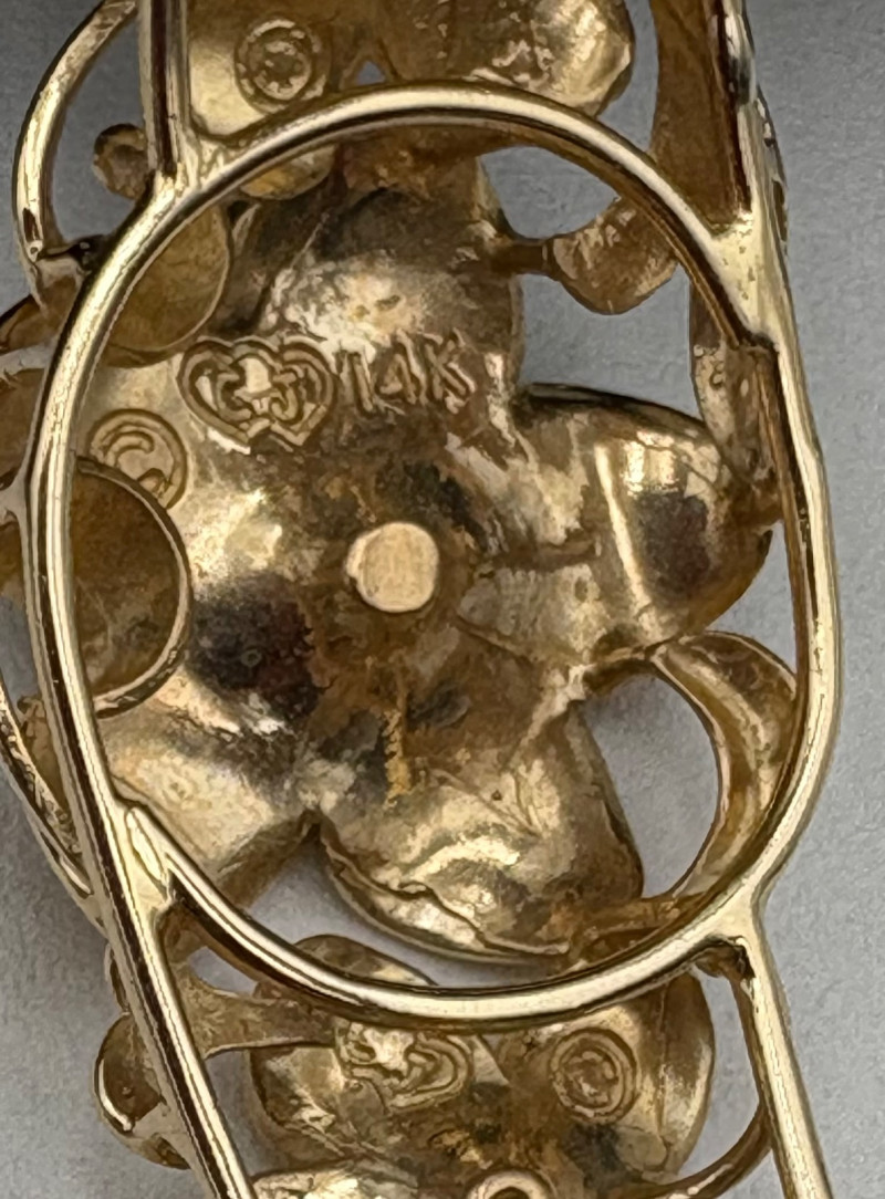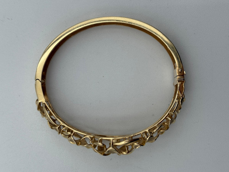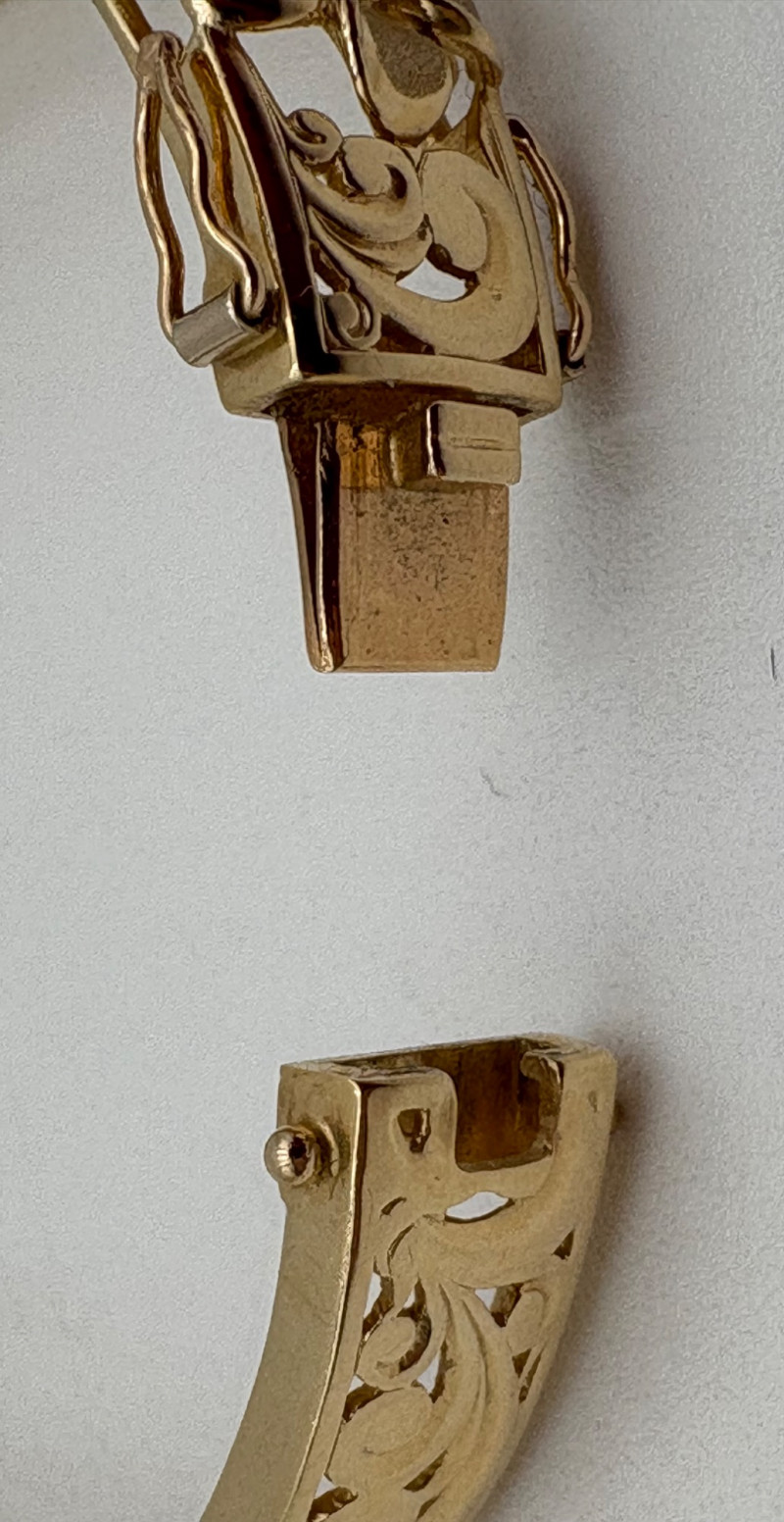 This exquisite bracelet is 14K gold with 7 plumeria blossoms across the front mounted on delicate wire framing/filigree. The bracelet is hinged with a safety clasp and the back of the bracelet is a floral motif with swirls and cutouts. Delicate without being fussy, this piece could be worn for an evening affair with a little black dress or with a t-shirt for a day out. Truly versatile and well-made. Marked "14K" and copyrighted with a double heart logo - we are unsure of the maker, but assume it is one of the higher end Hawaiian makers and is similar to the jewelry sold by Na Hoku or The Honolulu Jewelry Company given the quality, irregular spacing of the blossoms, and workmanship. Measures 2.25" across interior of bracelet, .75" at widest part of band, and weighs 23 grams.