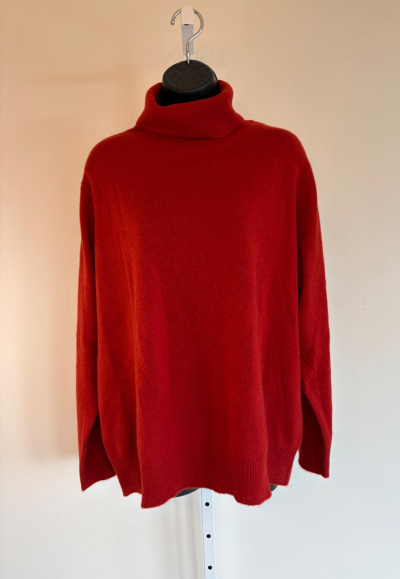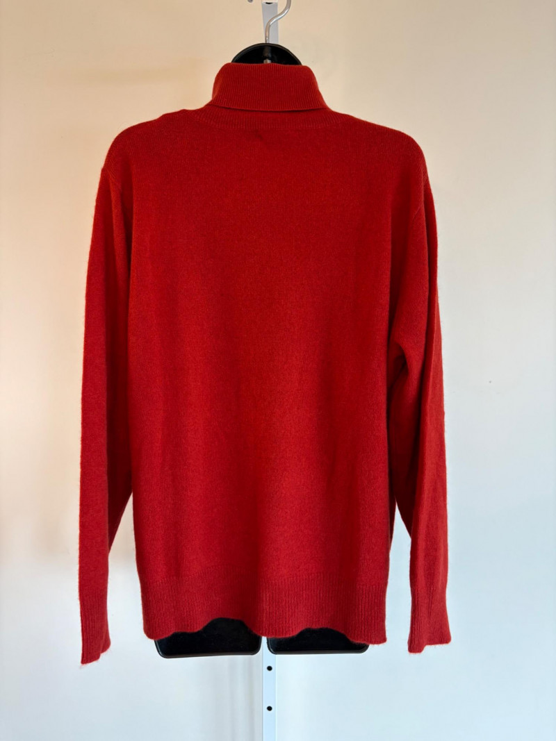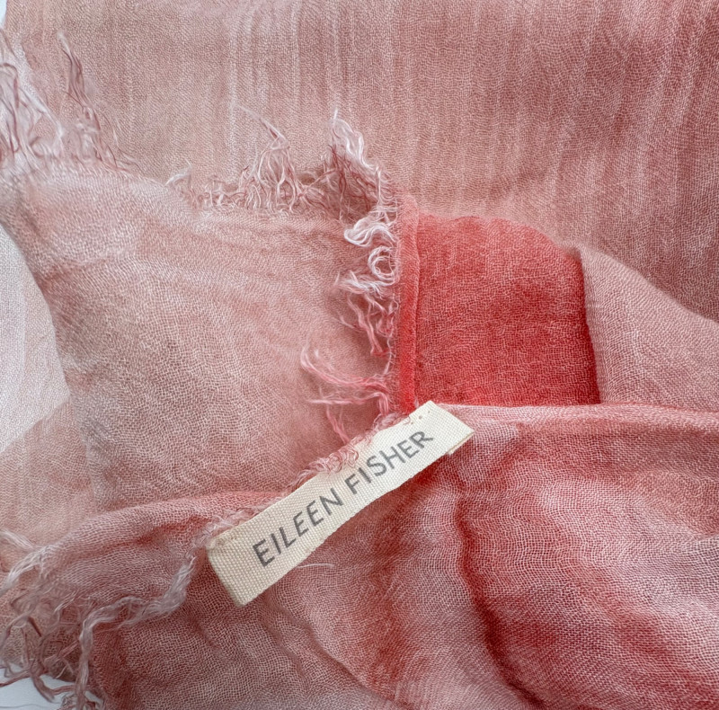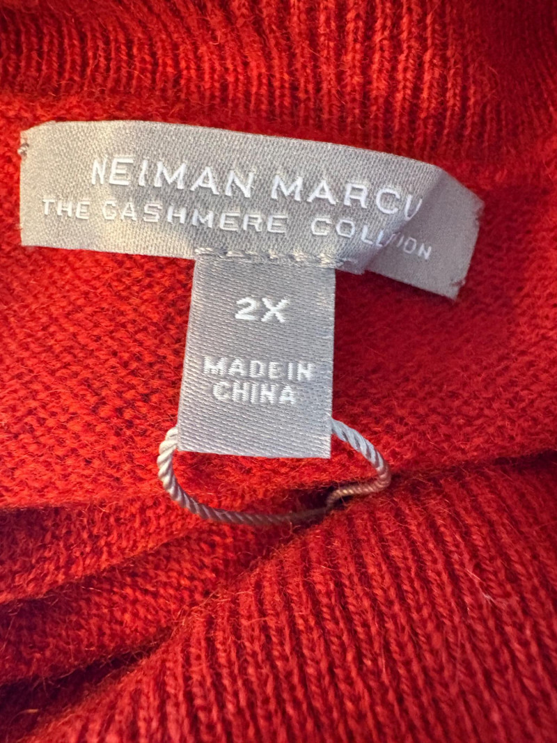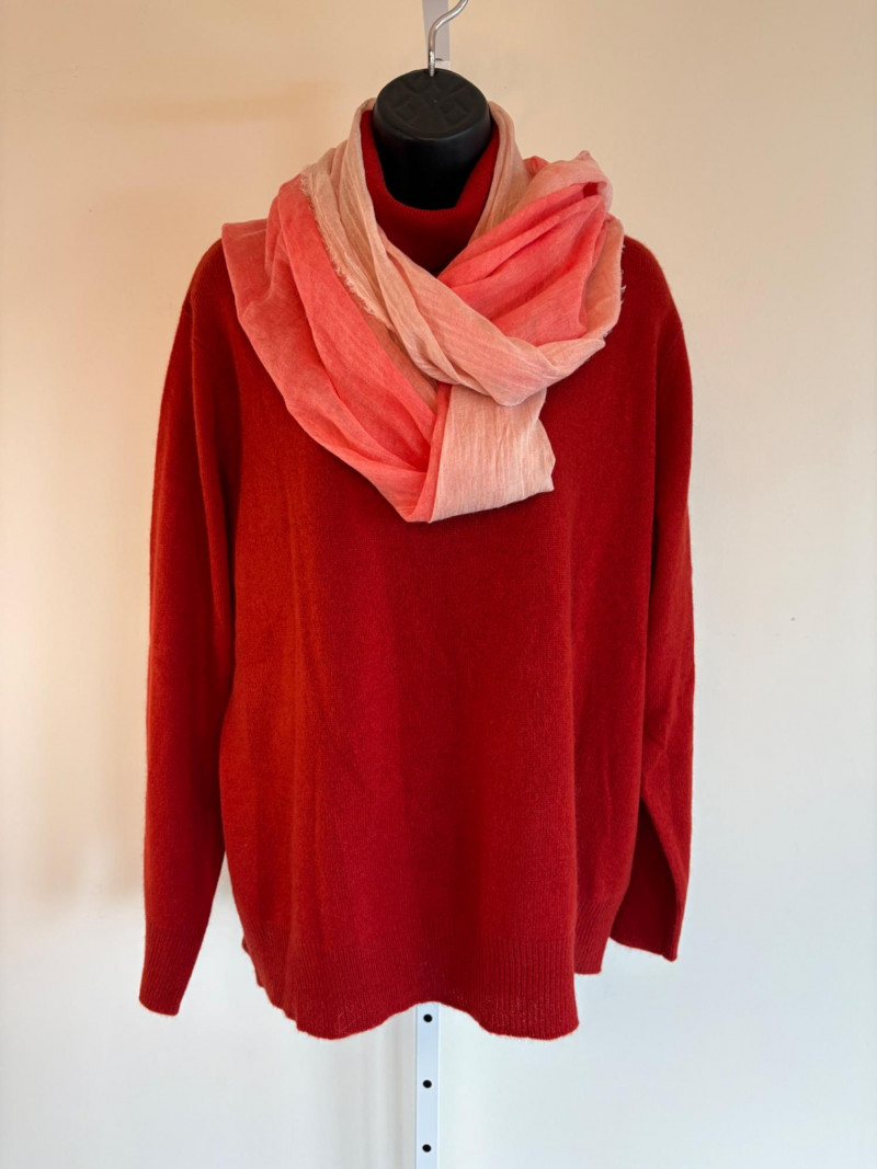 Wonderful, orange/red cashmere sweater from Neiman Marcus + scarf. New with tag. Super soft sweater has long sleeves, ribbed turtleneck, and ribbing at cuffs & bottom hem. 100% cashmere. Measures 24" pit to pit. Size tag says 2X. Paired with Eileen Fisher ombre scarf, which moves from cream to deep orange/puce. Measures approximately 78“ x 30“. No fabric tag, but appears to be hand-died in a natural fiber.