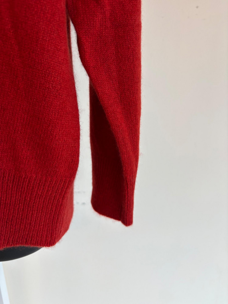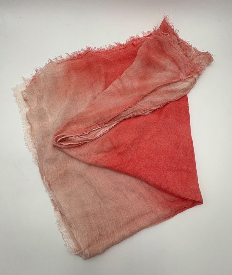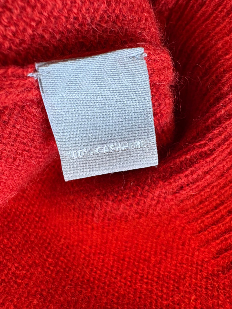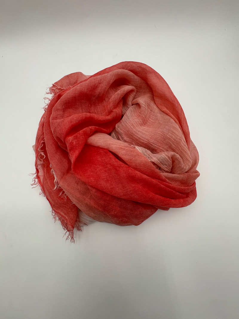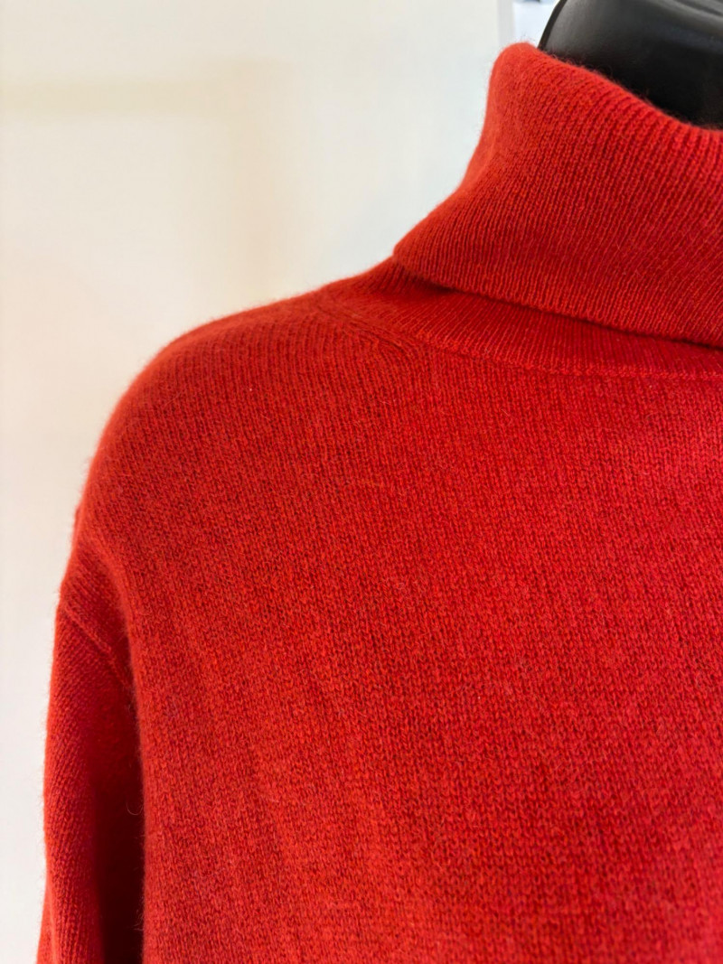 Wonderful, orange/red cashmere sweater from Neiman Marcus + scarf. New with tag. Super soft sweater has long sleeves, ribbed turtleneck, and ribbing at cuffs & bottom hem. 100% cashmere. Measures 24" pit to pit. Size tag says 2X. Paired with Eileen Fisher ombre scarf, which moves from cream to deep orange/puce. Measures approximately 78“ x 30“. No fabric tag, but appears to be hand-died in a natural fiber.