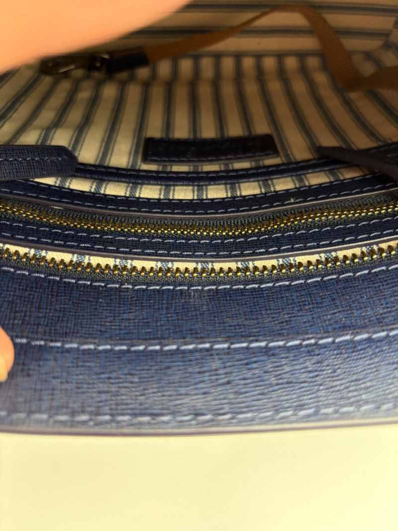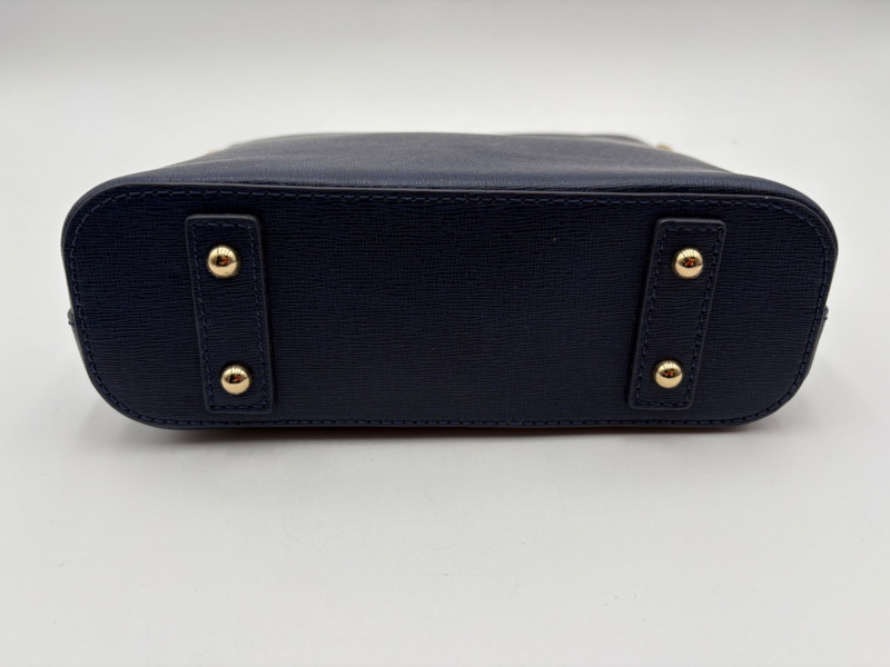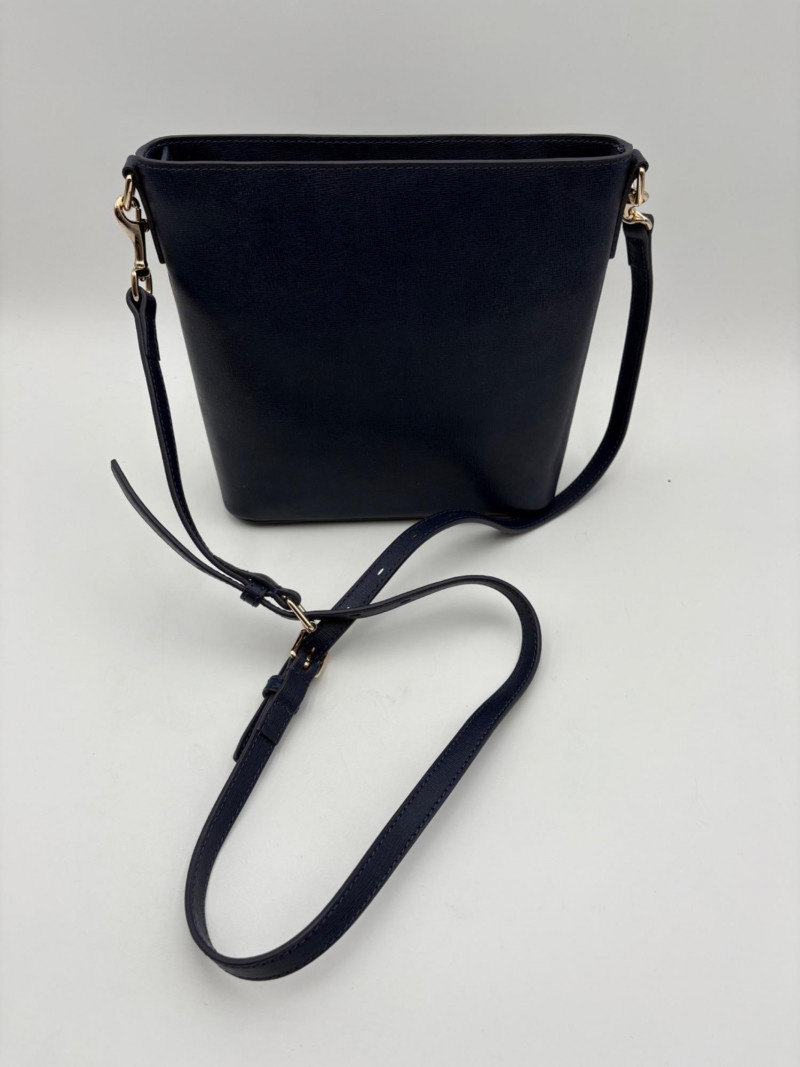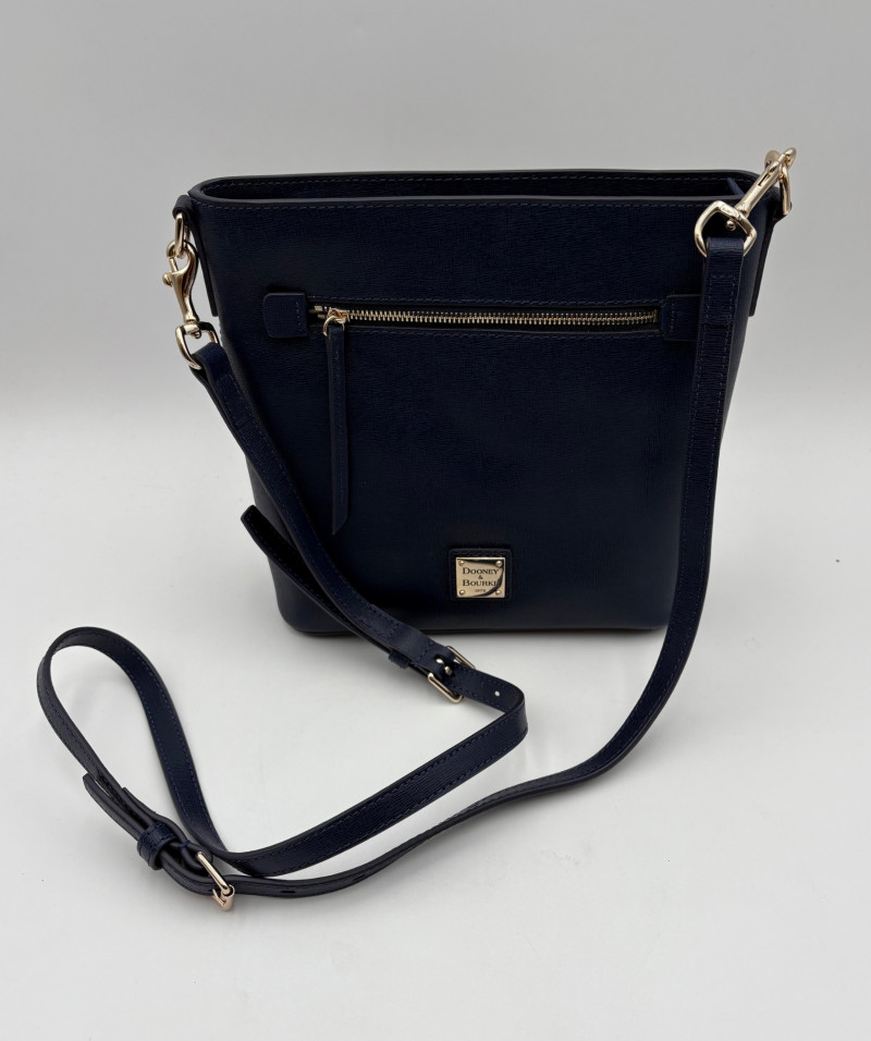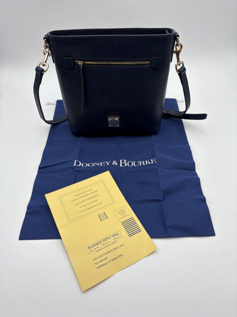 Lovely navy blue leather purse small enough to not get in the way, but large enough to carry everything you need. Subtle understated design with gold highlights. New with with registry card, but no tag. Purse has exterior zip pocket, top zip closure, D&B logo plate, adjustable swivel shoulder strap, bottom feet, interior ticking lining, interior zip pocket, attached key fob, and registration card. Comes with dust bag. Measures 9" H x 9" W with a 25" drop from shoulder strap to top of purse as photographed.