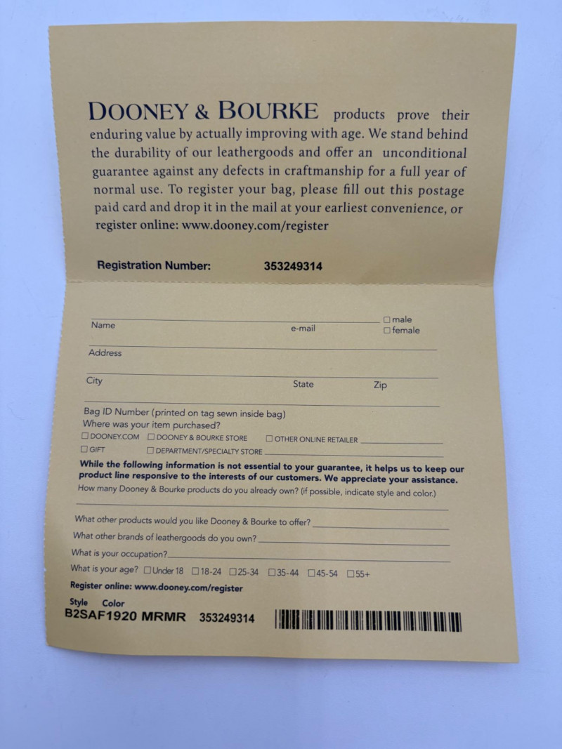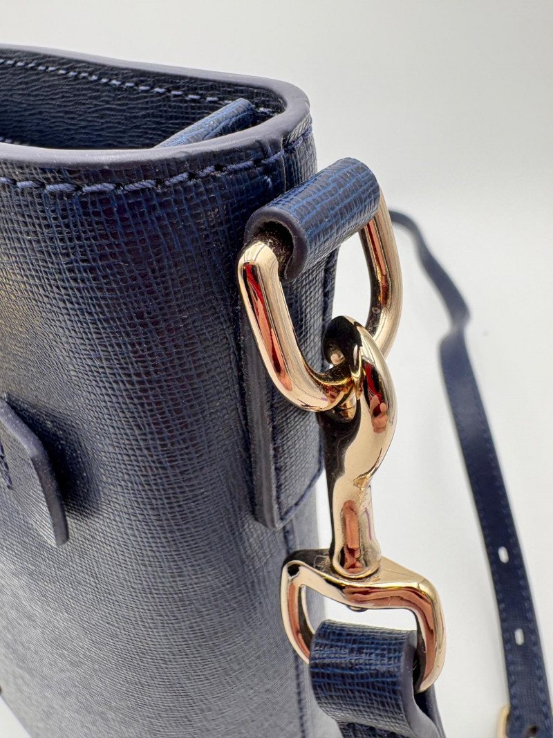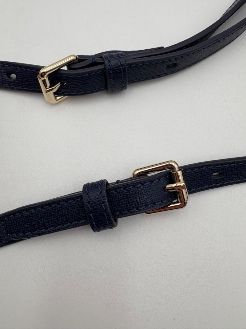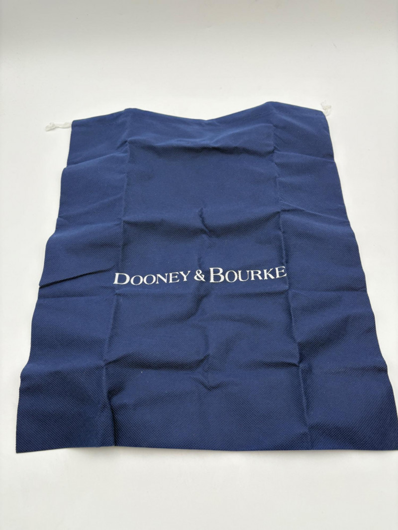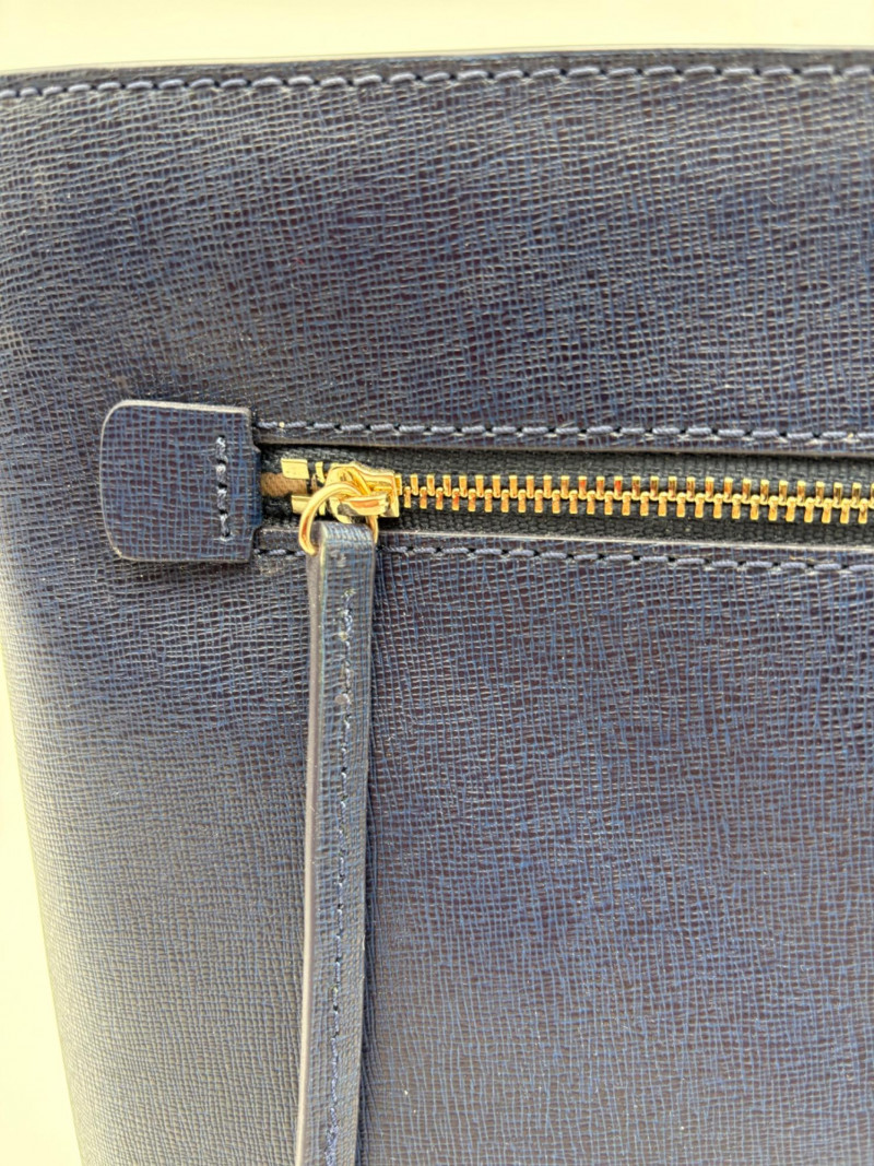 Lovely navy blue leather purse small enough to not get in the way, but large enough to carry everything you need. Subtle understated design with gold highlights. New with with registry card, but no tag. Purse has exterior zip pocket, top zip closure, D&B logo plate, adjustable swivel shoulder strap, bottom feet, interior ticking lining, interior zip pocket, attached key fob, and registration card. Comes with dust bag. Measures 9" H x 9" W with a 25" drop from shoulder strap to top of purse as photographed.