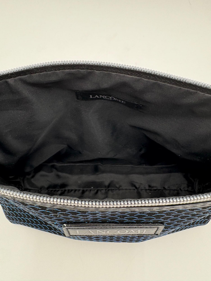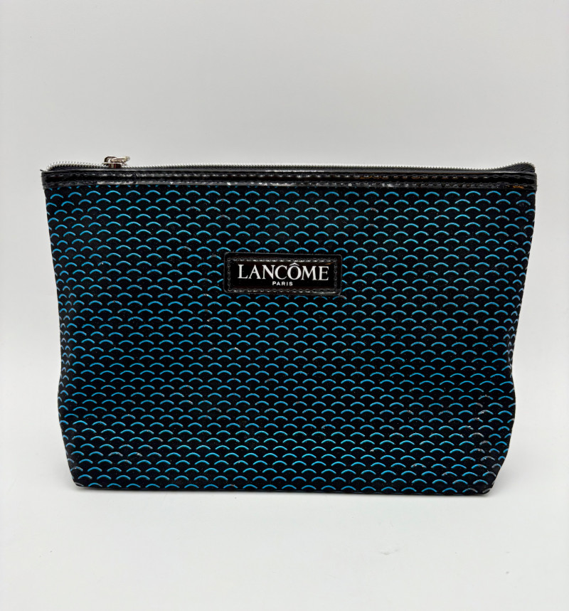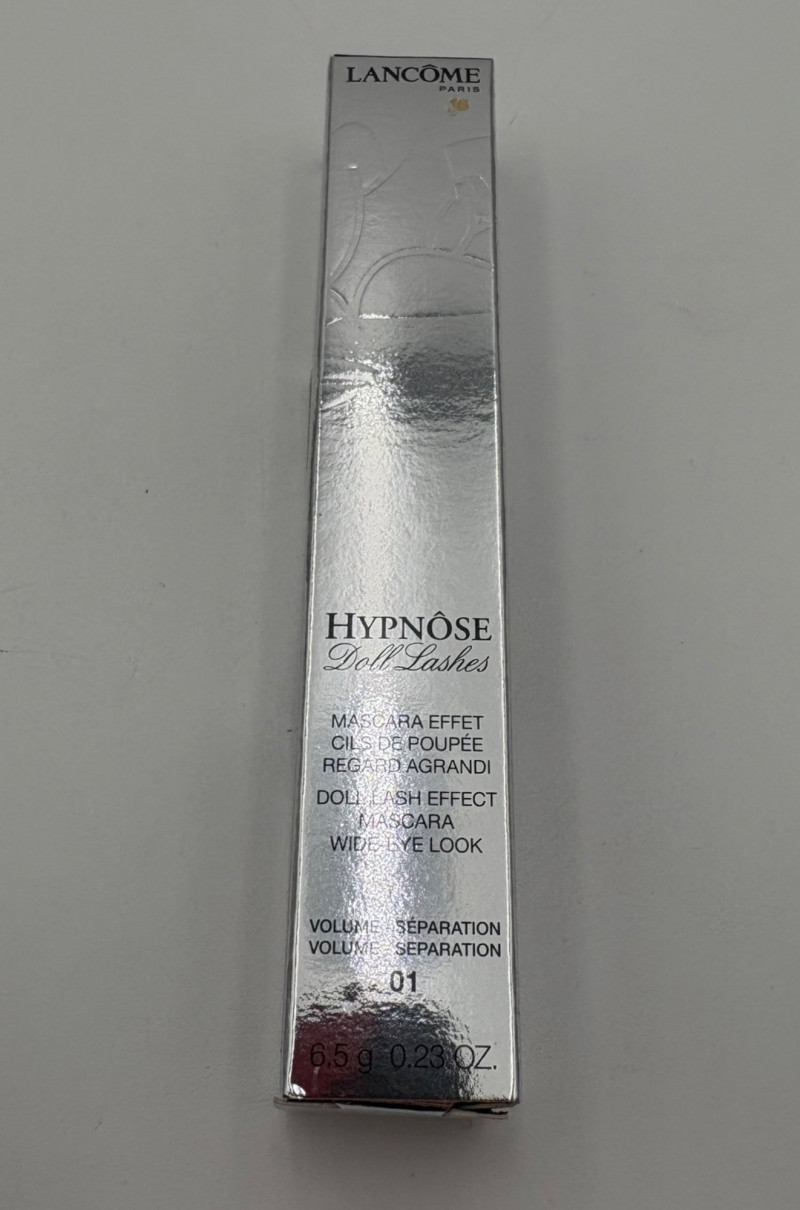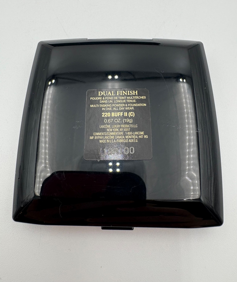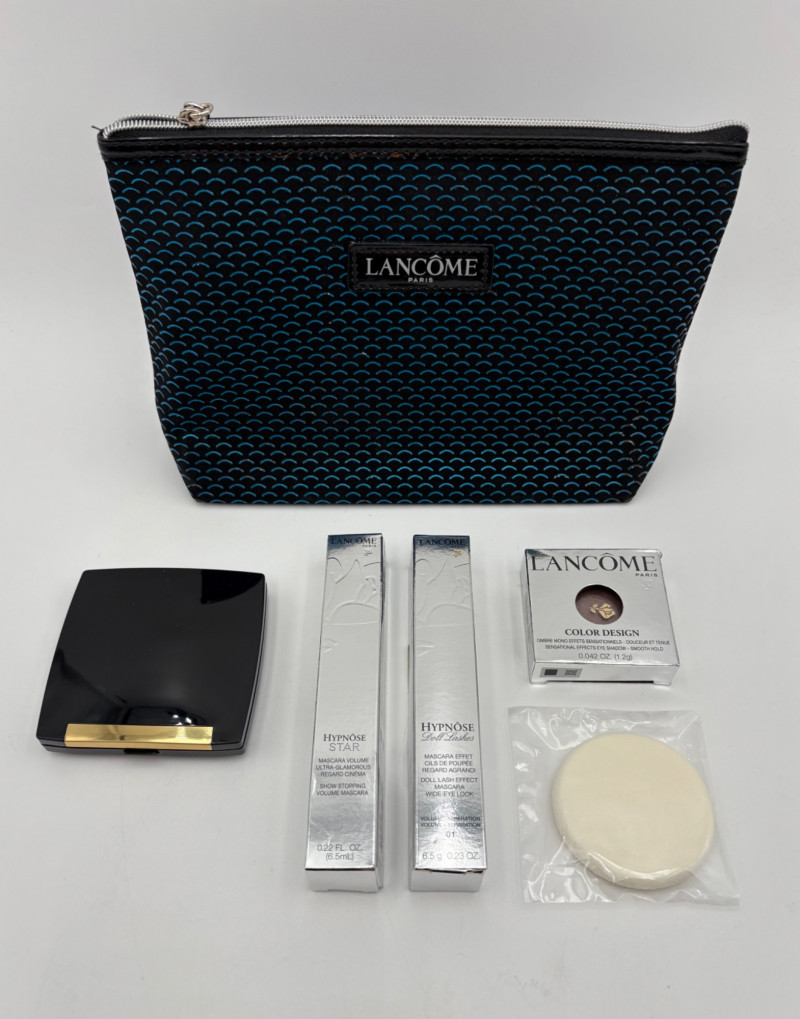 Lancome make-up products. All appear to be new to the best of our determination. - Lancome Hypnose Star Mascara - color #01 (noir midnight) - Lancome Hypnose Doll Lashes Mascara - color #01 (so black) - Lancome Dual Finish Multi-Taskng Powder & Foundation - color #220 (buff) + new application foam pad - Lancome Color Design Sensational Effects Eye Shadow compact - color # 308 (click shimmer) Lancome make-up bag in blue & black (not new).