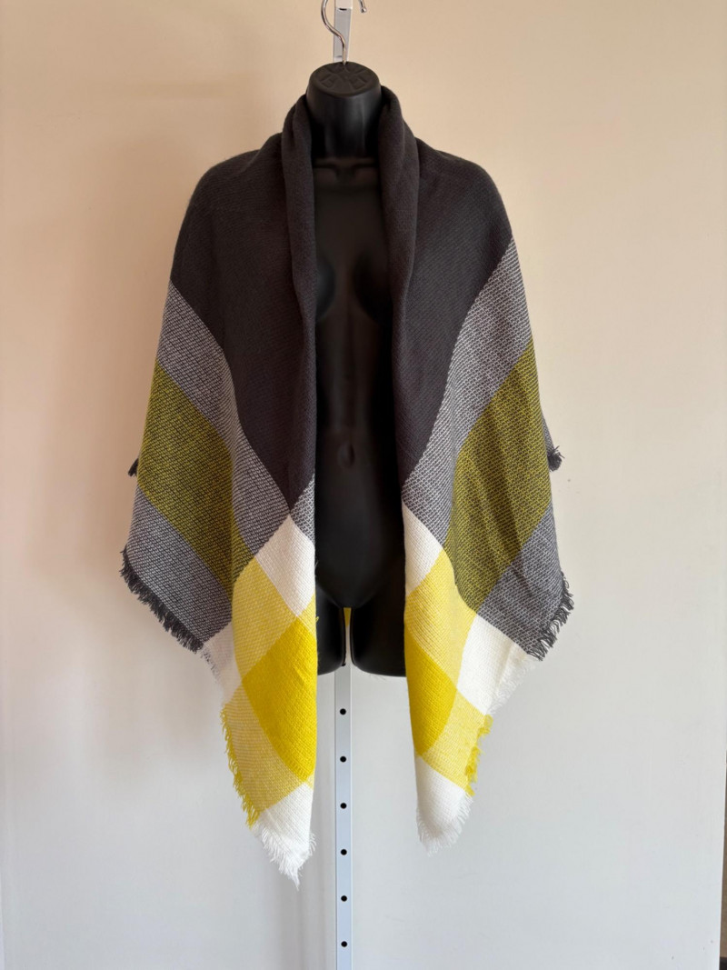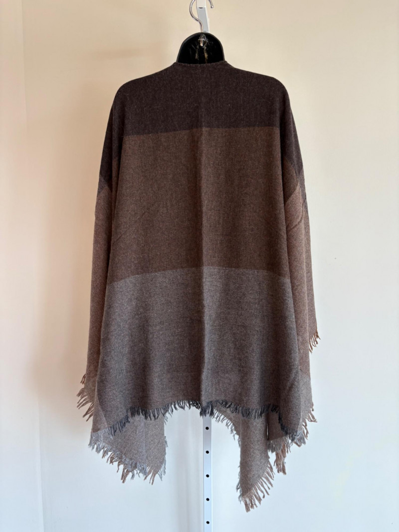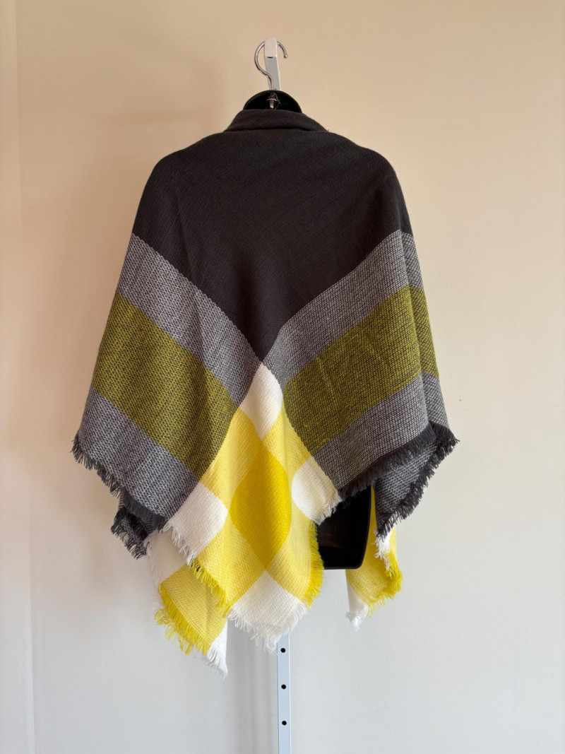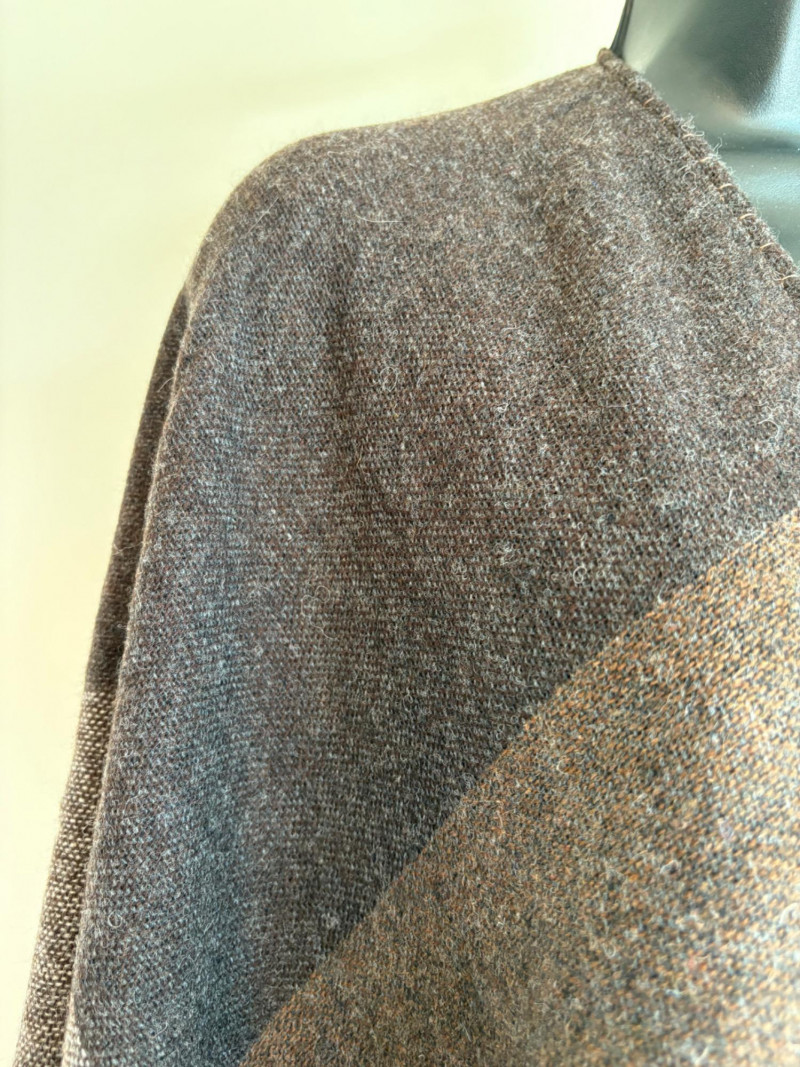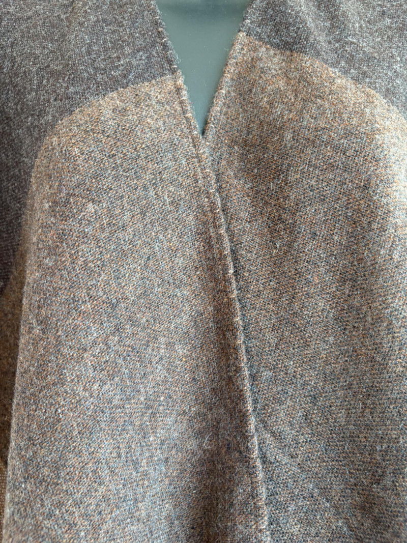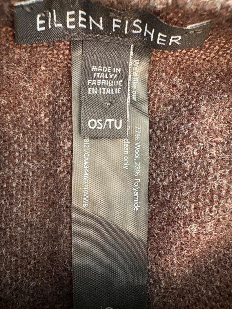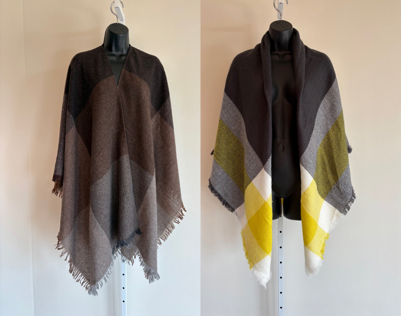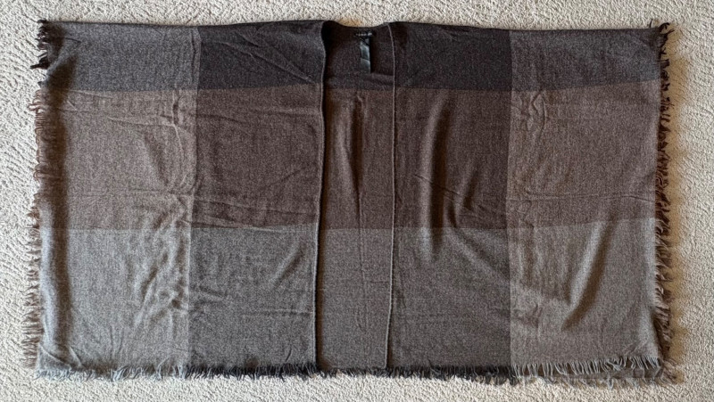 2 wintry wraps from Eileen Fisher & unknown maker. Brown, taupe ,and gray color-blocked wrap has open front and fringe on all sides. Wool/polyamide blend. Measures 84" (42" from shoulder to hem) x 50" across. Size tag says One Size.. Blue, white, and yellow plaid/blocked wrap is actually just an enlarged square measuring 52" x 56" with fringe on all sides. No maker or fabric tag, but feels like a natural soft fiber such as merino wool or a silk blend. Note the weave is loose on this, and there are a few pulls but they are not very noticeable.
