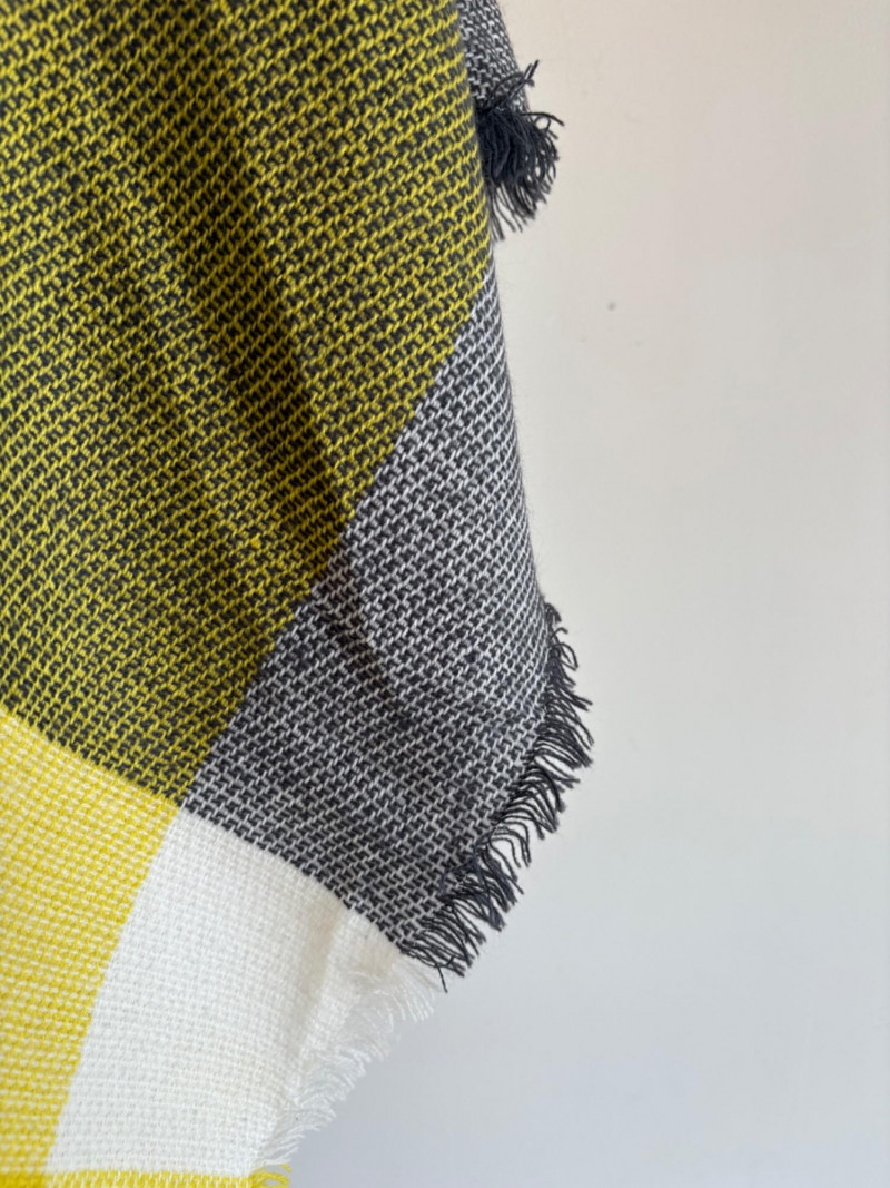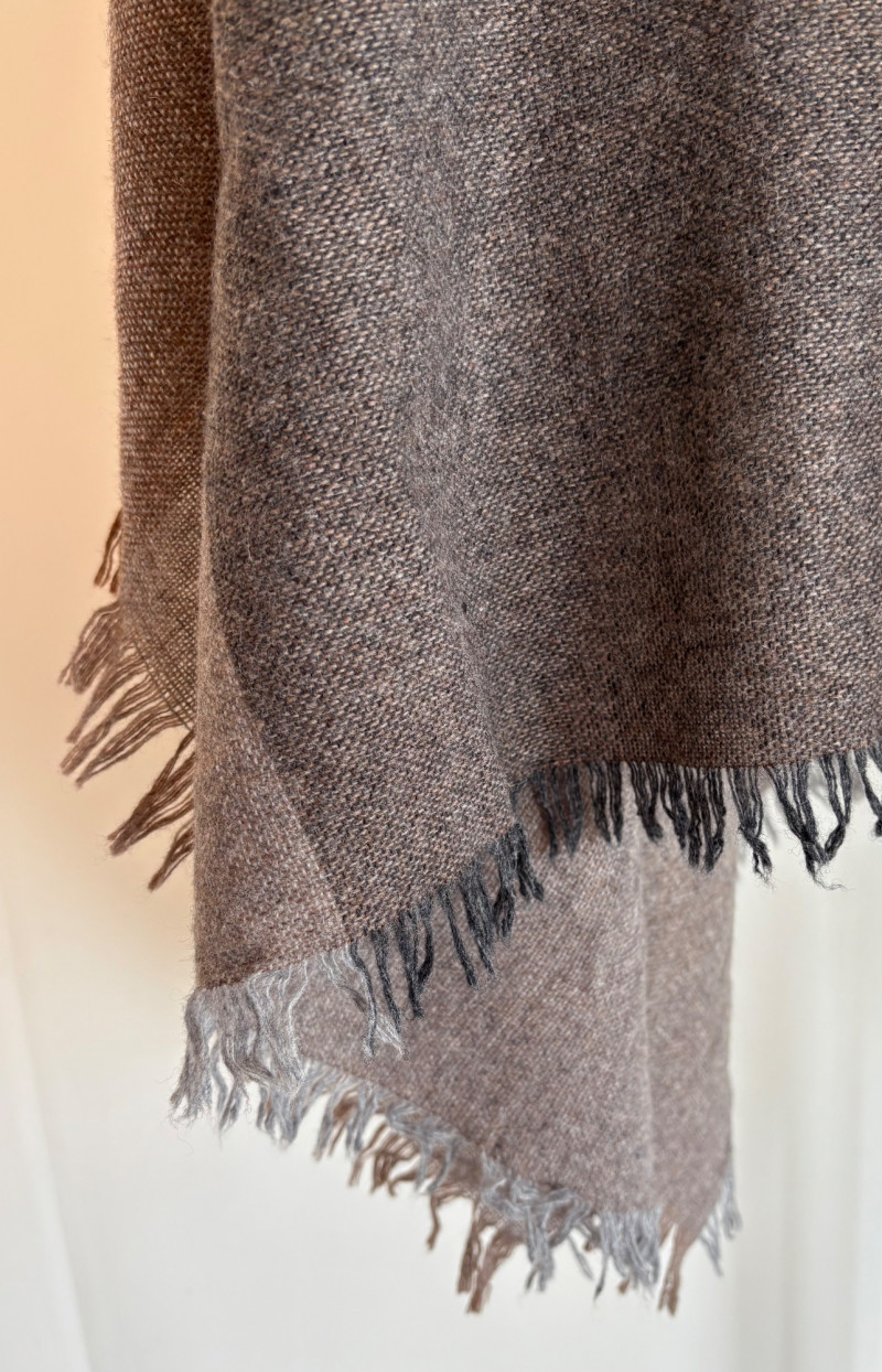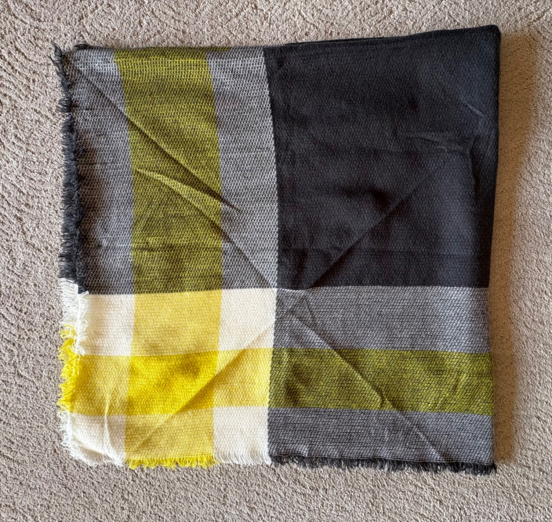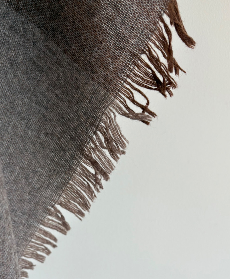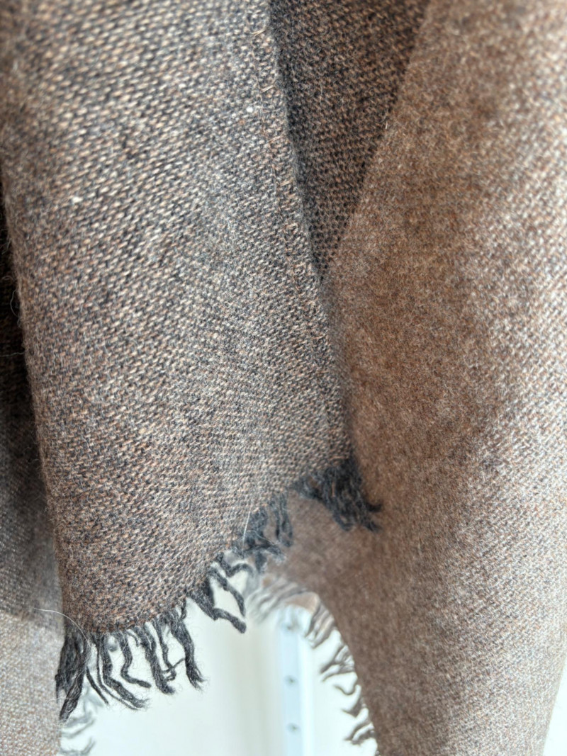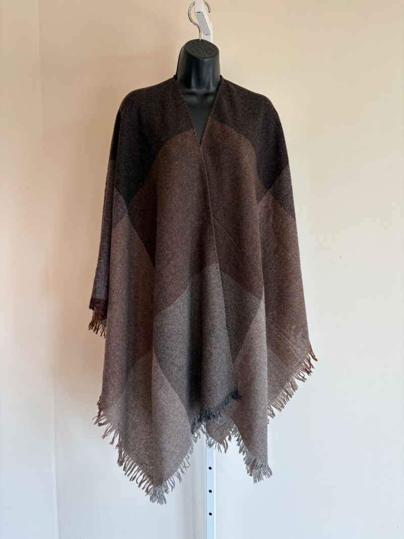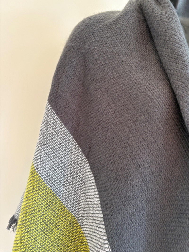 2 wintry wraps from Eileen Fisher & unknown maker. Brown, taupe ,and gray color-blocked wrap has open front and fringe on all sides. Wool/polyamide blend. Measures 84" (42" from shoulder to hem) x 50" across. Size tag says One Size.. Blue, white, and yellow plaid/blocked wrap is actually just an enlarged square measuring 52" x 56" with fringe on all sides. No maker or fabric tag, but feels like a natural soft fiber such as merino wool or a silk blend. Note the weave is loose on this, and there are a few pulls but they are not very noticeable.