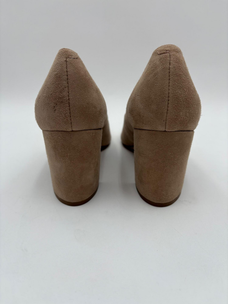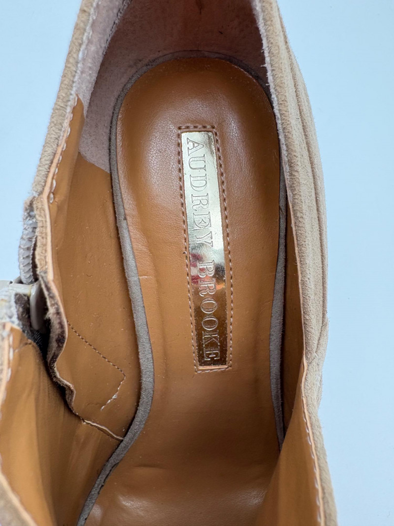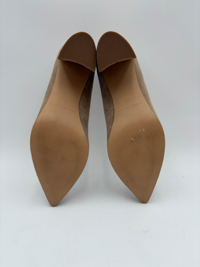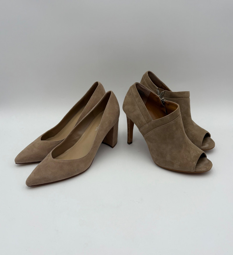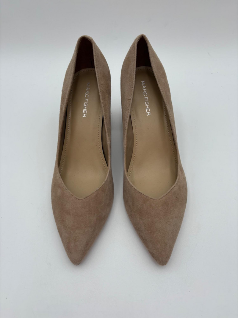 Marc Fisher beige classic seude pumps with chunky heel and pointed toe. Appear to be new. Size 7.5. Audrey Brooke beige spike heels with open toe, full vamp, and inside zip closure. Size 7.5.