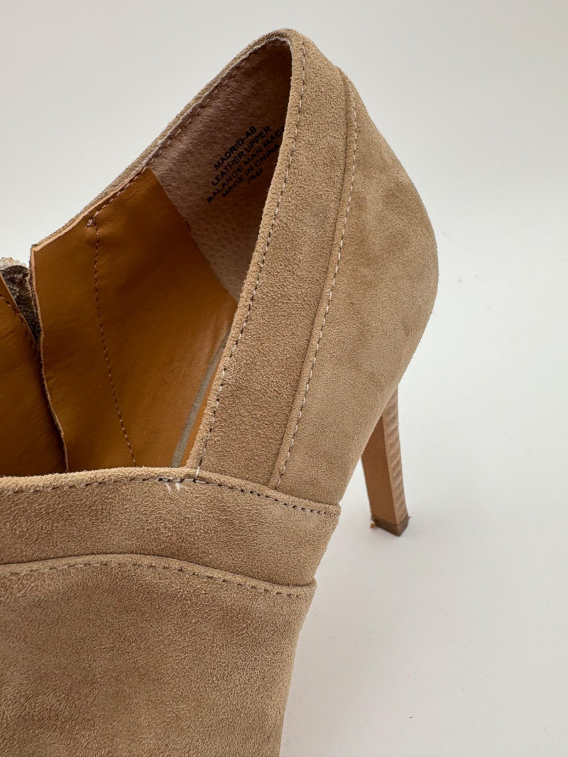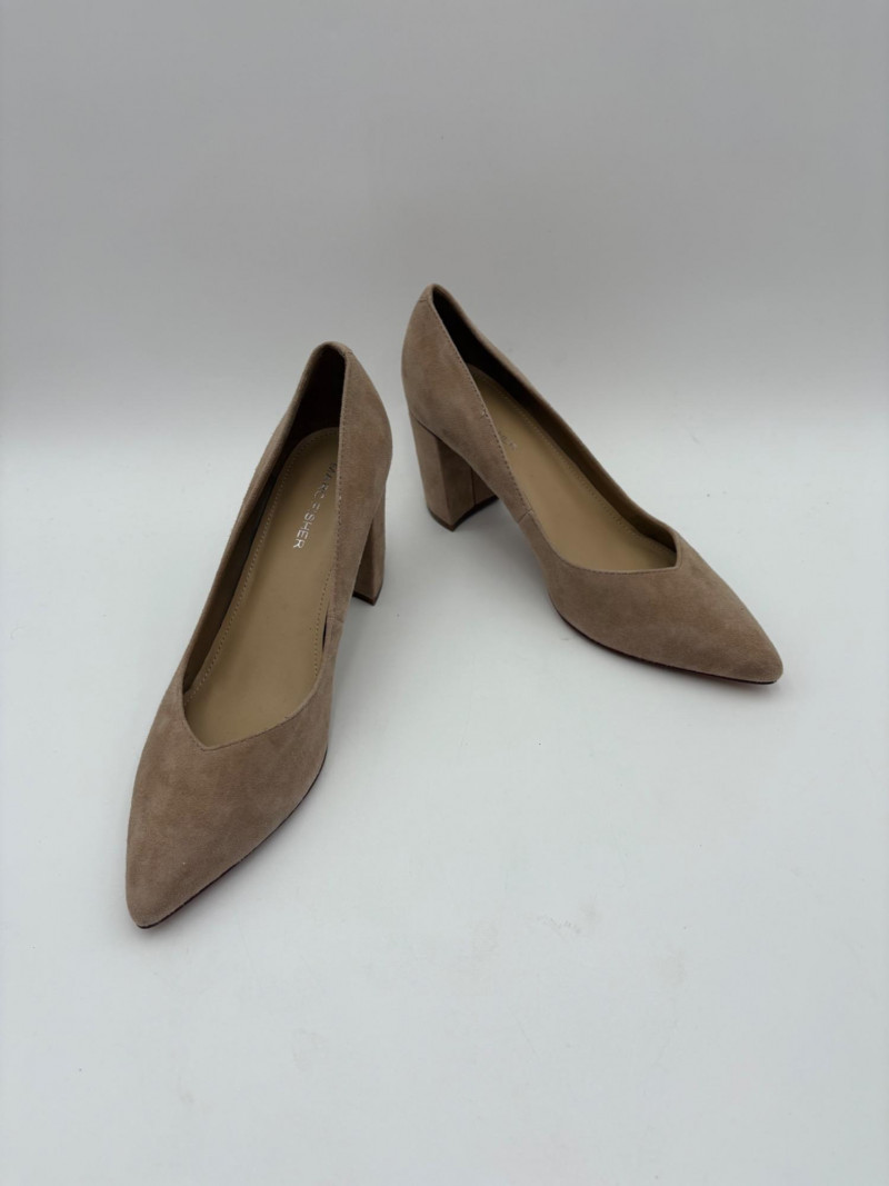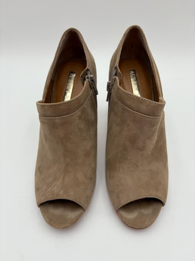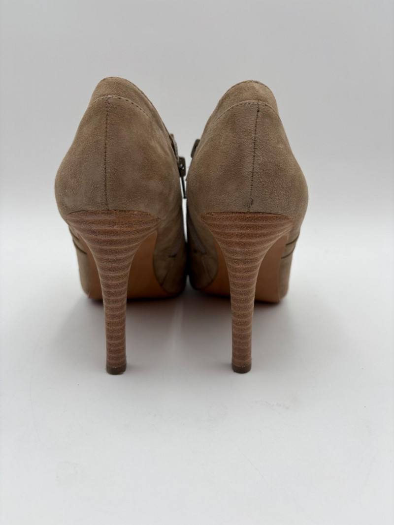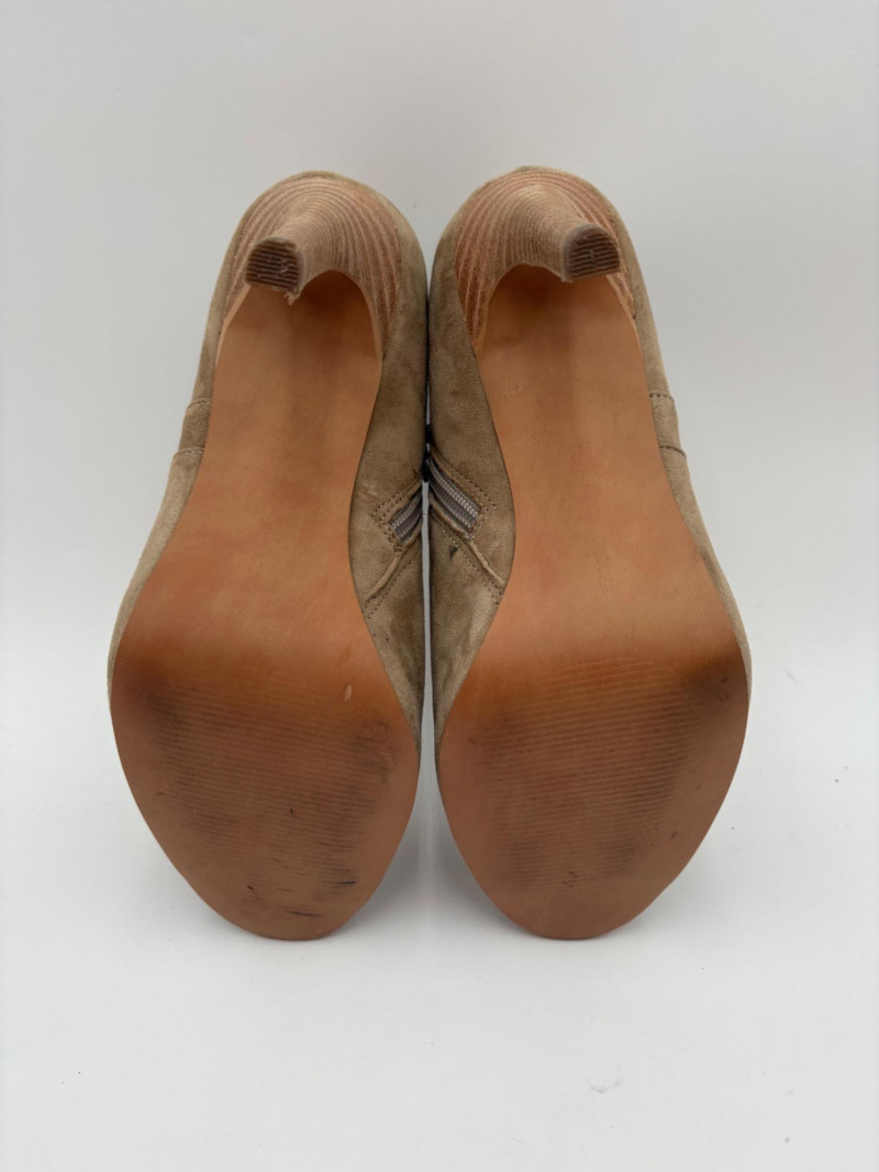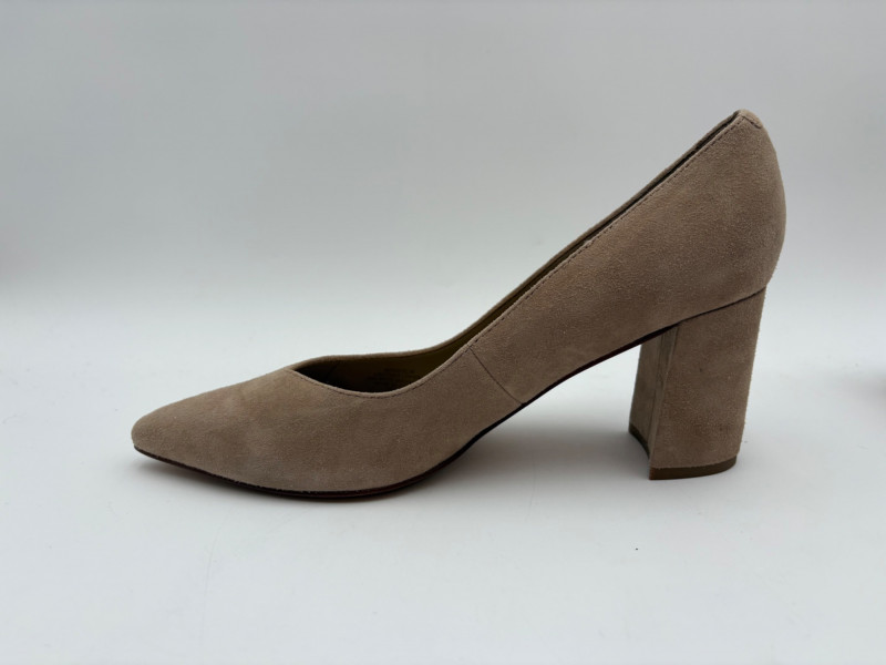 Marc Fisher beige classic seude pumps with chunky heel and pointed toe. Appear to be new. Size 7.5. Audrey Brooke beige spike heels with open toe, full vamp, and inside zip closure. Size 7.5.