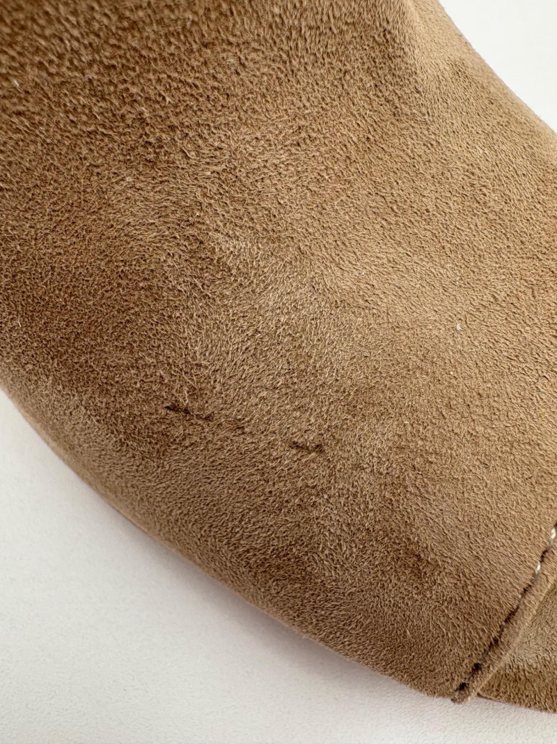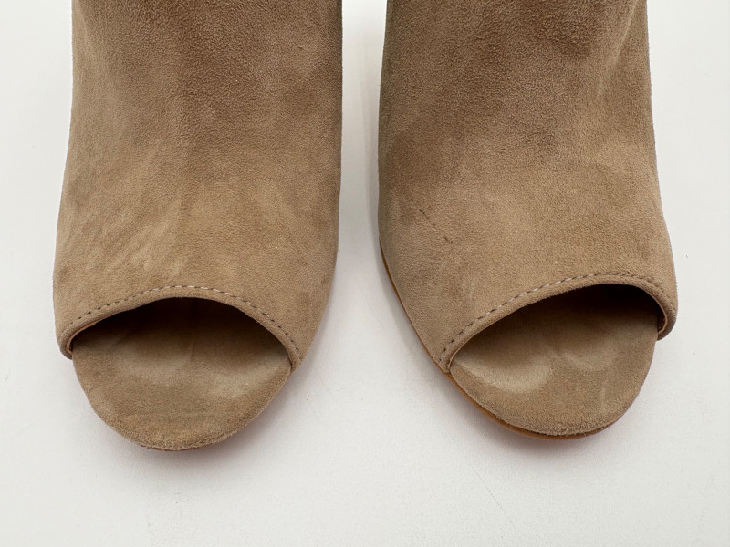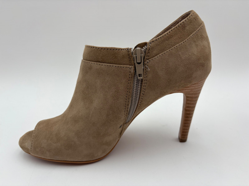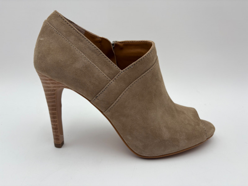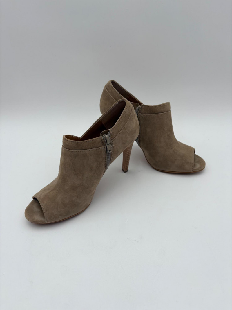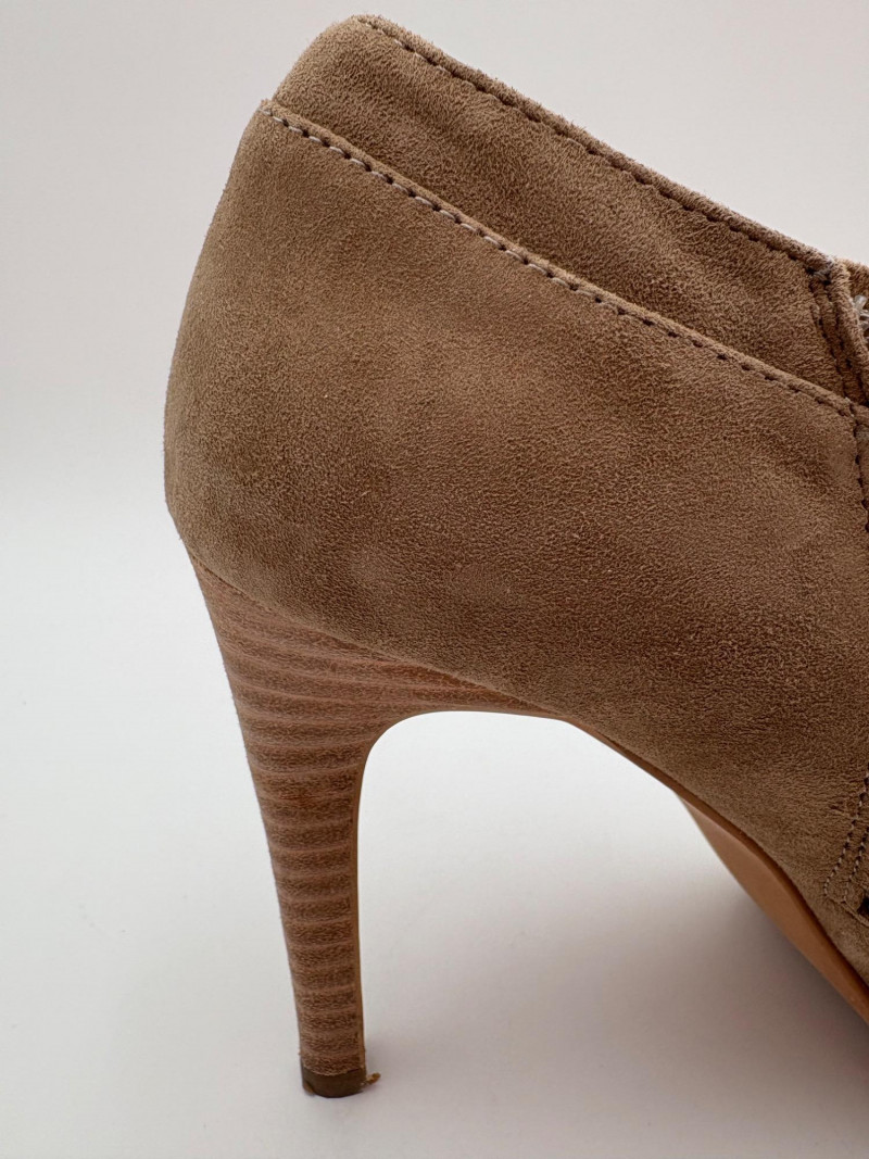 Marc Fisher beige classic seude pumps with chunky heel and pointed toe. Appear to be new. Size 7.5. Audrey Brooke beige spike heels with open toe, full vamp, and inside zip closure. Size 7.5.