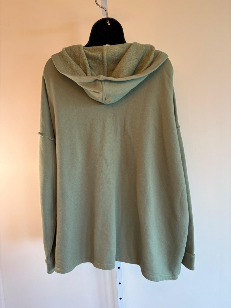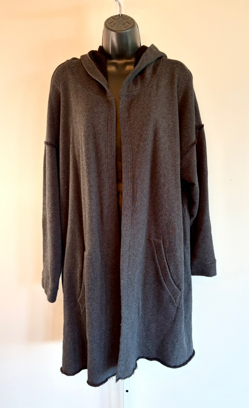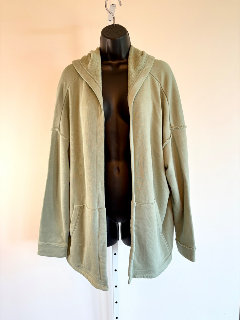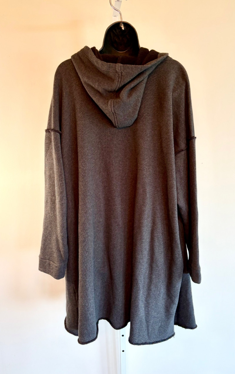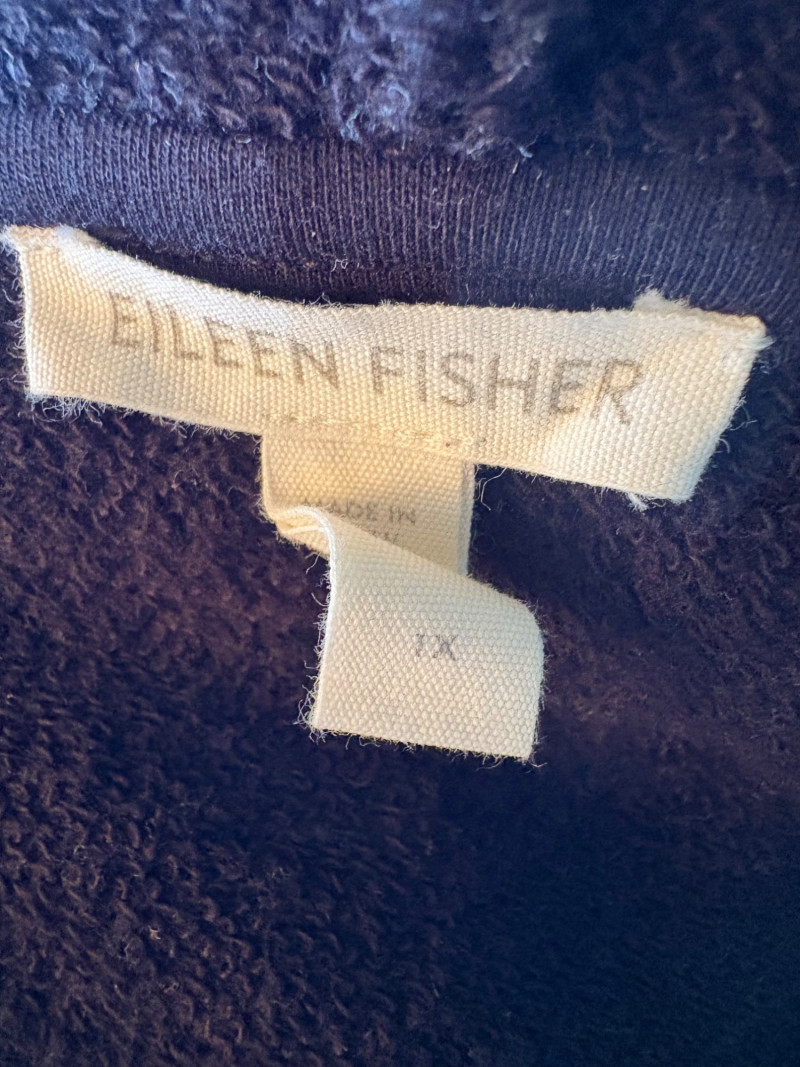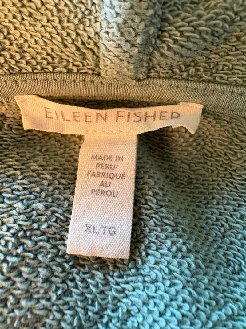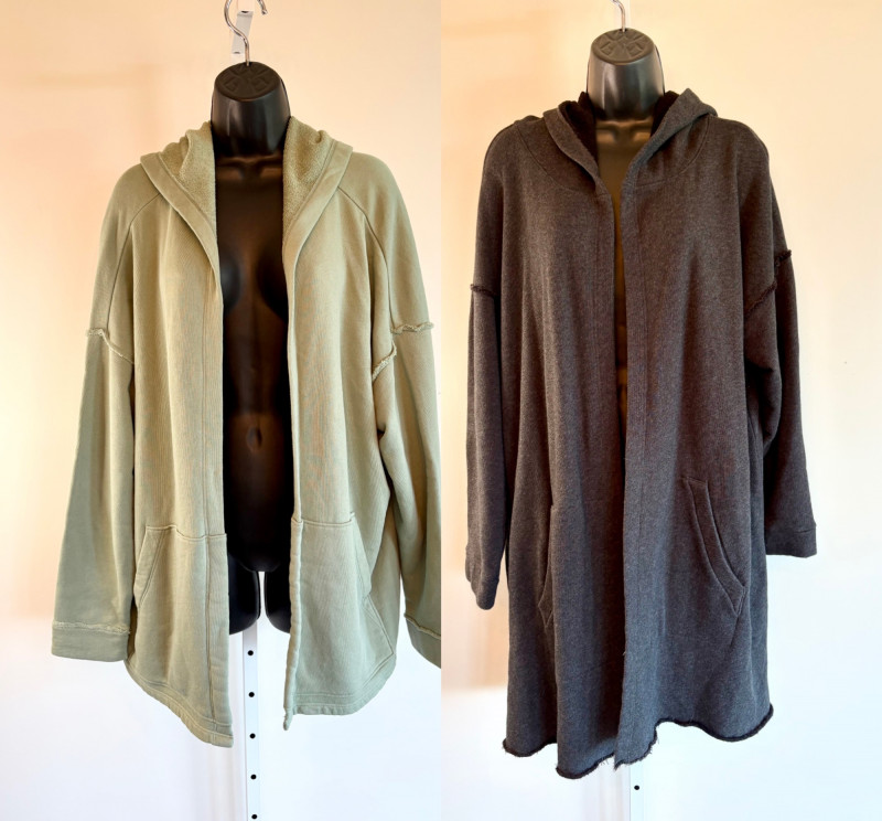 Pair of open front sweatshirts from Eileen Fisher are "old school" with heavy terry loop interior and deconstructed exterior seams. Green sweatshirt has dropped shoulder seams, ribbed cuffs, hood, and open front with kangaroo pockets. Measures 25" pit to pit. 100% organic cotton. Size tag says XL. Dark gray sweatshirt/cardigan has dropped shoulder seams, hood, ribbed cuffs, rolled hem, and open front with kangaroo pockets. Measures 26" pit to pit (this is long - about 34" from back neckline to bottom hem). 100% organic cotton. Size tag says 1X.