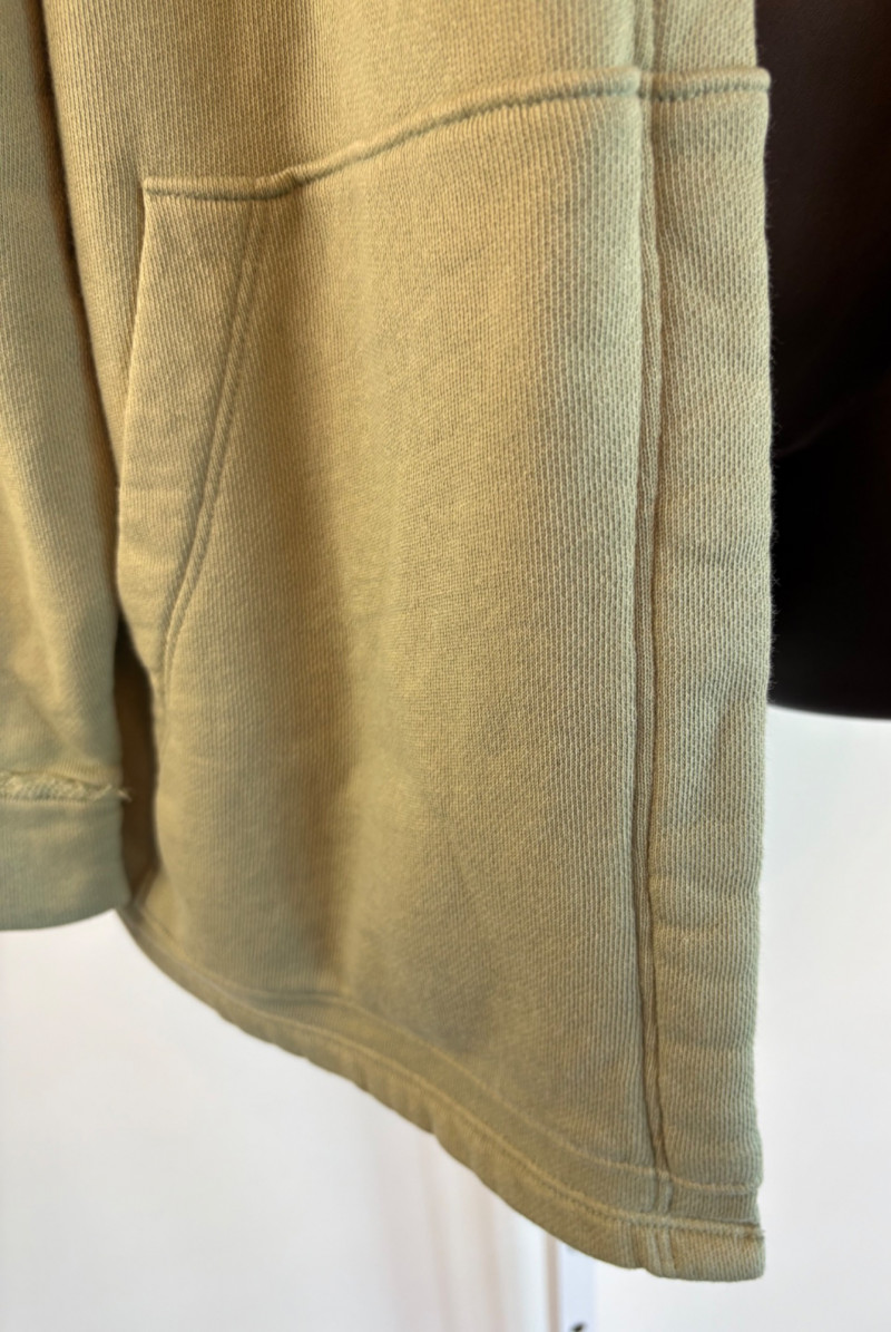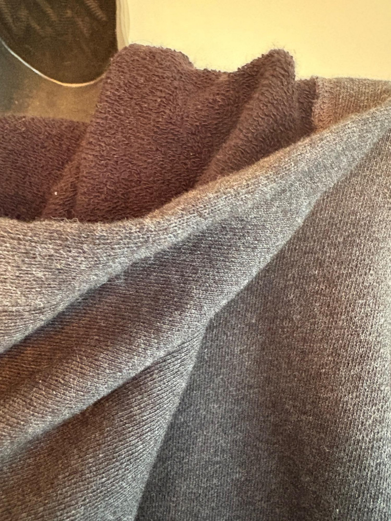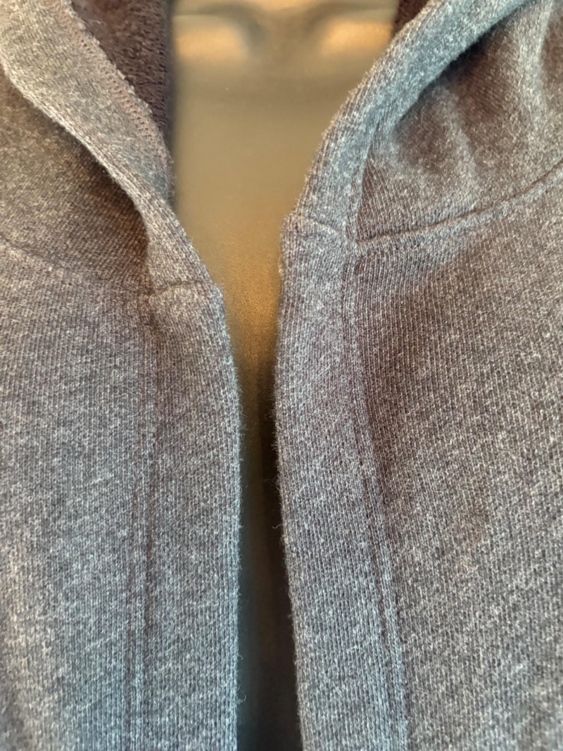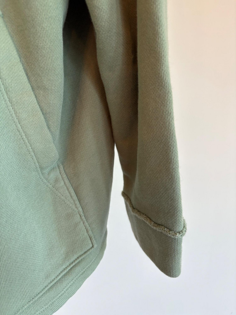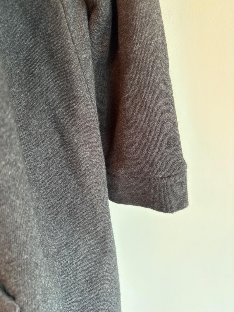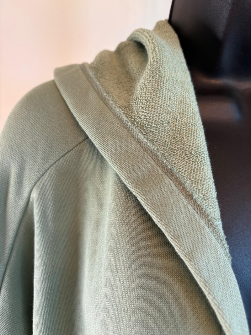 Pair of open front sweatshirts from Eileen Fisher are "old school" with heavy terry loop interior and deconstructed exterior seams. Green sweatshirt has dropped shoulder seams, ribbed cuffs, hood, and open front with kangaroo pockets. Measures 25" pit to pit. 100% organic cotton. Size tag says XL. Dark gray sweatshirt/cardigan has dropped shoulder seams, hood, ribbed cuffs, rolled hem, and open front with kangaroo pockets. Measures 26" pit to pit (this is long - about 34" from back neckline to bottom hem). 100% organic cotton. Size tag says 1X.