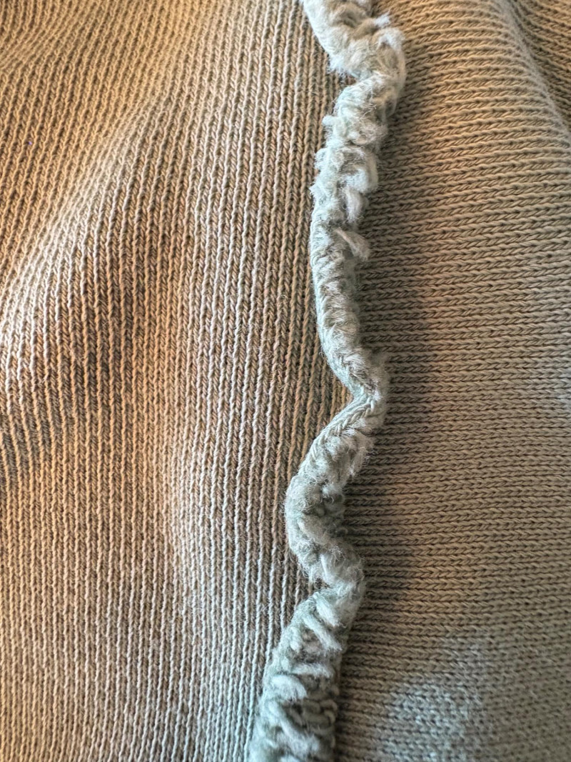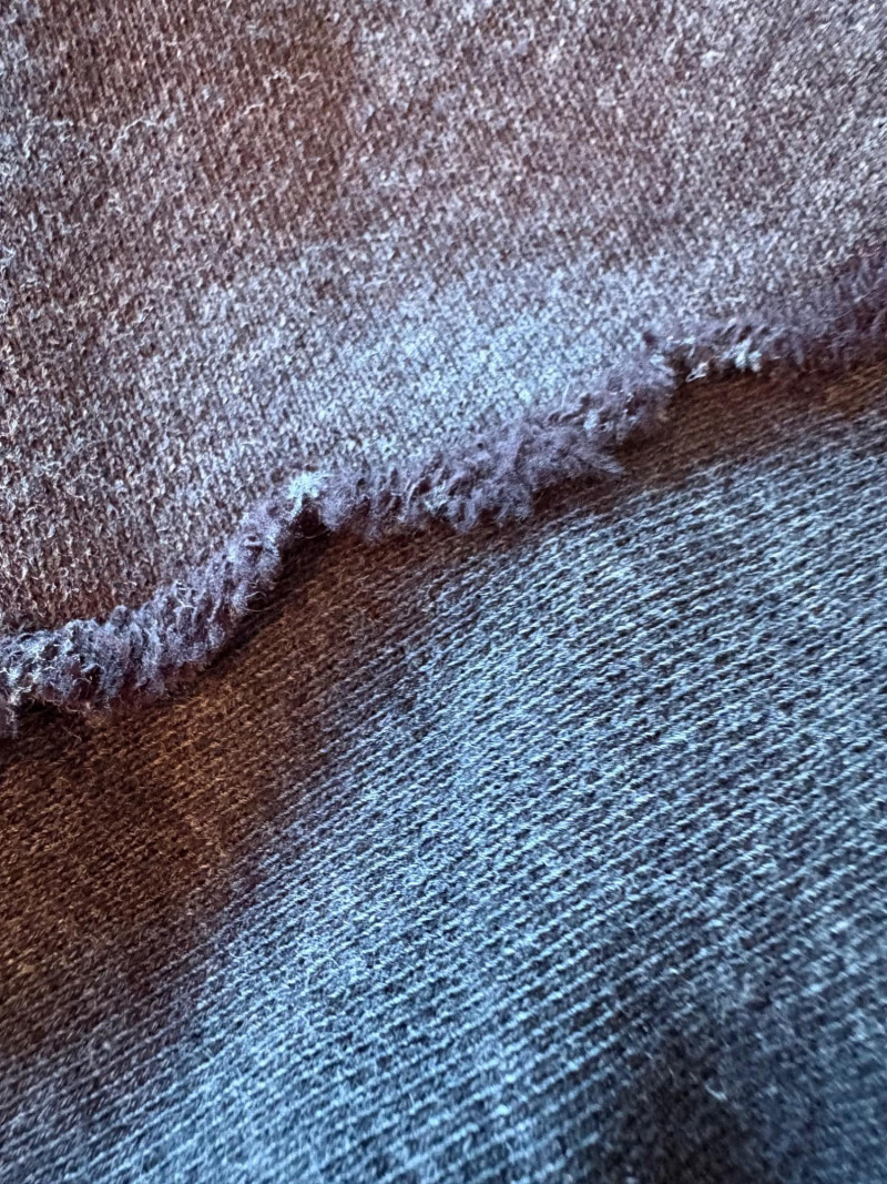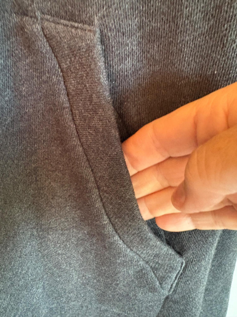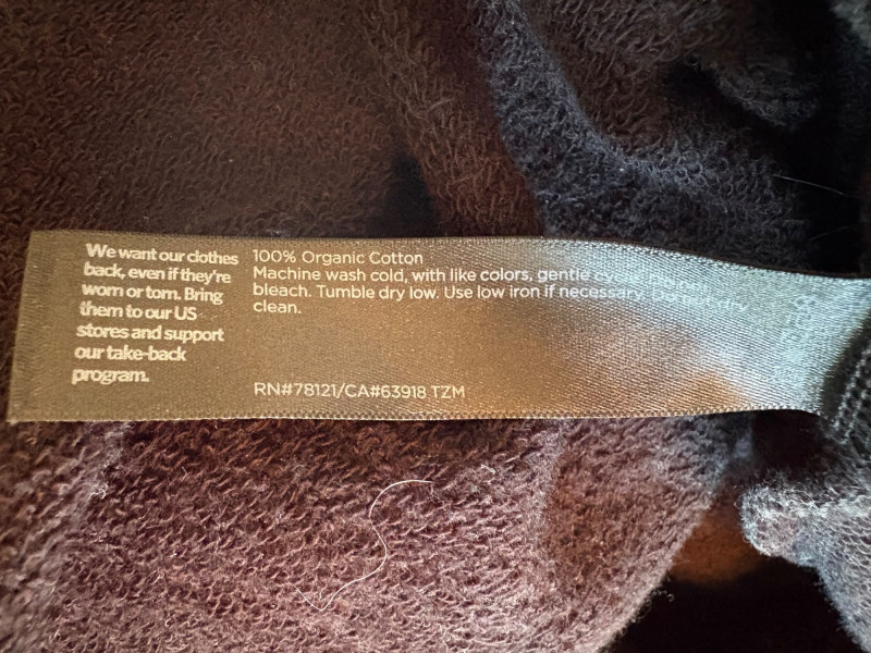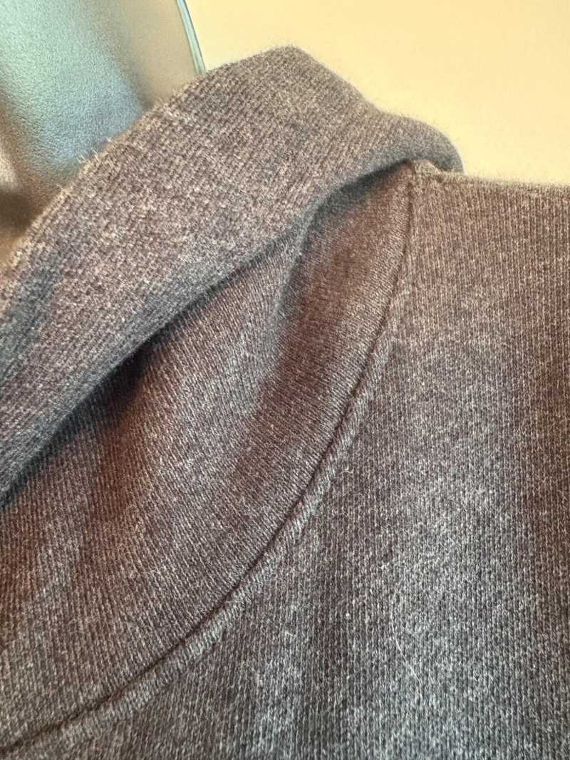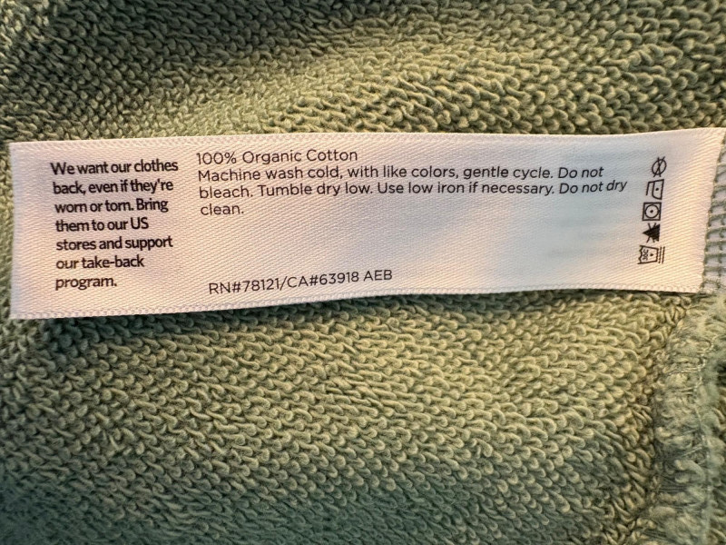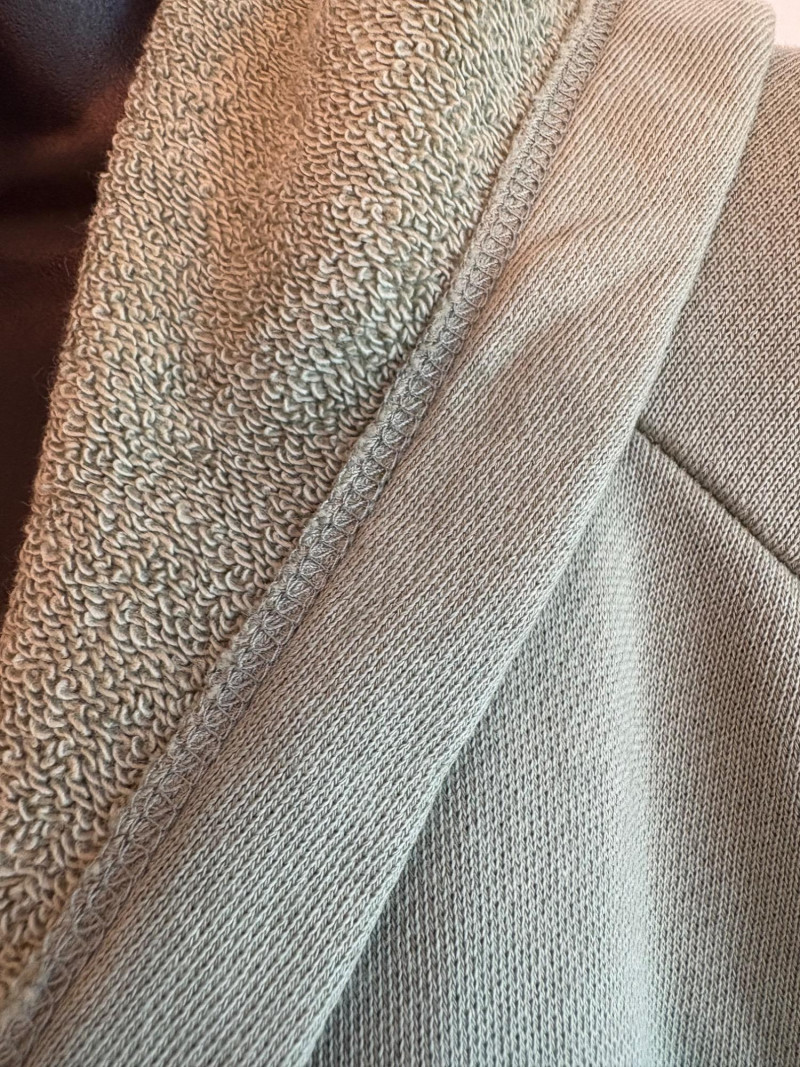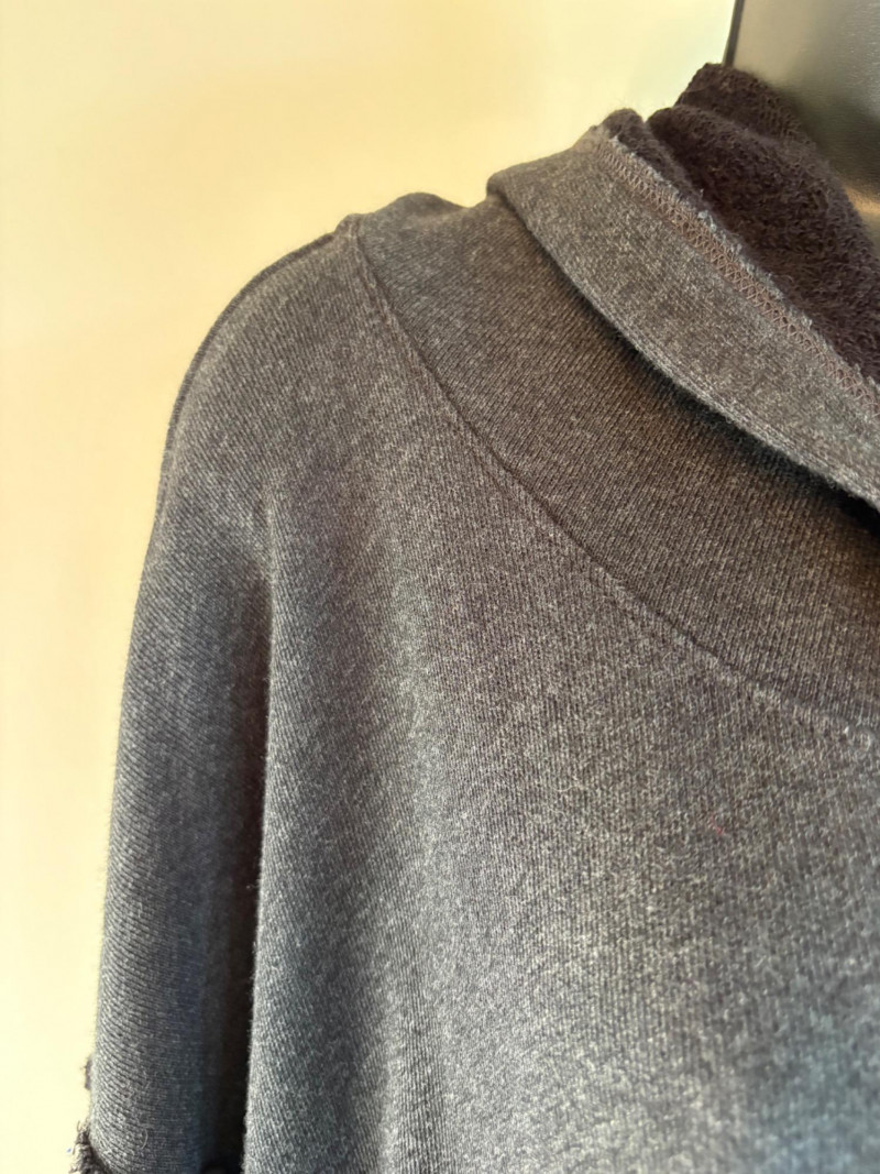 Pair of open front sweatshirts from Eileen Fisher are "old school" with heavy terry loop interior and deconstructed exterior seams. Green sweatshirt has dropped shoulder seams, ribbed cuffs, hood, and open front with kangaroo pockets. Measures 25" pit to pit. 100% organic cotton. Size tag says XL. Dark gray sweatshirt/cardigan has dropped shoulder seams, hood, ribbed cuffs, rolled hem, and open front with kangaroo pockets. Measures 26" pit to pit (this is long - about 34" from back neckline to bottom hem). 100% organic cotton. Size tag says 1X.