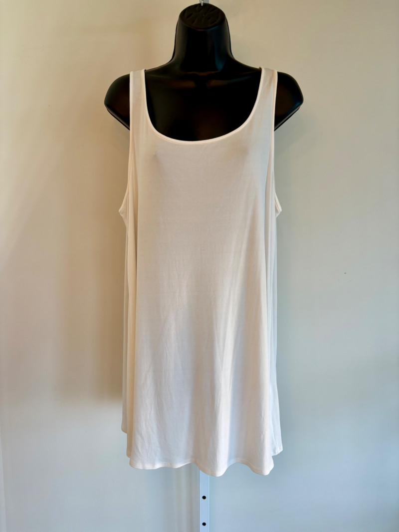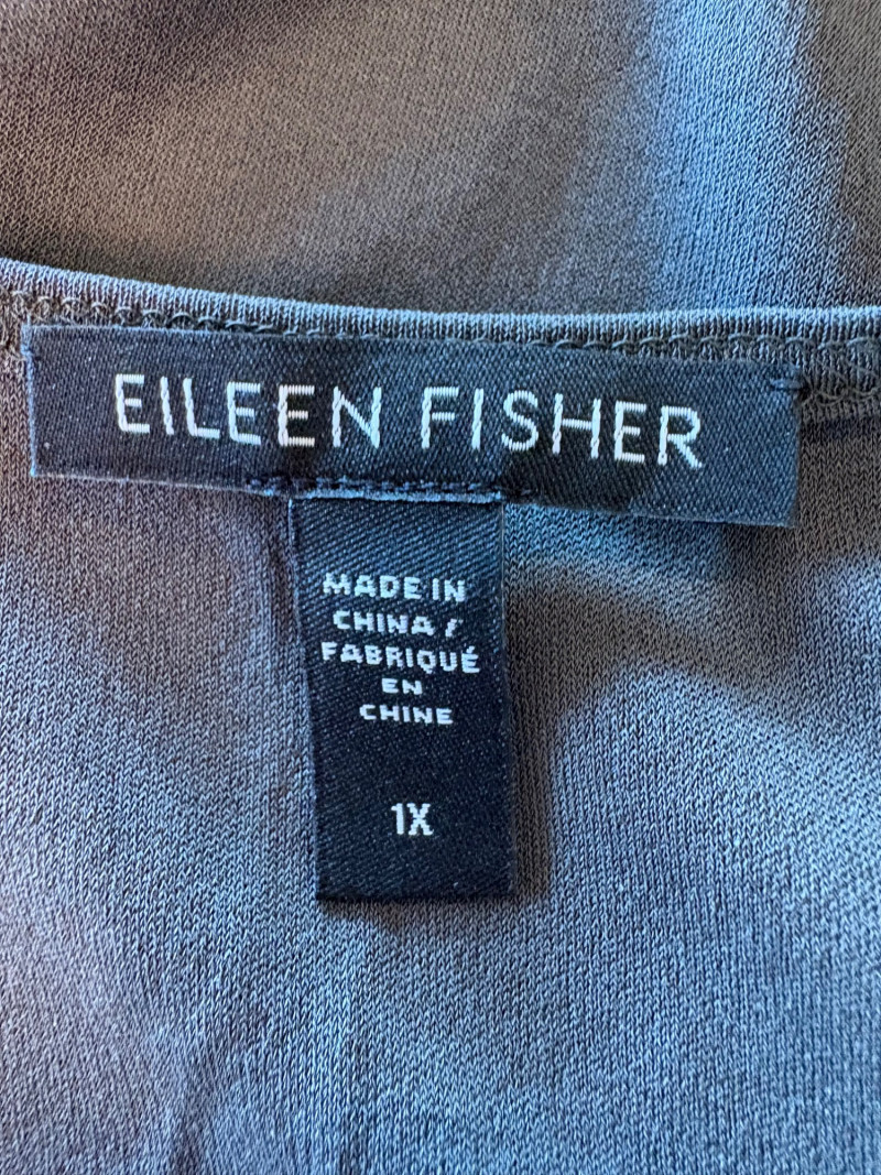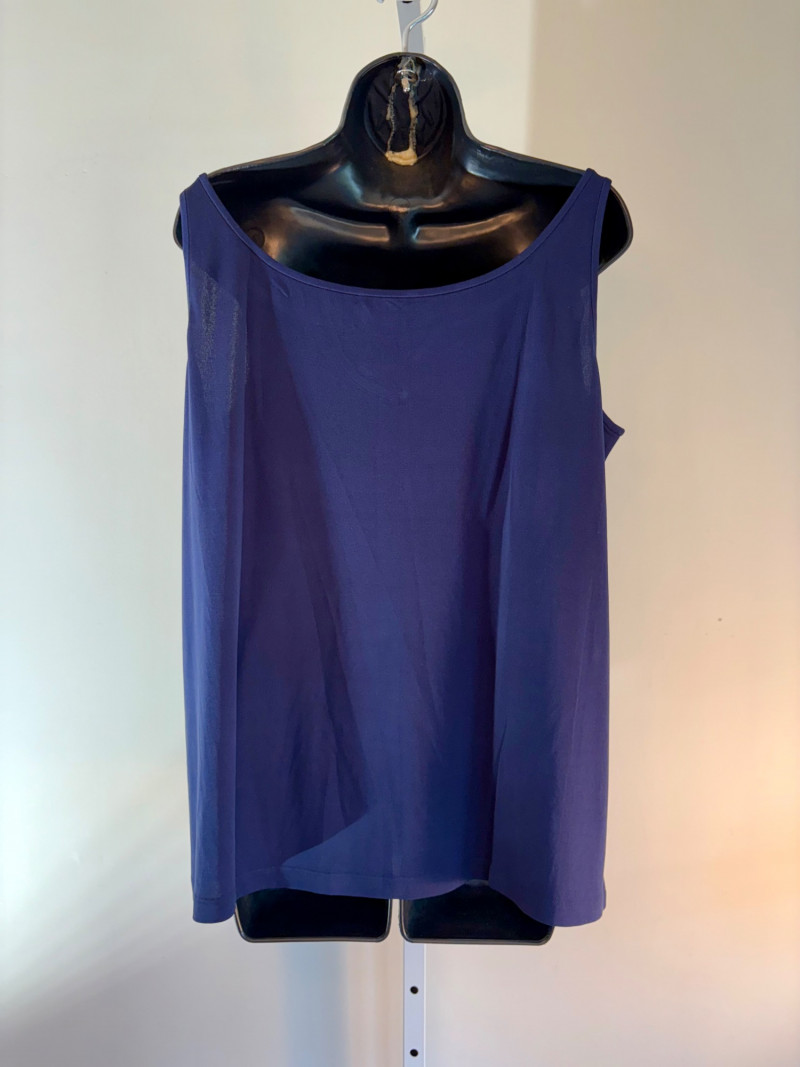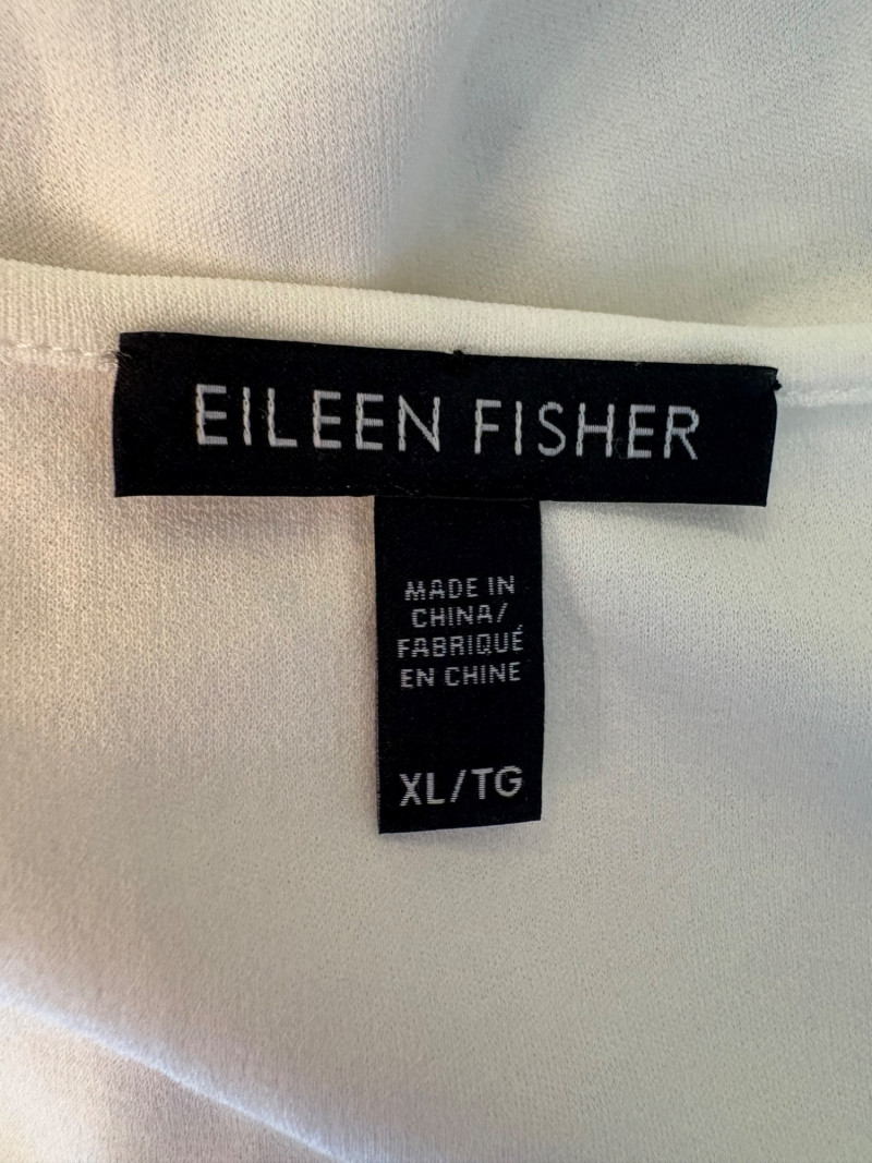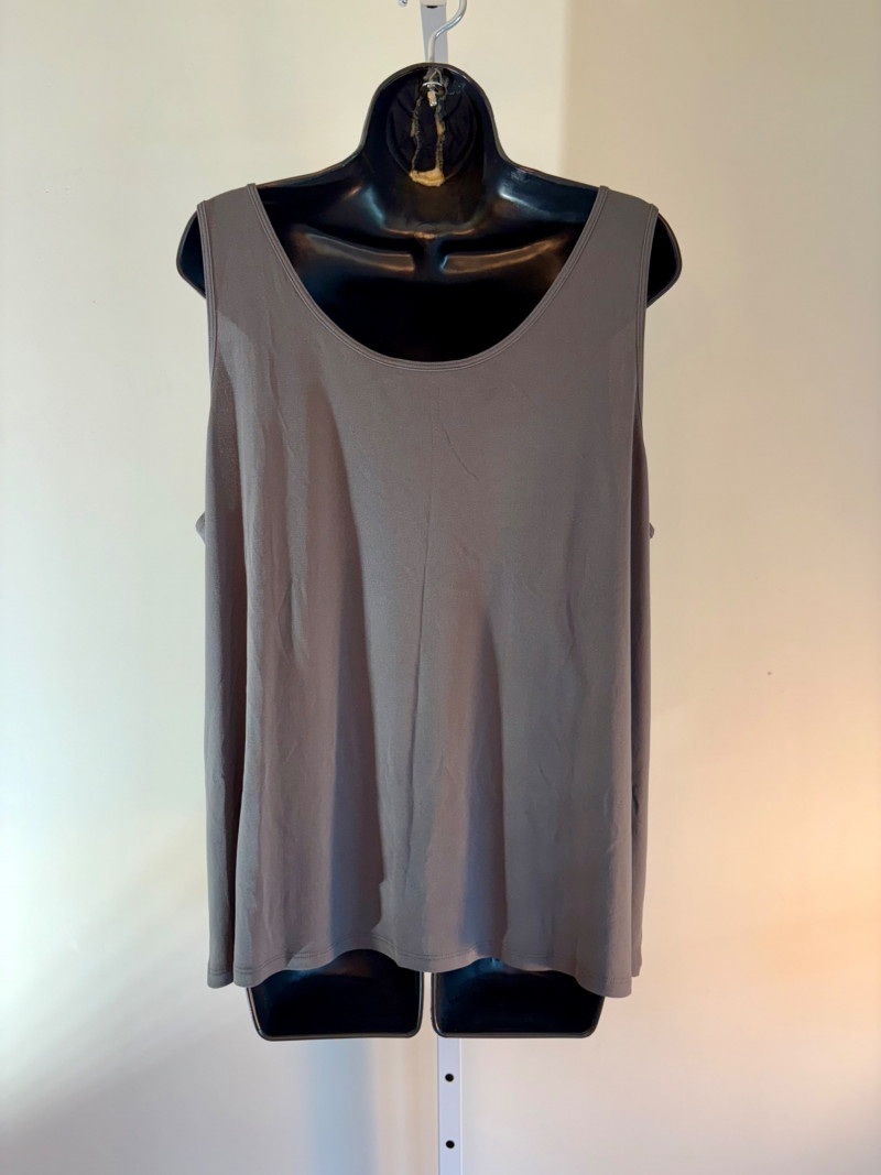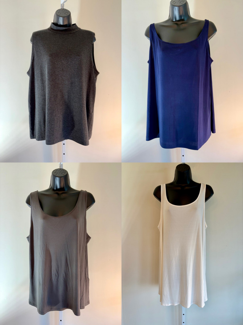 4 quality tops from Eileen Fisher in neutrals that are easy to mix and match. All measure 21.5" pit to pit. Grey sleeveless shell is Tencel Lyocell/polyurethane blend. Size tag says L. Navy blue tank is 100% silk. Size tag says 1X. Grey tank is 100% silk. Size tag says 1X. White tank is 100% silk. Size tag says XL.