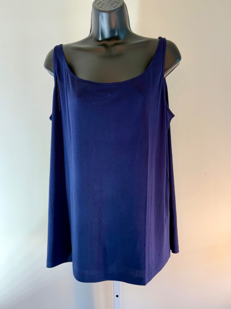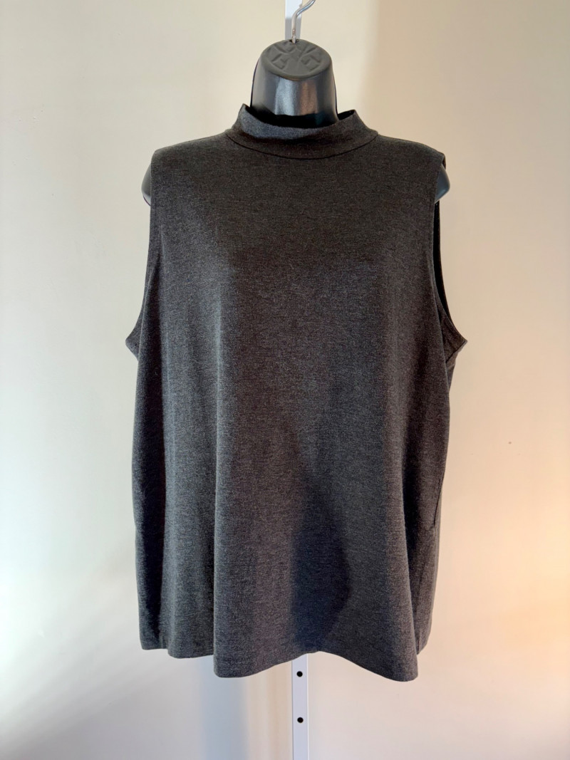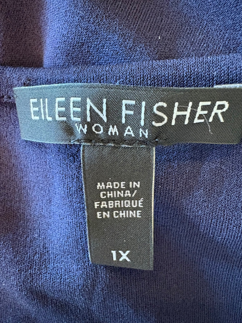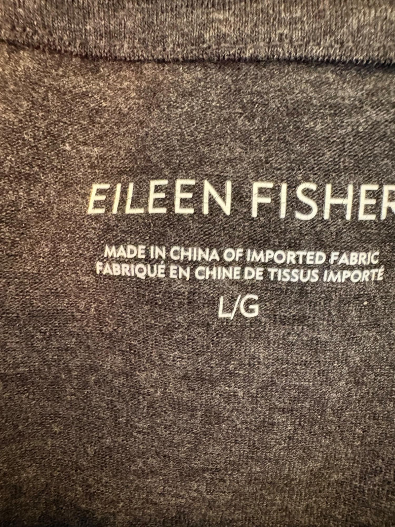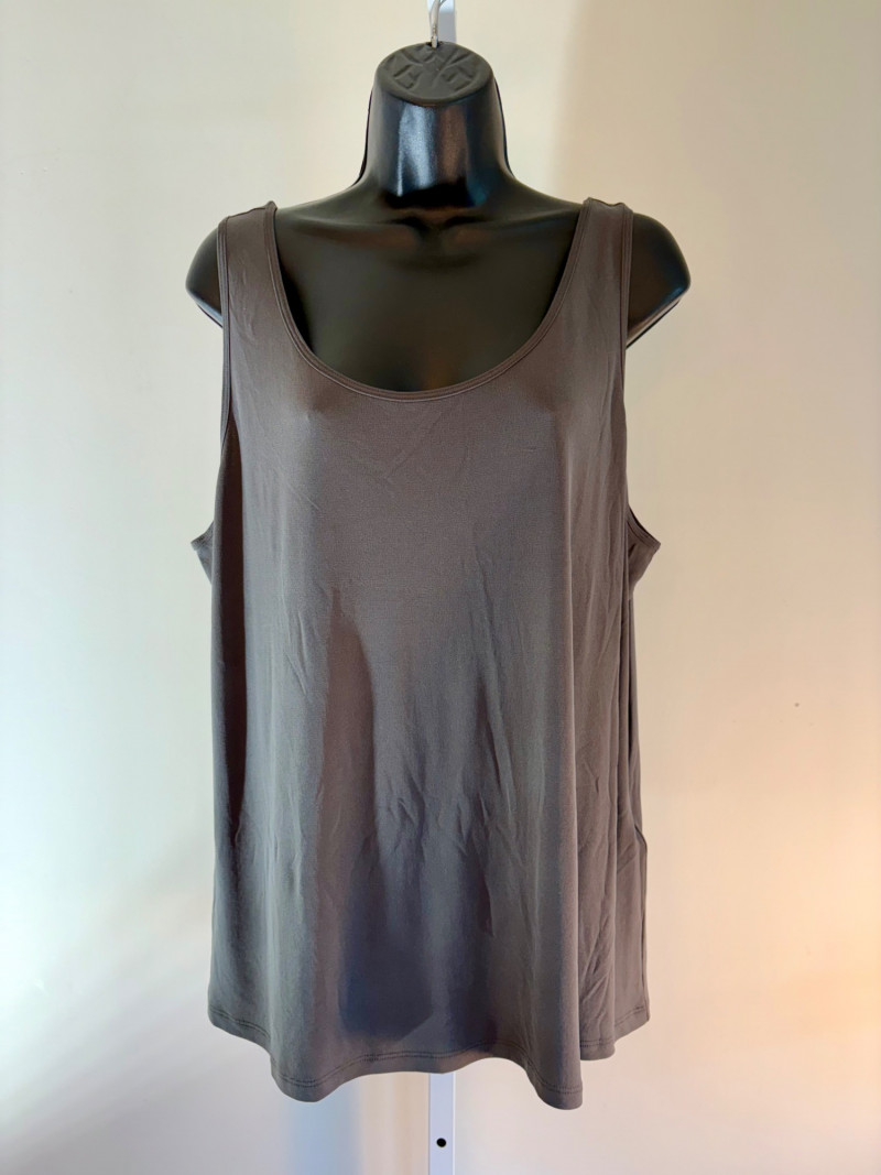 4 quality tops from Eileen Fisher in neutrals that are easy to mix and match. All measure 21.5" pit to pit. Grey sleeveless shell is Tencel Lyocell/polyurethane blend. Size tag says L. Navy blue tank is 100% silk. Size tag says 1X. Grey tank is 100% silk. Size tag says 1X. White tank is 100% silk. Size tag says XL.