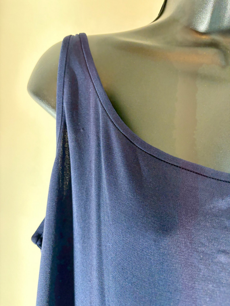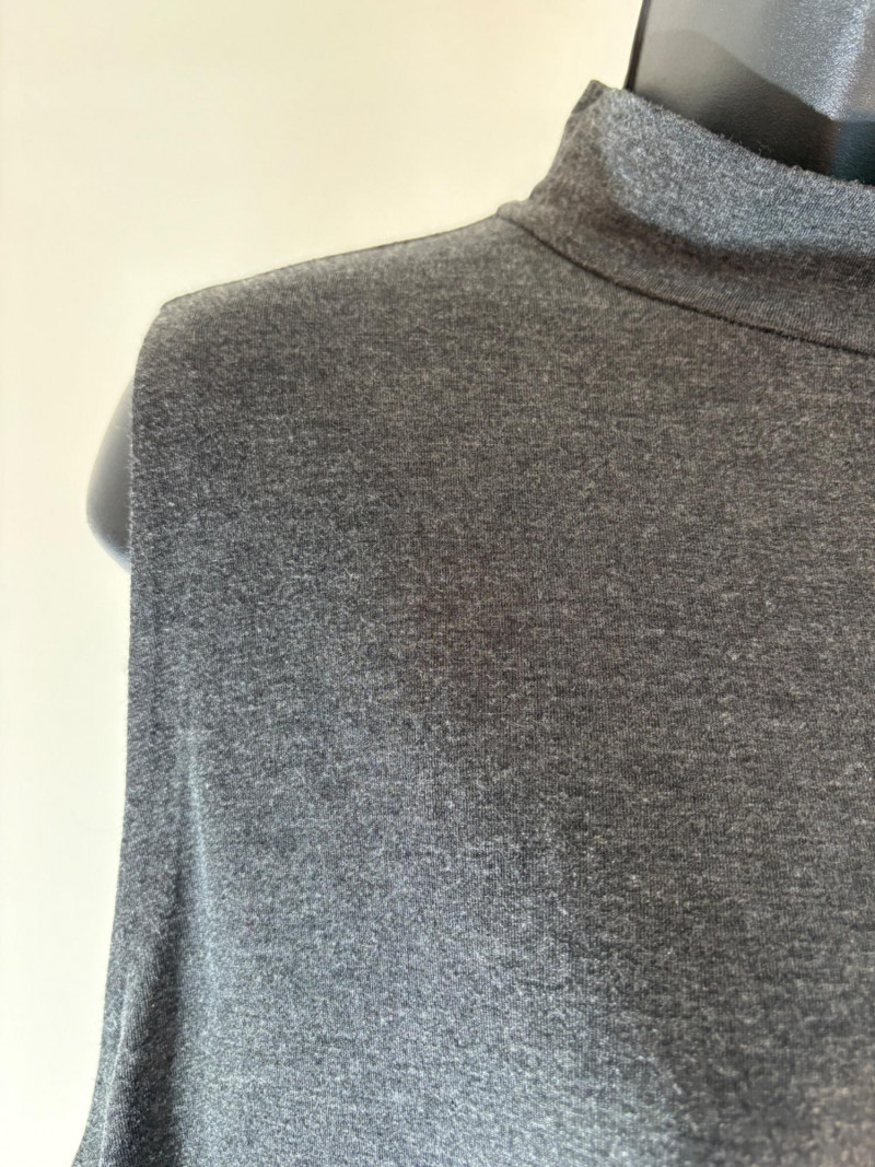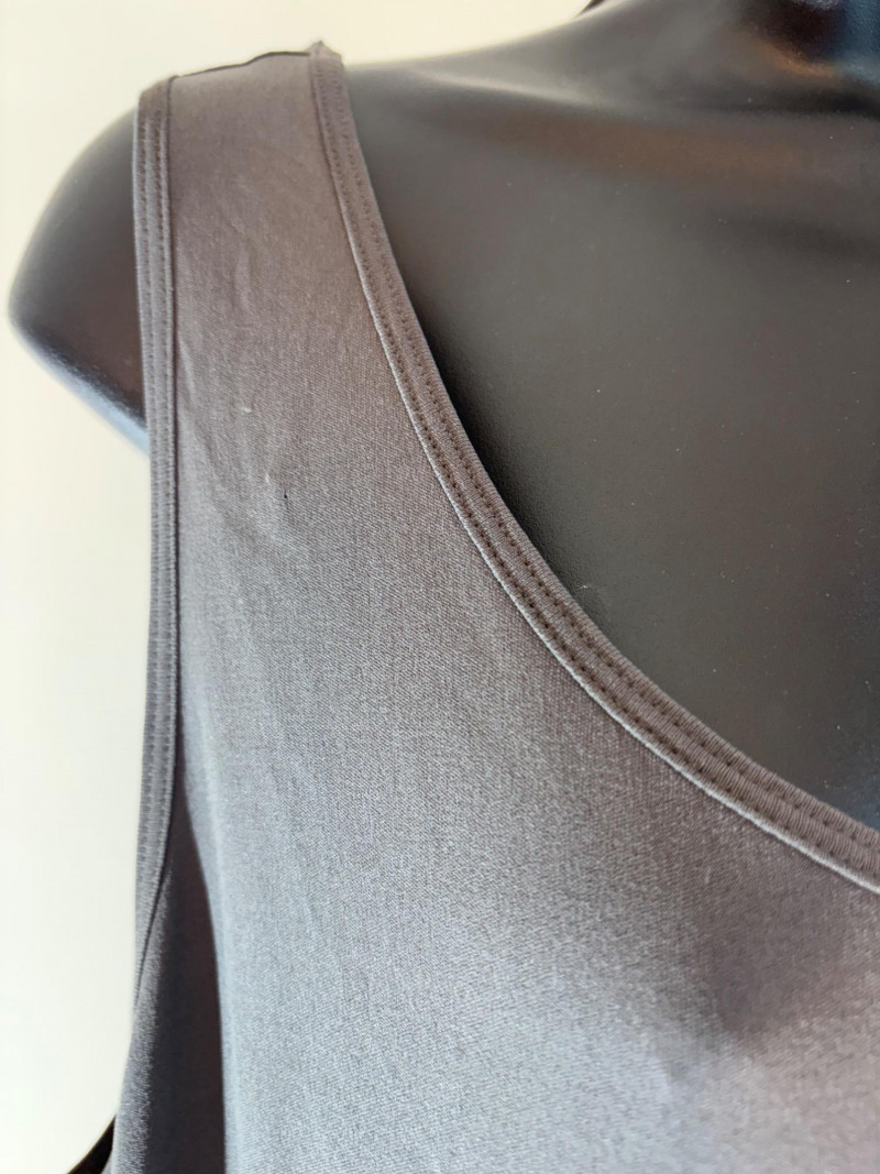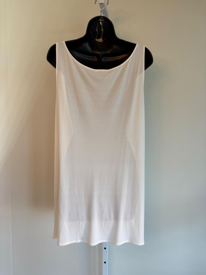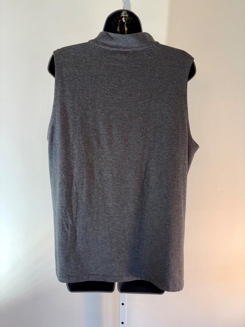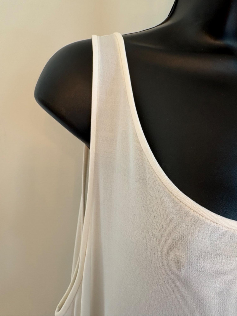 4 quality tops from Eileen Fisher in neutrals that are easy to mix and match. All measure 21.5" pit to pit. Grey sleeveless shell is Tencel Lyocell/polyurethane blend. Size tag says L. Navy blue tank is 100% silk. Size tag says 1X. Grey tank is 100% silk. Size tag says 1X. White tank is 100% silk. Size tag says XL.
