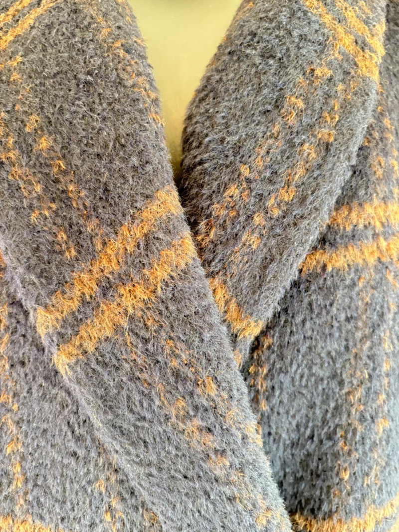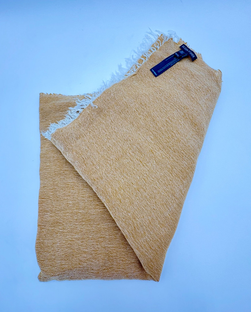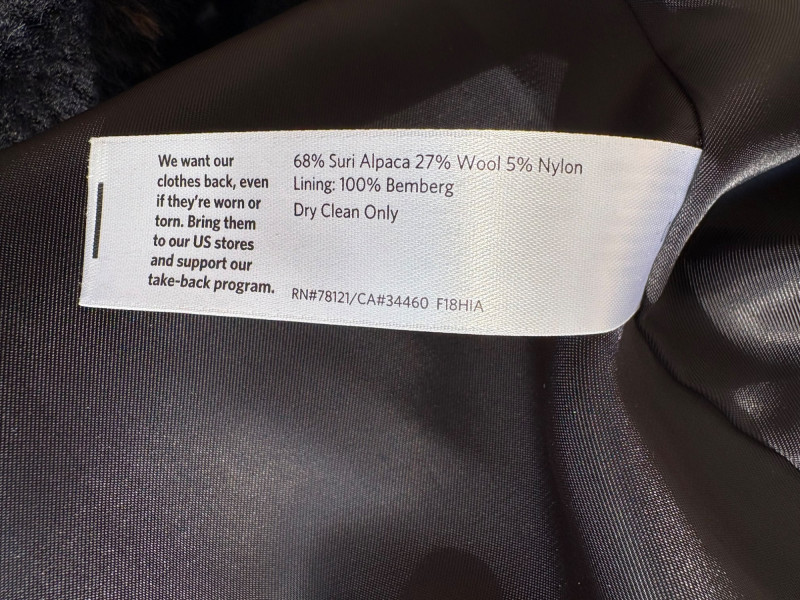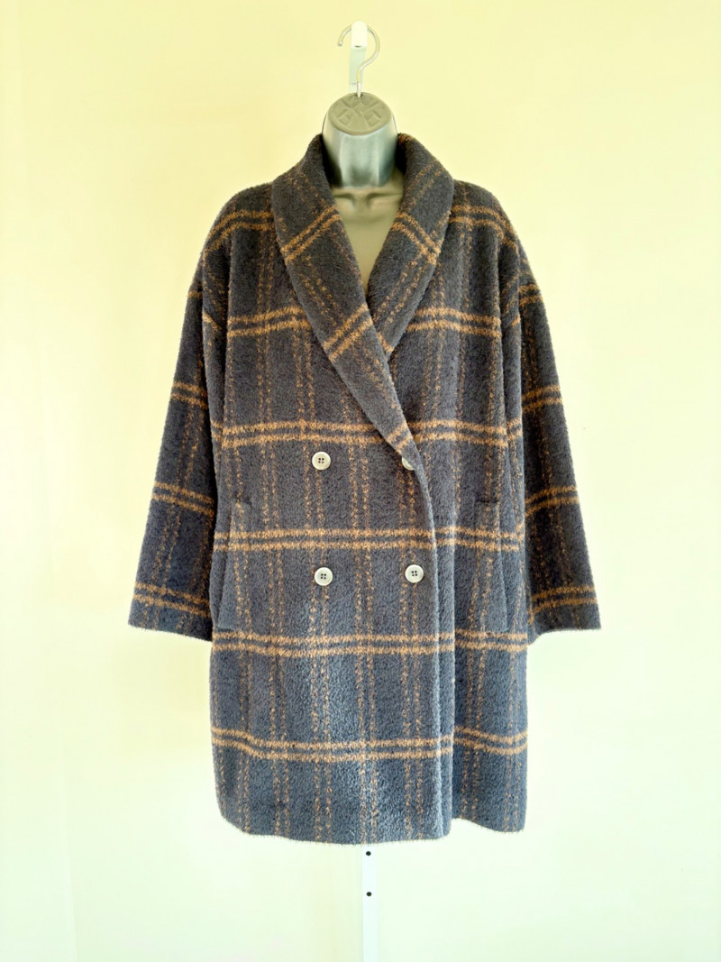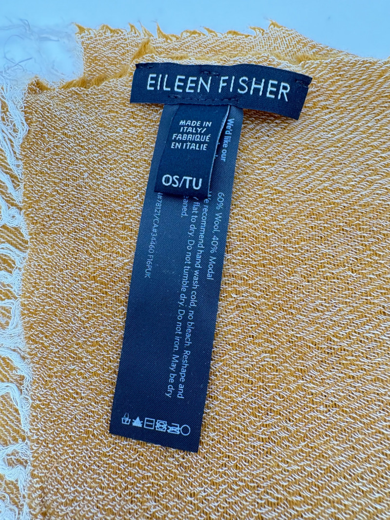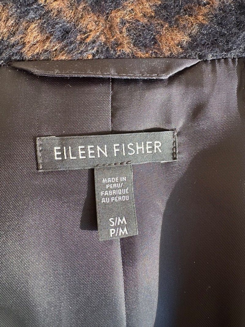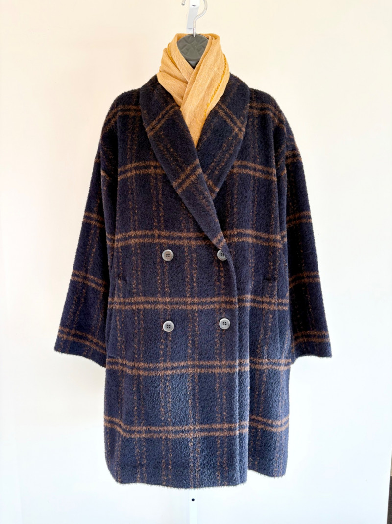 Traditional double-breasted very dark blue (looks black until put next to black) and brown plaid winter coat from Eileen Fisher. Coat has shawl collar, front button closure, welted front pockets, rear vent, and full lining. Alpaca/wool blend. Coat measures 26" pit to pit and 36" from back neckline to hem. Size tag says S/M. (But we feel this is inaccurate given the bust measurement) Paired with brown variegated scarf from Eileen Fisher with fringe on short ends. Wool/modal blend. Measures approximately 86" x 26" and is incredibly soft.
