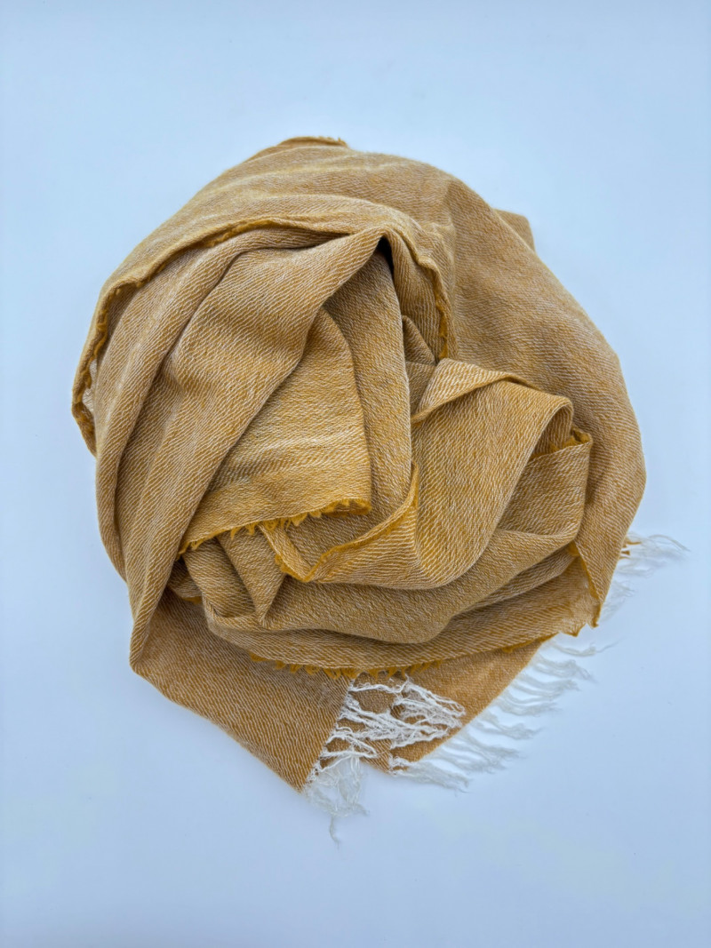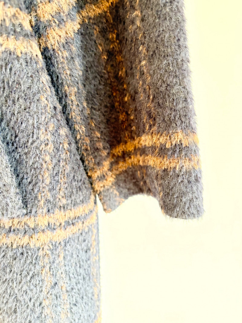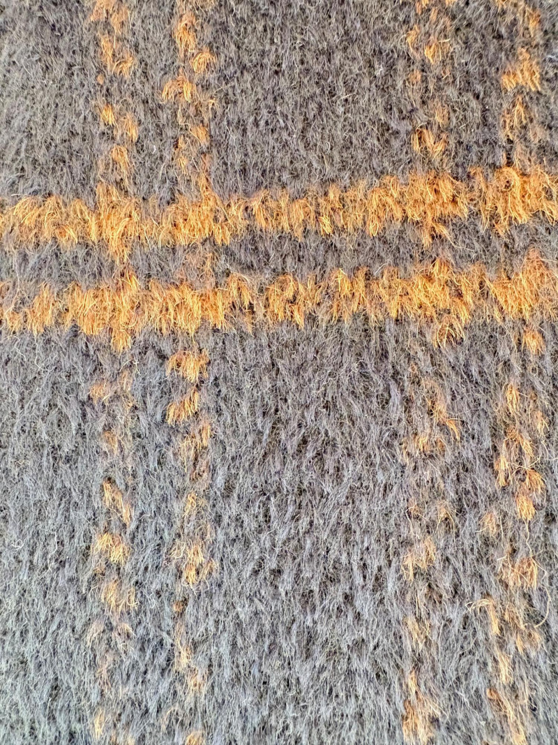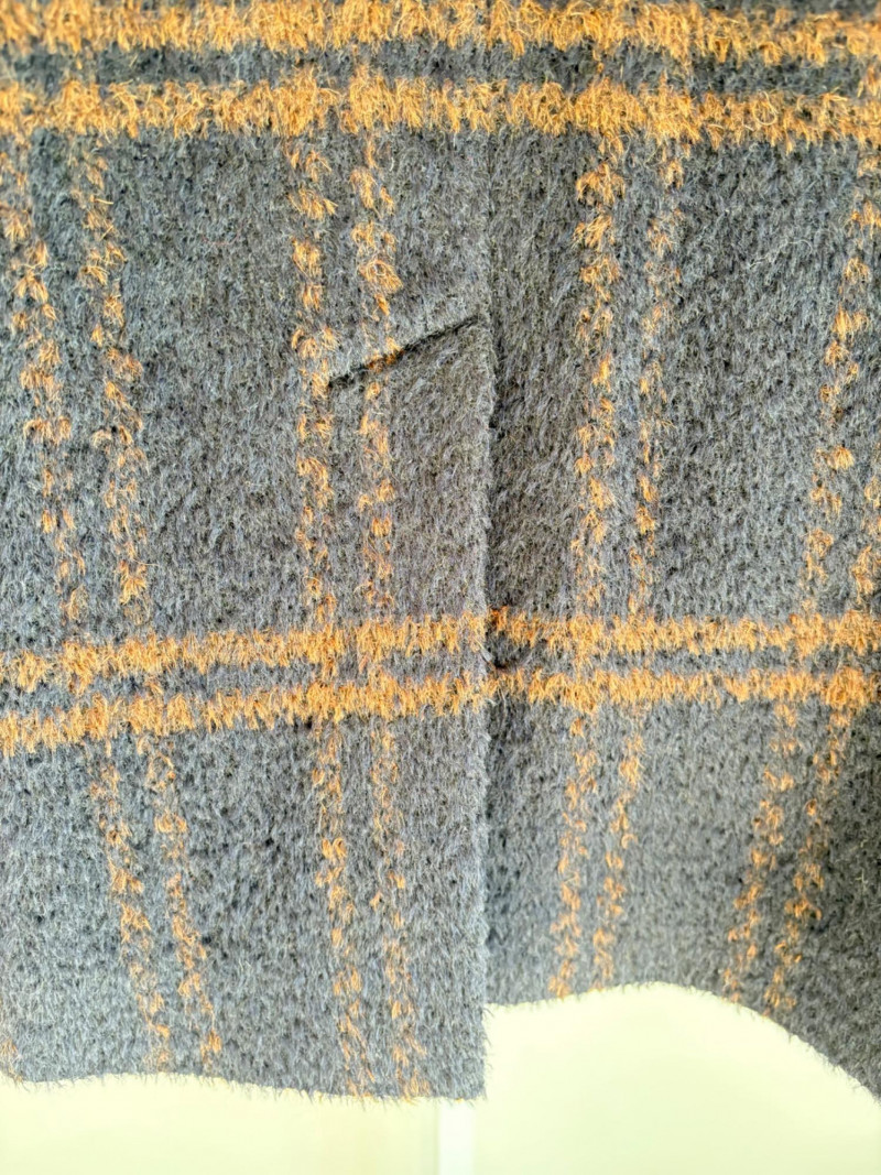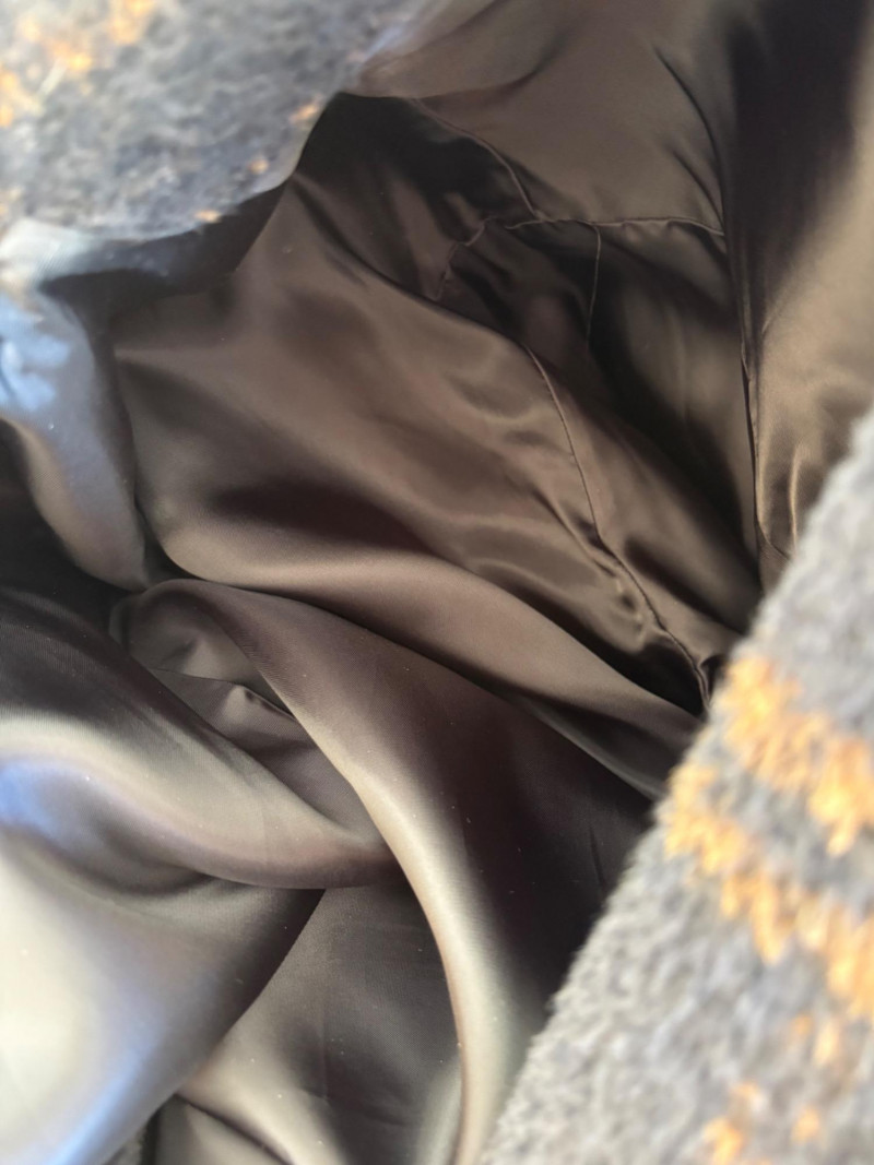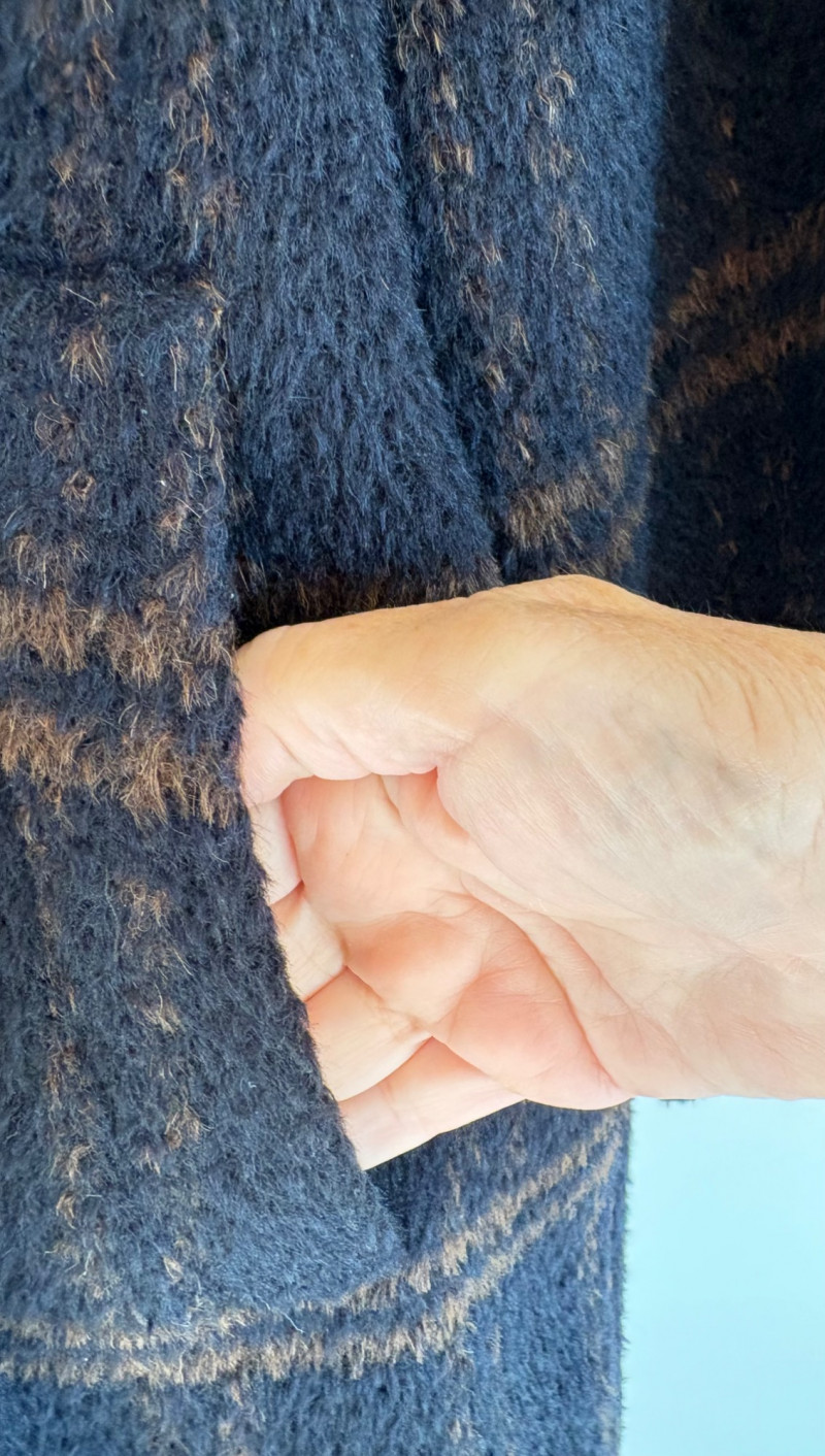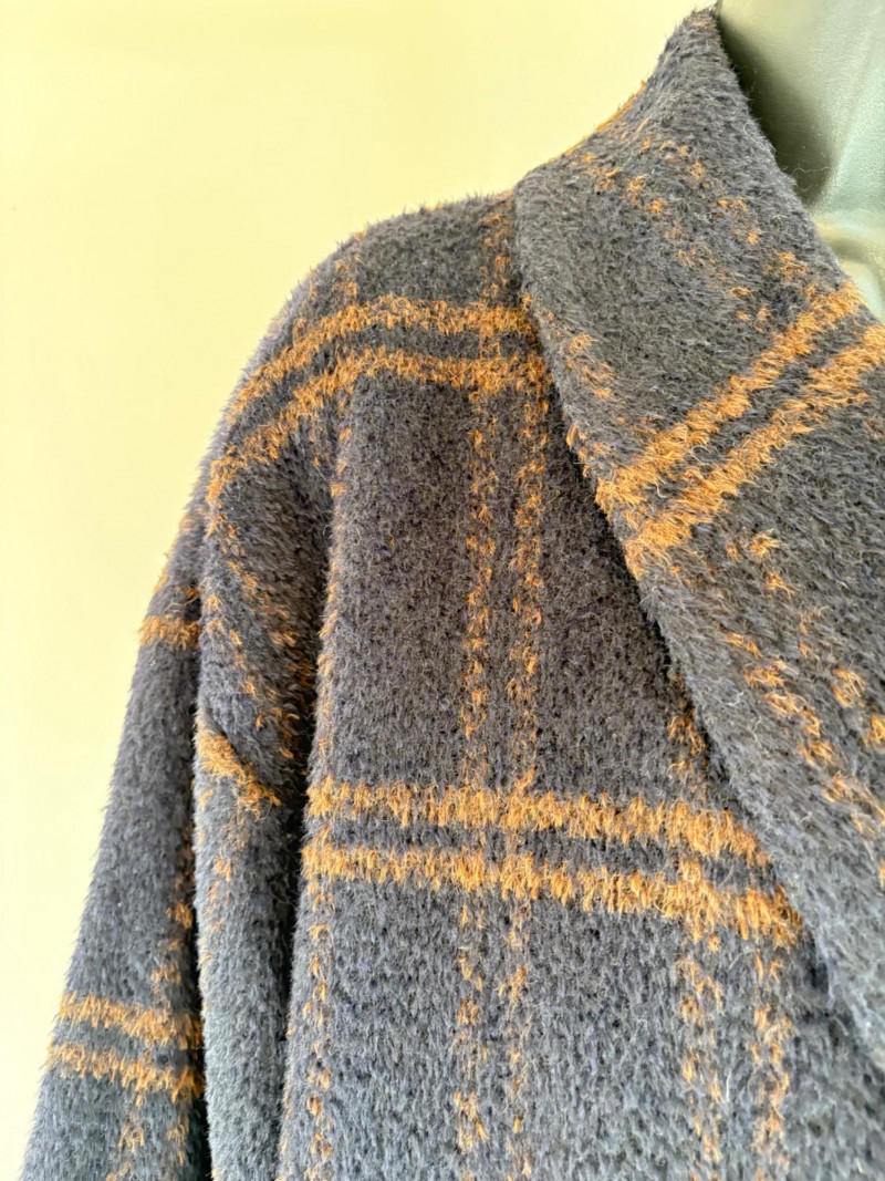 Traditional double-breasted very dark blue (looks black until put next to black) and brown plaid winter coat from Eileen Fisher. Coat has shawl collar, front button closure, welted front pockets, rear vent, and full lining. Alpaca/wool blend. Coat measures 26" pit to pit and 36" from back neckline to hem. Size tag says S/M. (But we feel this is inaccurate given the bust measurement) Paired with brown variegated scarf from Eileen Fisher with fringe on short ends. Wool/modal blend. Measures approximately 86" x 26" and is incredibly soft.