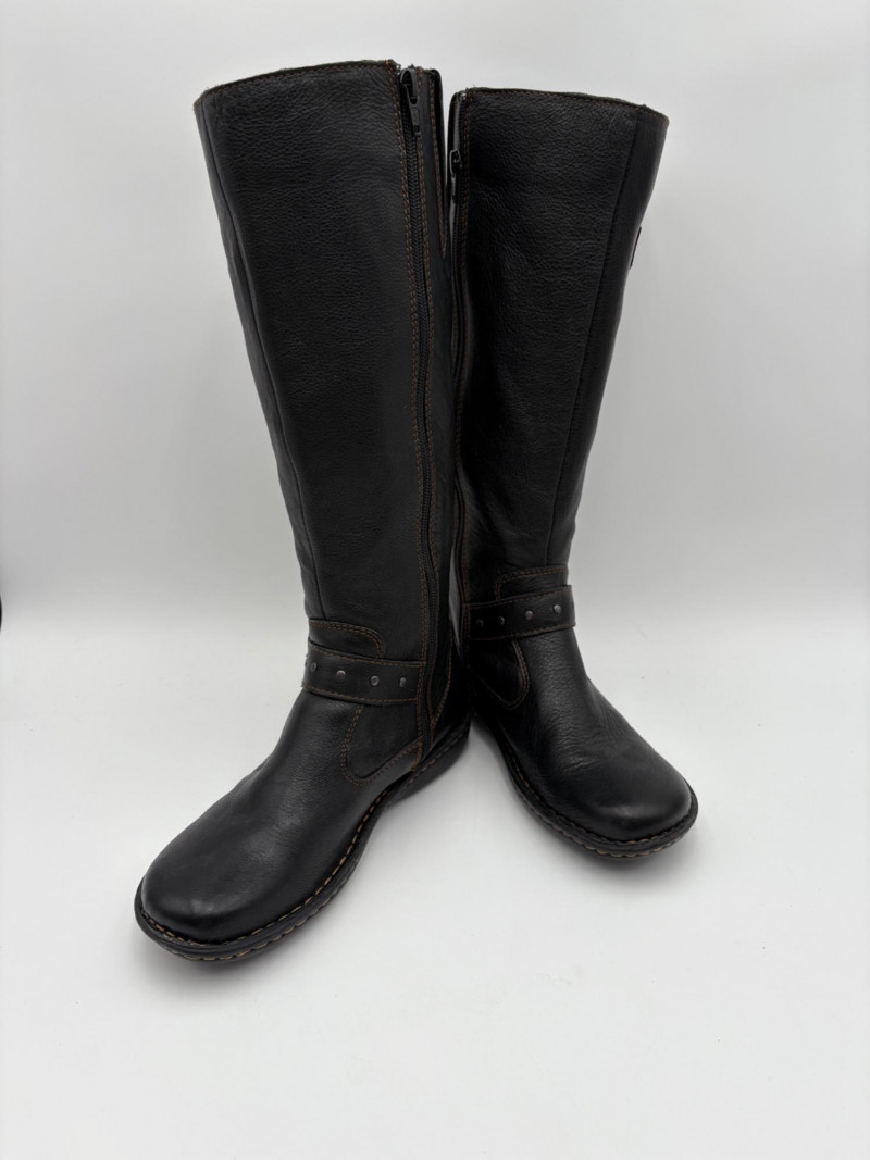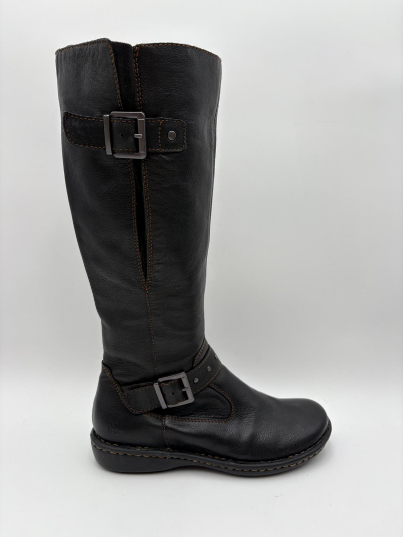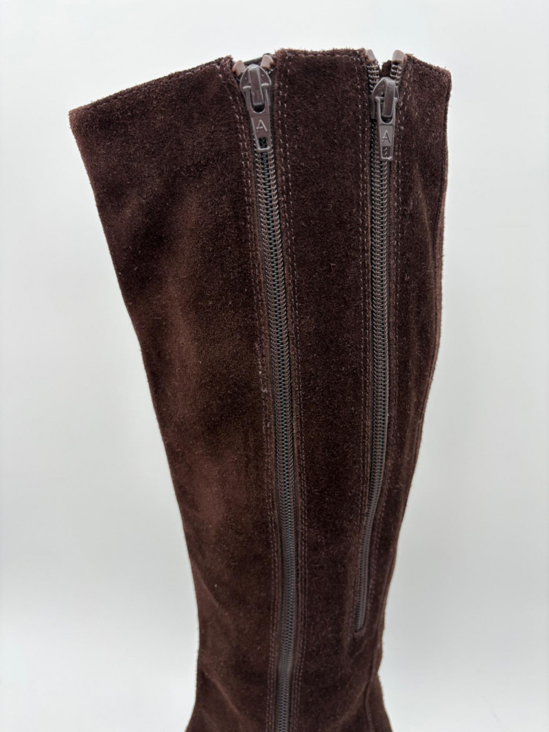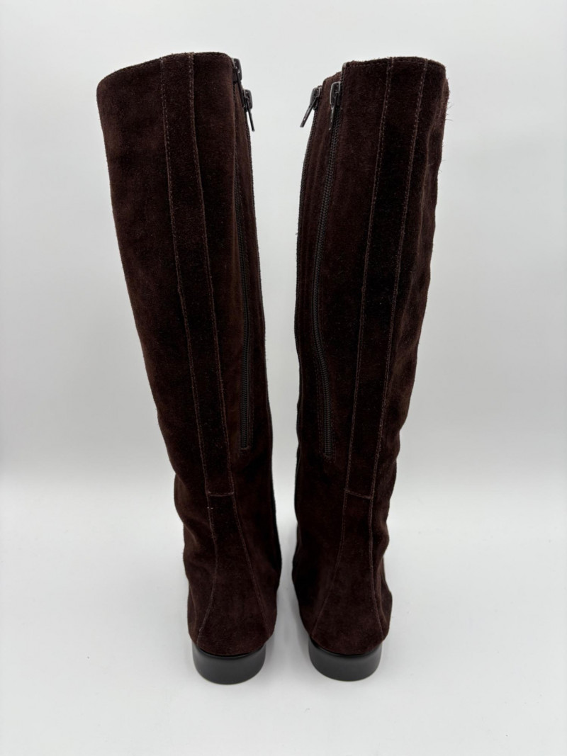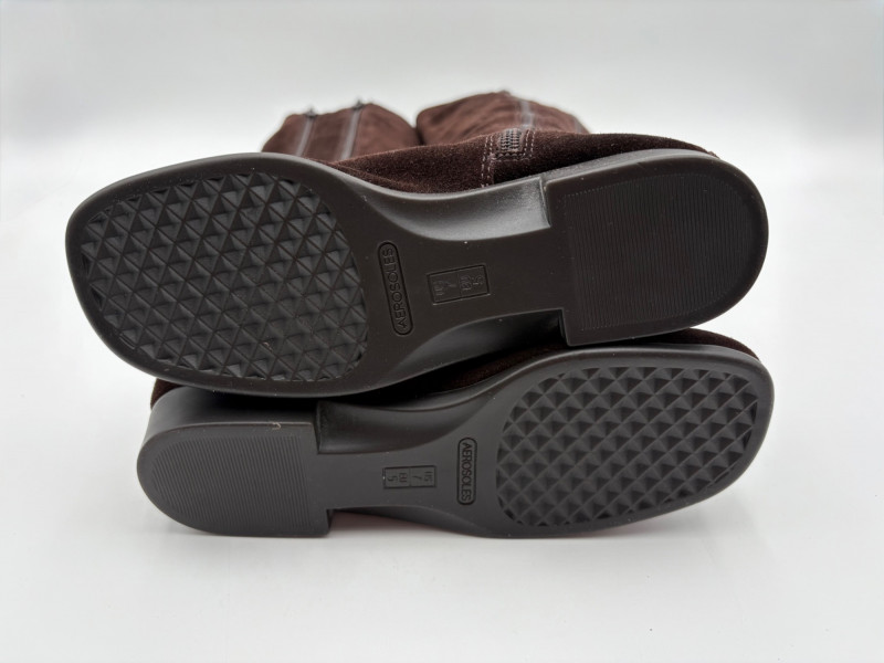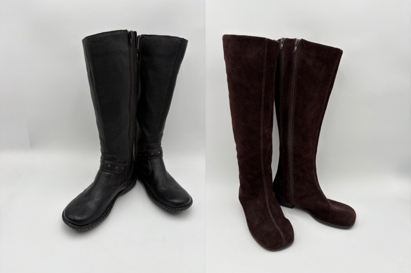 BOC black leather boots with inside zip, adjustable calf gusset, and buckle detailing. Size 7. Aerosoles dark chocolate brown suede boots with adjustable zip calf gusset, inside leg zip, and semi-square toe. Appear to be new. Size 7.