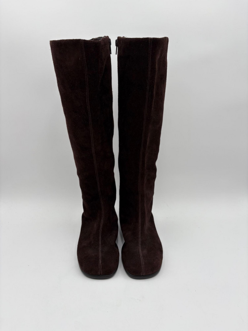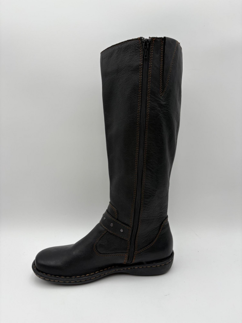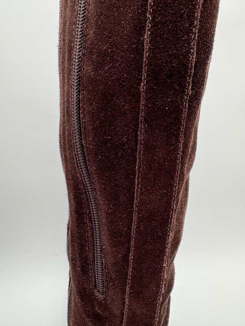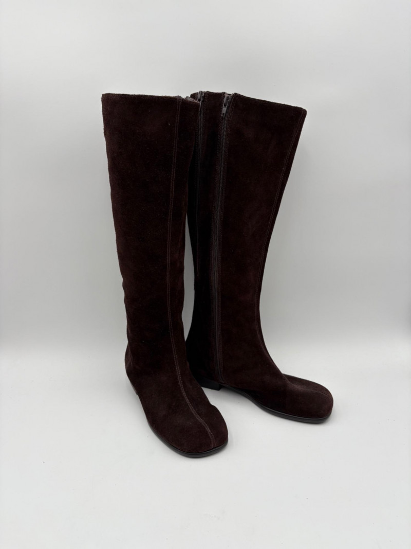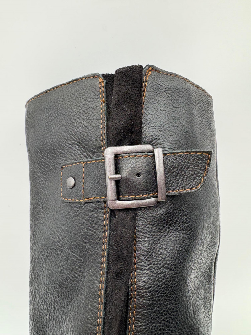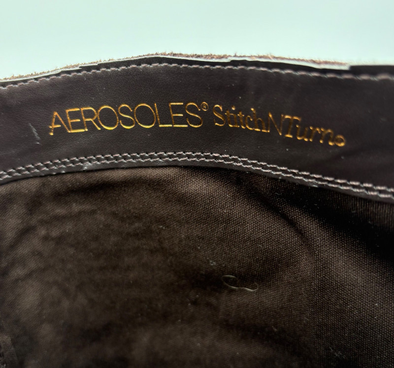BOC black leather boots with inside zip, adjustable calf gusset, and buckle detailing. Size 7. Aerosoles dark chocolate brown suede boots with adjustable zip calf gusset, inside leg zip, and semi-square toe. Appear to be new. Size 7.