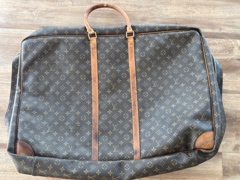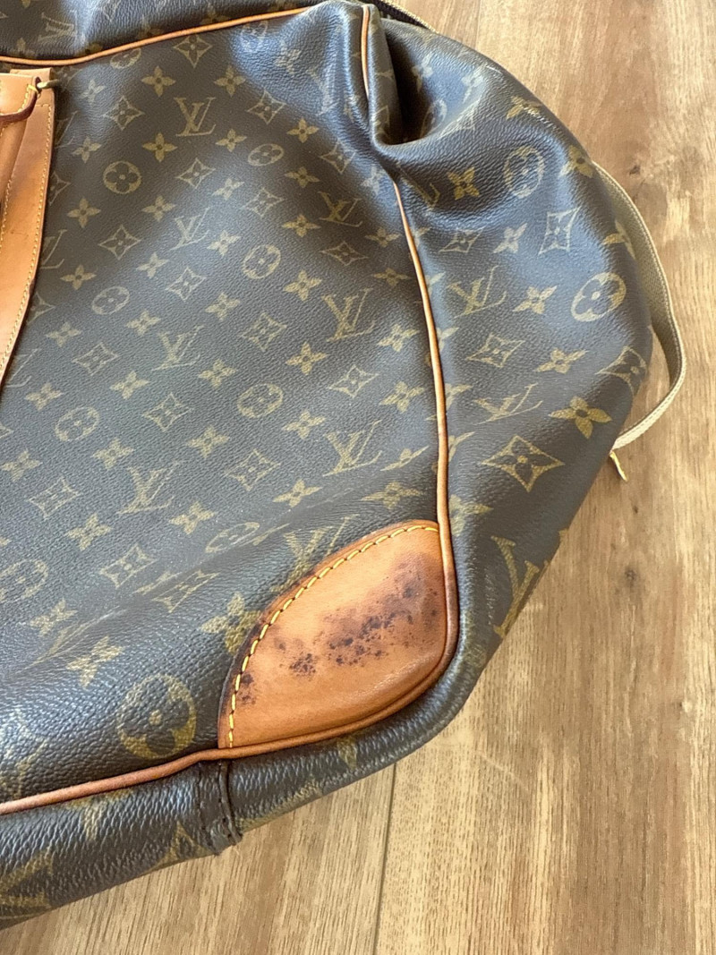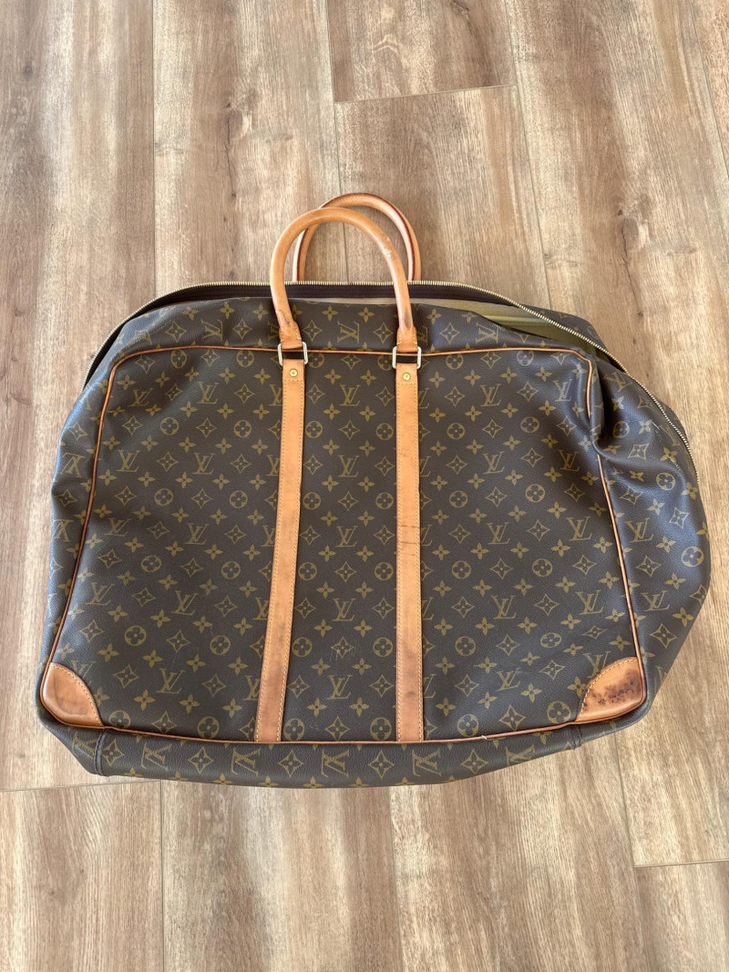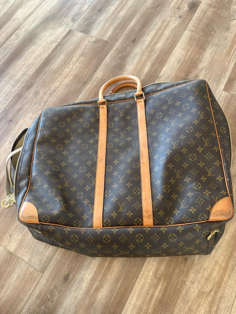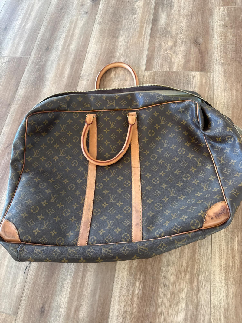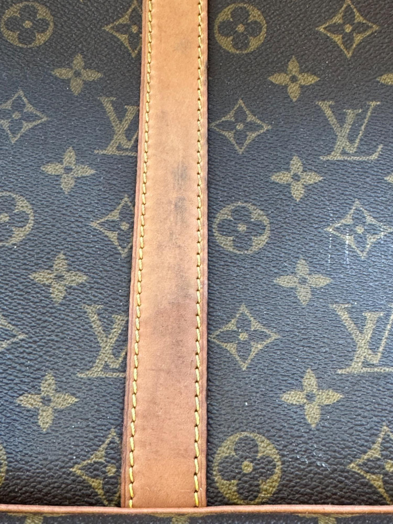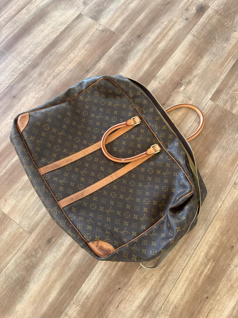 A true vintage Louis Vuitton travel bag, this piece hails from the golden age of jet-set chic. Crafted in the brand’s signature monogram canvas and trimmed in untreated vachetta leather, the bag showcases the rich patina and wear that collectors prize. The leather handles and corners bear the marks of authentic use—scuffs, darkening, and softening that speak to decades of stylish service. Brass hardware shows oxidation consistent with age, adding to its vintage charm. Condition Note:
