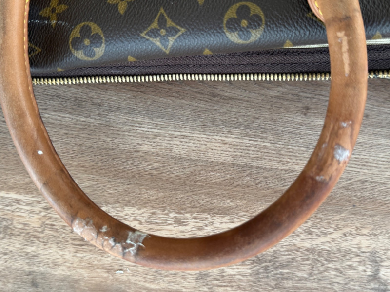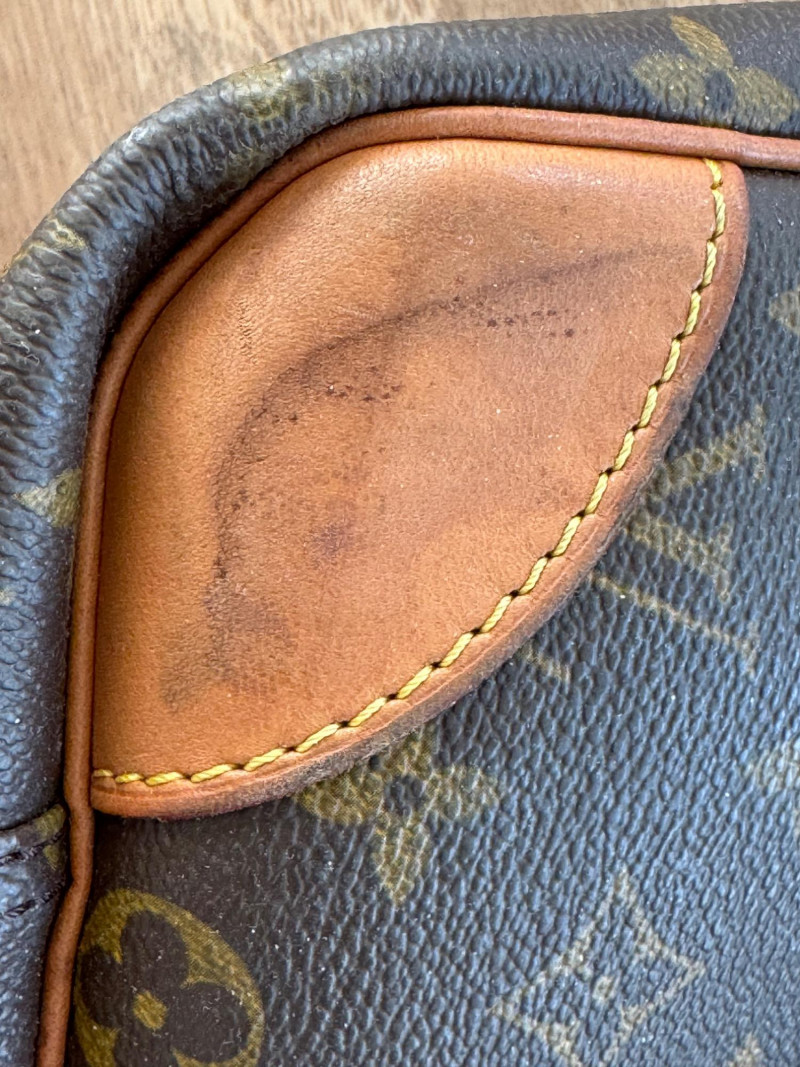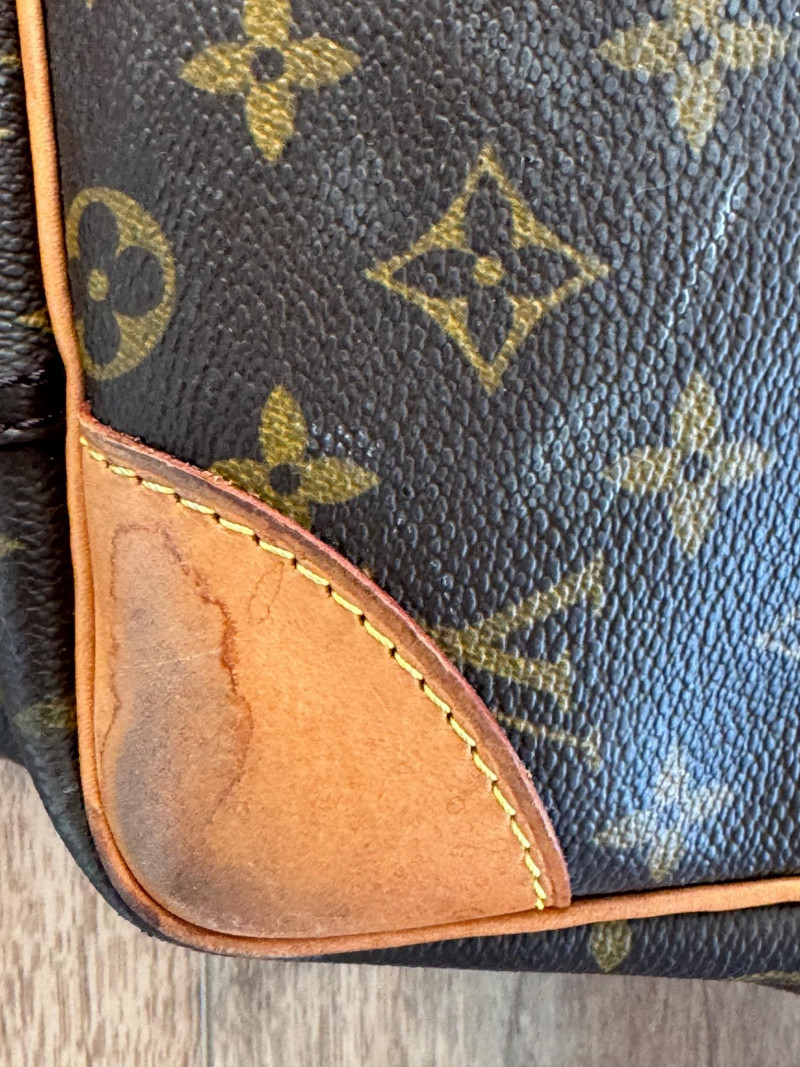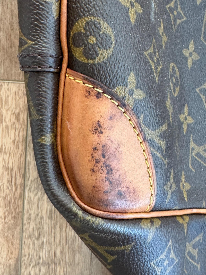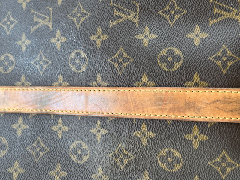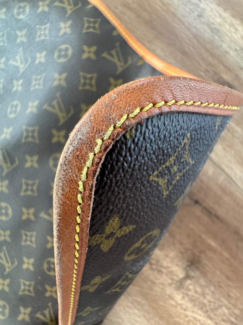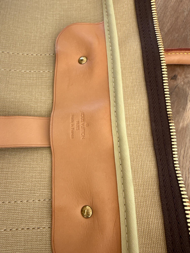 A true vintage Louis Vuitton travel bag, this piece hails from the golden age of jet-set chic. Crafted in the brand’s signature monogram canvas and trimmed in untreated vachetta leather, the bag showcases the rich patina and wear that collectors prize. The leather handles and corners bear the marks of authentic use—scuffs, darkening, and softening that speak to decades of stylish service. Brass hardware shows oxidation consistent with age, adding to its vintage charm. Condition Note: