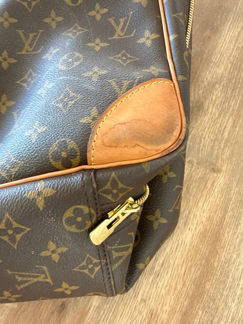 Features: Dual brass zipper closure with aged patina Reinforced leather corners and piping Rolled leather handles with deep honeyed patina and surface wear Classic LV monogram with quatrefoil and floral motifs Unlined interior with ample space for weekend travel or display Description: