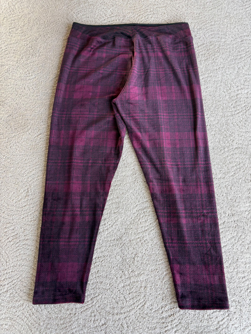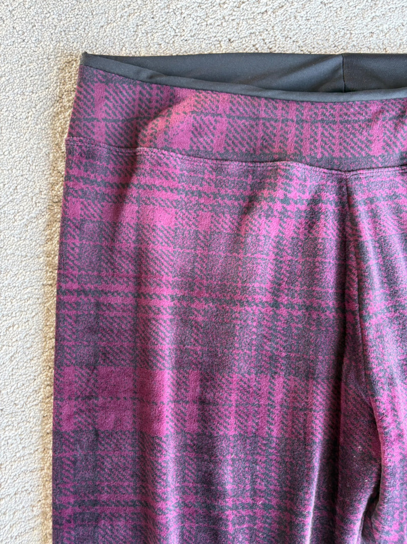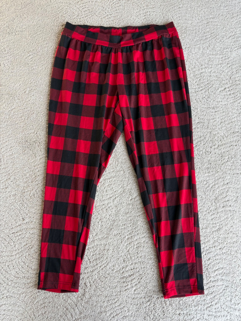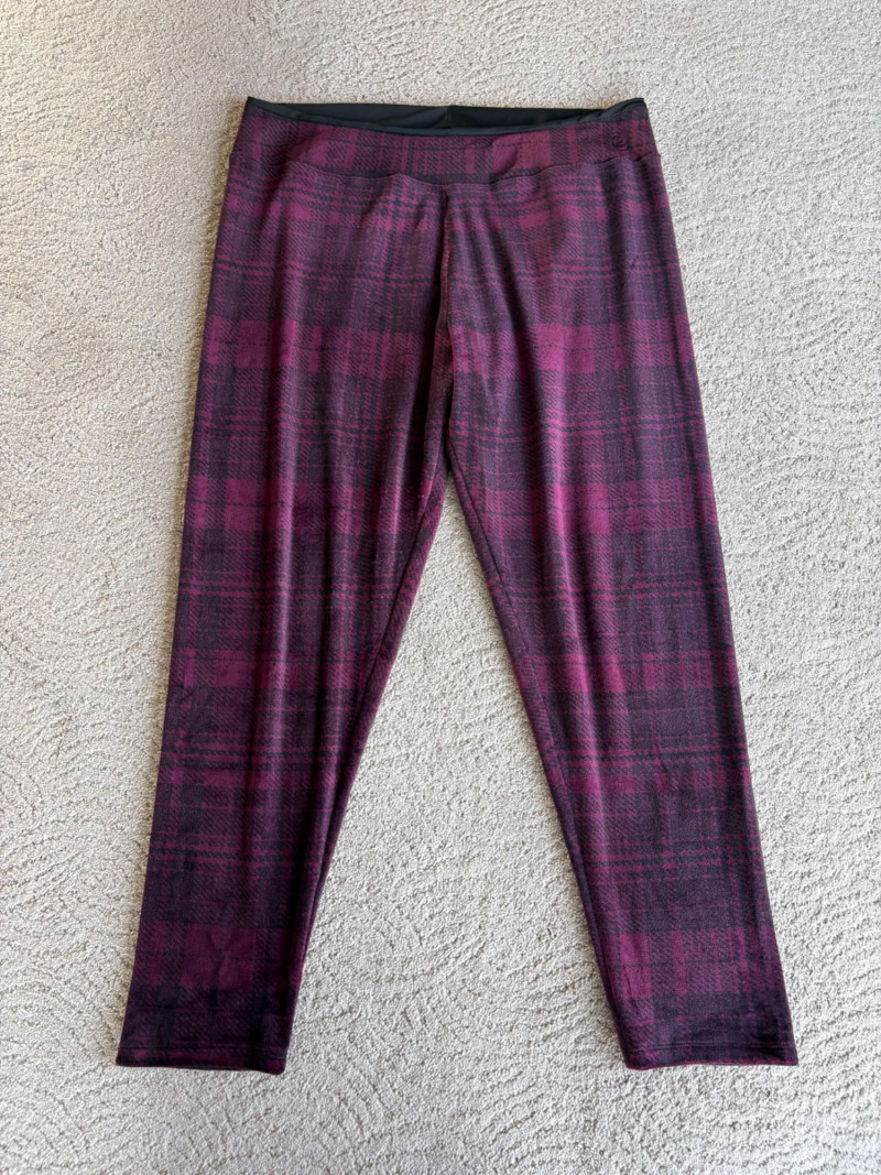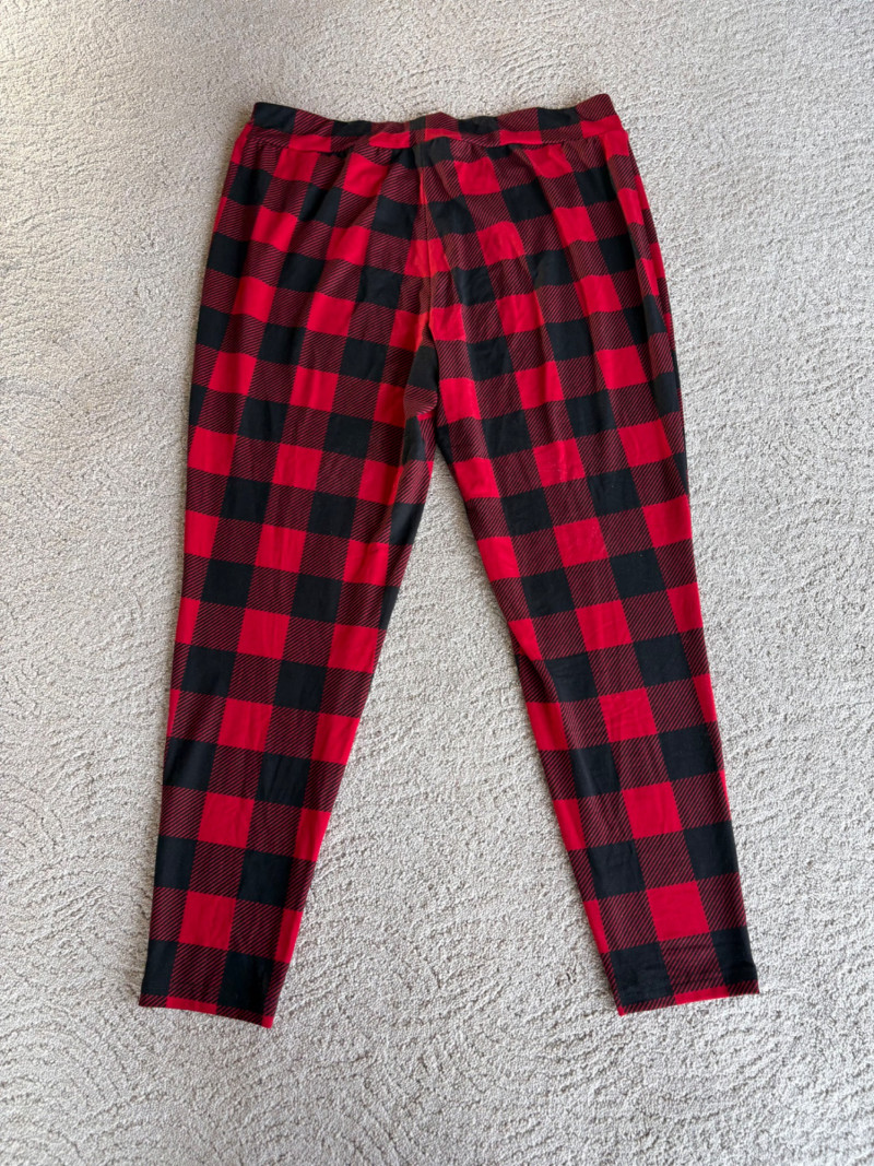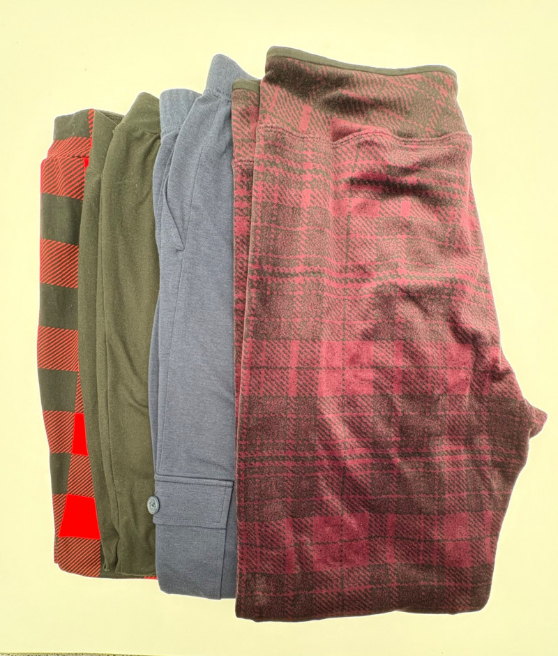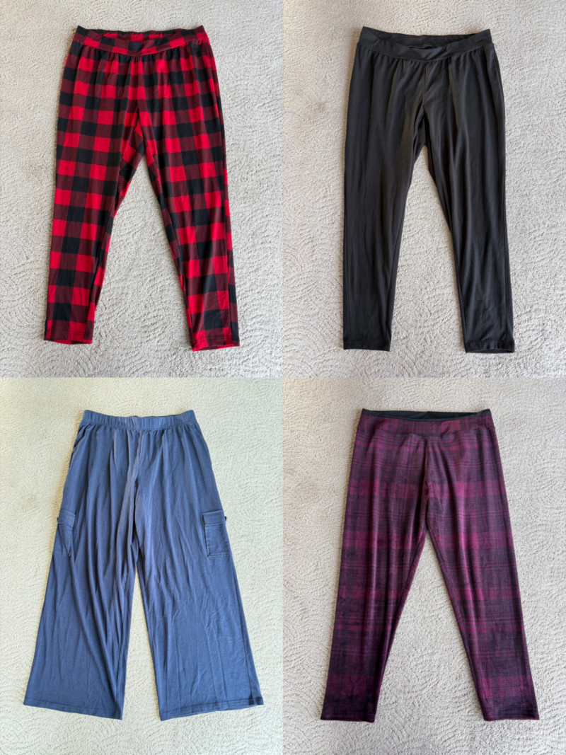 4 pairs of comfortable knit pants for hanging out at home on the sofa. All measure between 17" - 17.5" side to side at waist. Red plaid pants from Mukluks have flat elasticated waistband and tapered legs in incredibly soft fabric. Polyester/spandex blend. Size tag says 1X. They look more like a L. Black pants from Mukluks have flat elasticated waistband and tapered legs. Polyester/spandex blend. Size tag says 1X, but they look a bit smaller. Navy blue pants from D&Co have elasticated waistband, set-in front pockets, cargo pockets on the thighs, and straight legs. Cotton/rayon/spandex blend. Size tag says L. Black and purple plaid pair from Cuddle Duds have wide stretch waistband and tapered legs. Polyester/spandex blend. Size tag says XL.