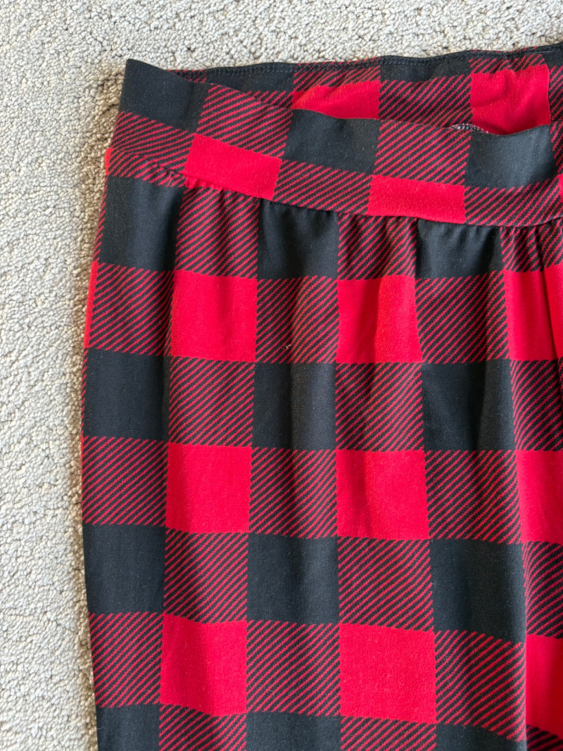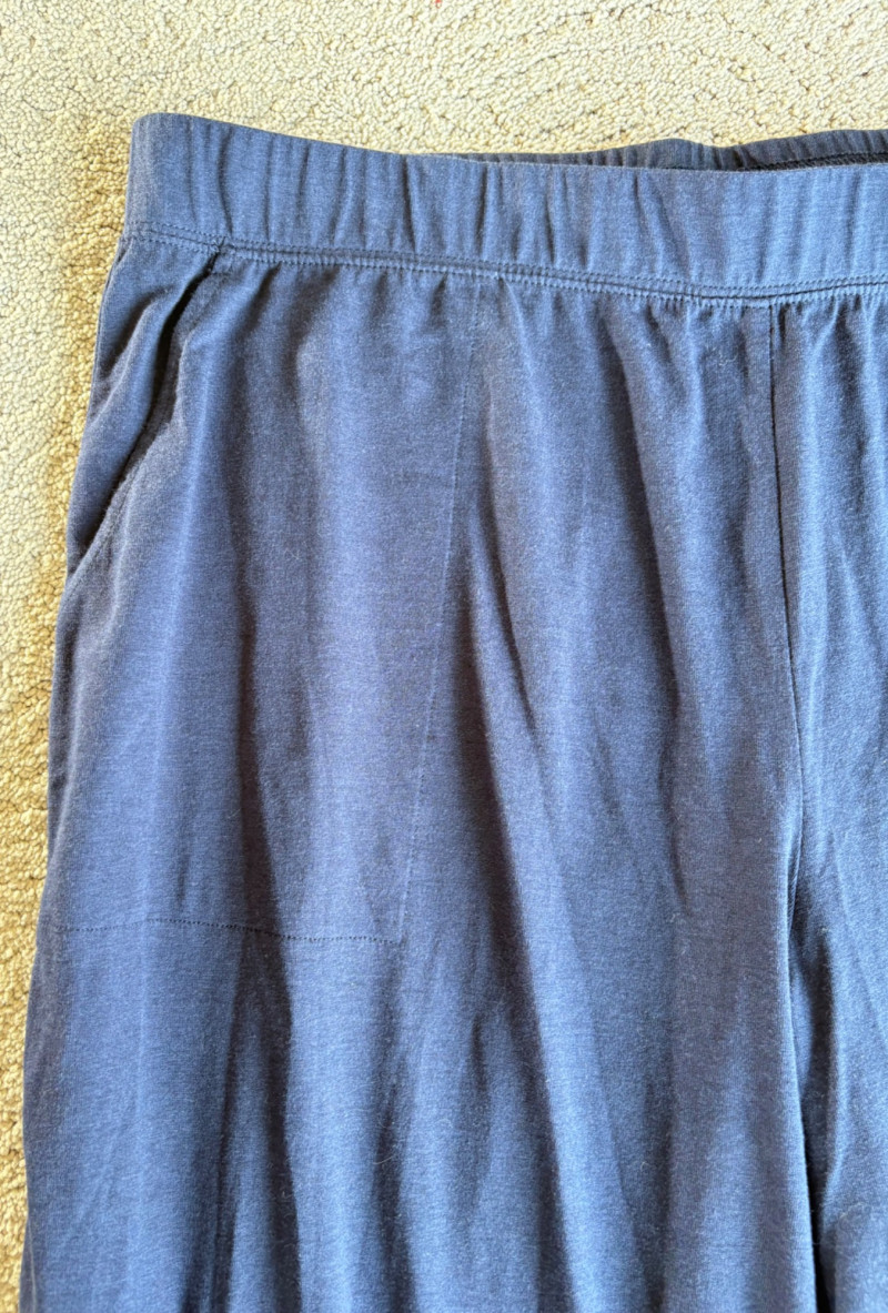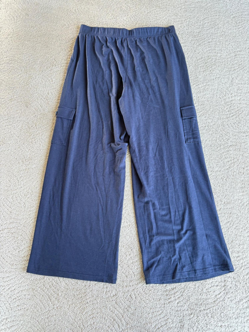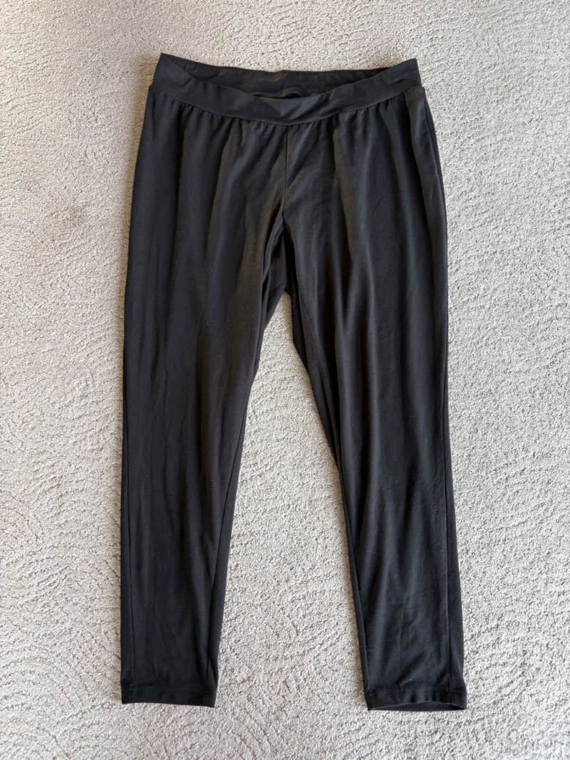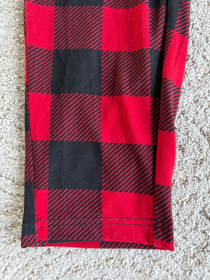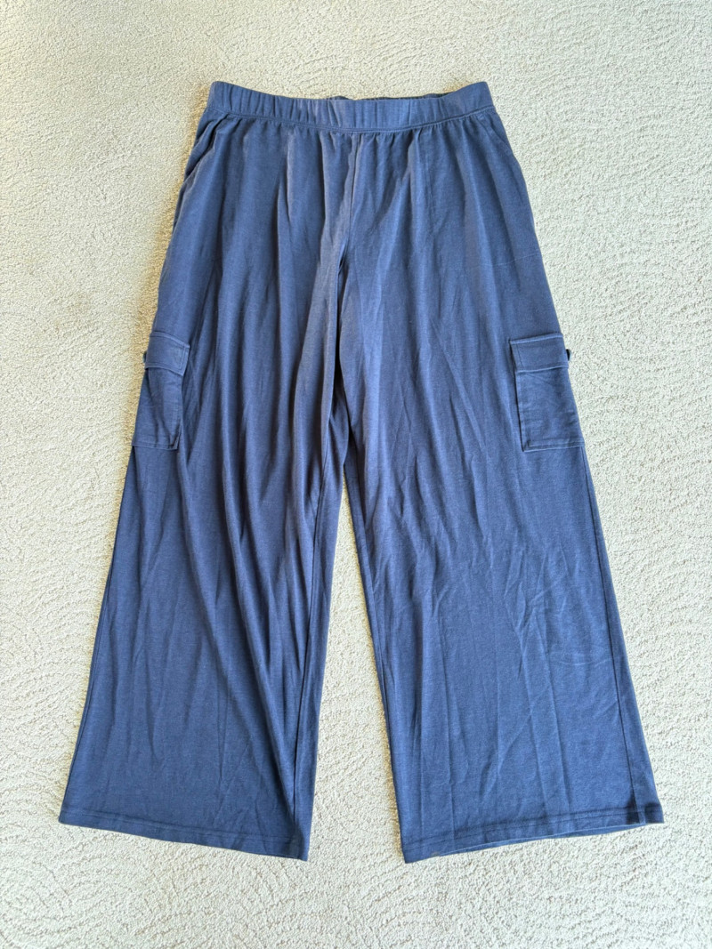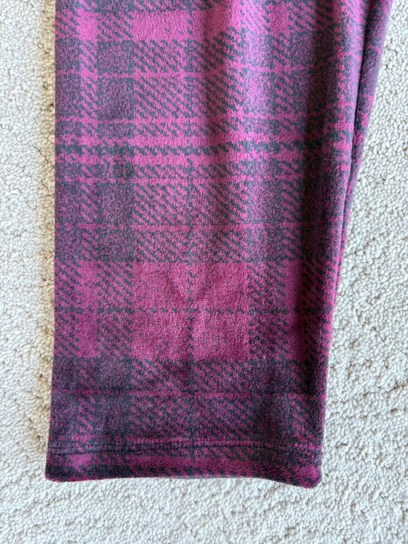 4 pairs of comfortable knit pants for hanging out at home on the sofa. All measure between 17" - 17.5" side to side at waist. Red plaid pants from Mukluks have flat elasticated waistband and tapered legs in incredibly soft fabric. Polyester/spandex blend. Size tag says 1X. They look more like a L. Black pants from Mukluks have flat elasticated waistband and tapered legs. Polyester/spandex blend. Size tag says 1X, but they look a bit smaller. Navy blue pants from D&Co have elasticated waistband, set-in front pockets, cargo pockets on the thighs, and straight legs. Cotton/rayon/spandex blend. Size tag says L. Black and purple plaid pair from Cuddle Duds have wide stretch waistband and tapered legs. Polyester/spandex blend. Size tag says XL.