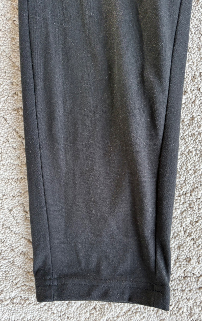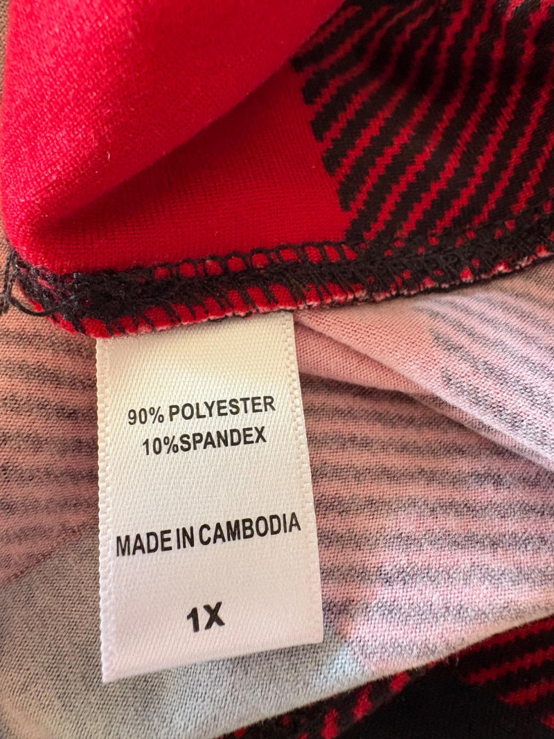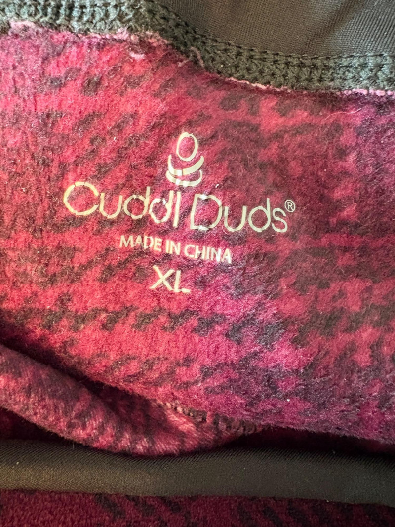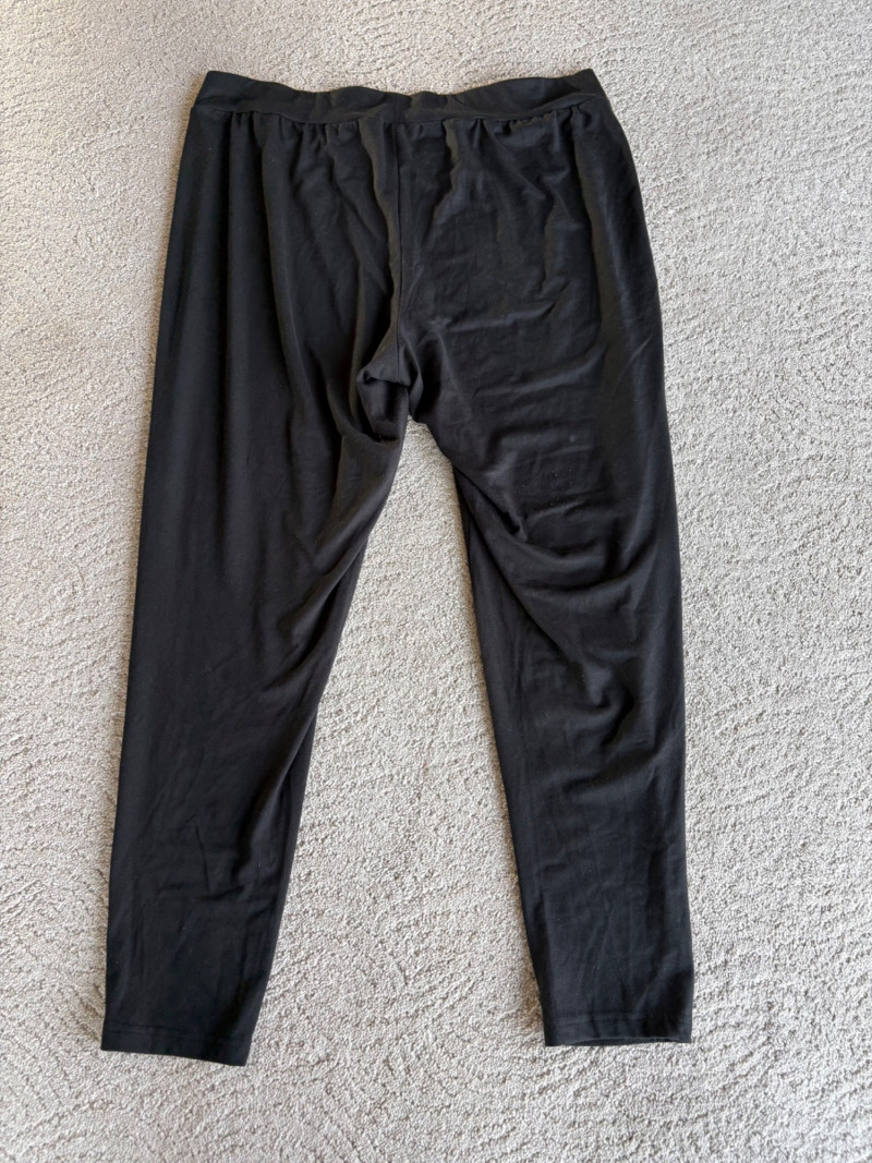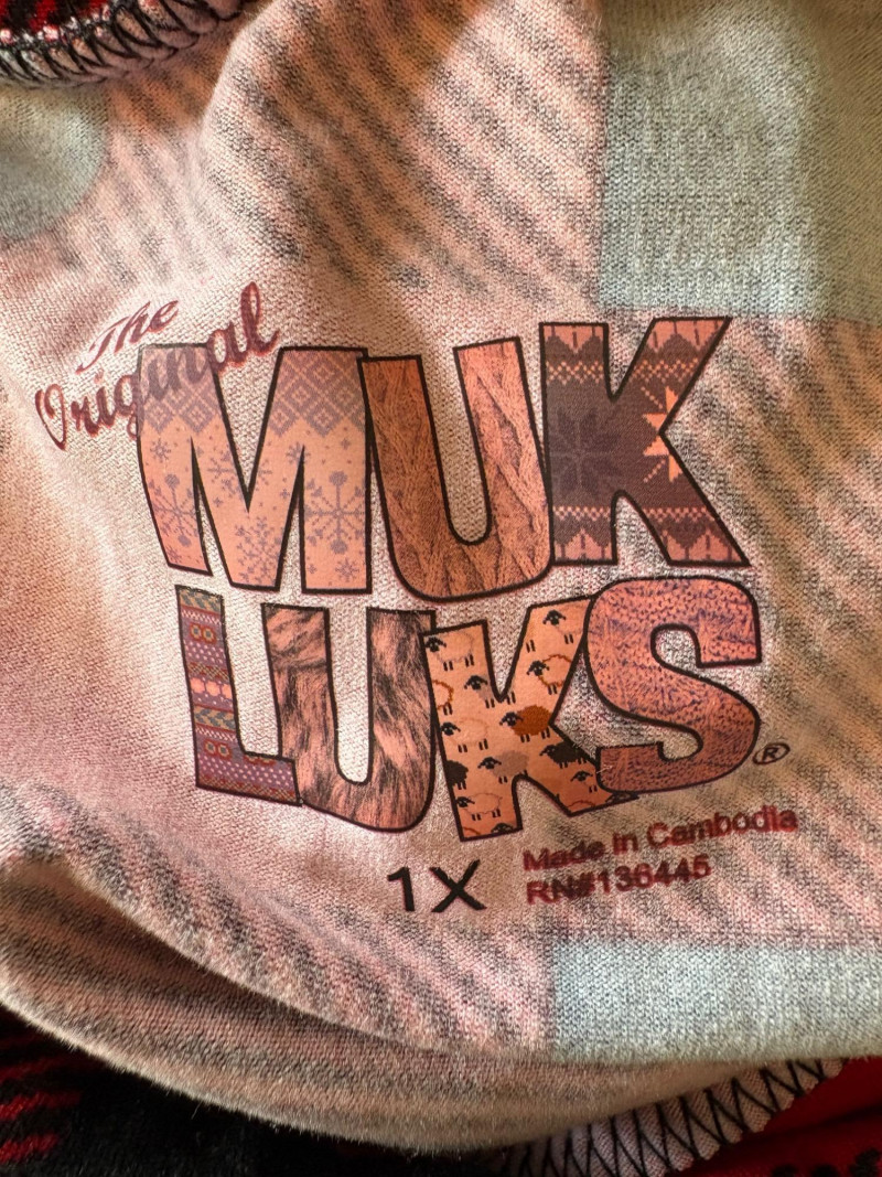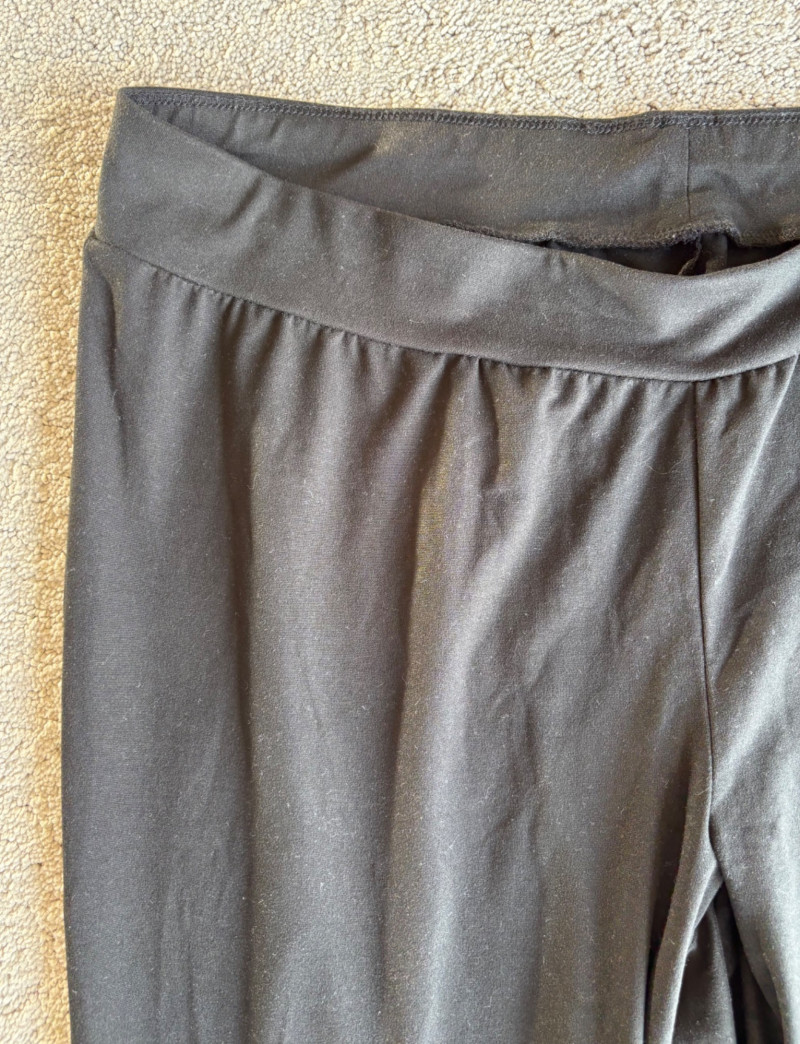 4 pairs of comfortable knit pants for hanging out at home on the sofa. All measure between 17" - 17.5" side to side at waist. Red plaid pants from Mukluks have flat elasticated waistband and tapered legs in incredibly soft fabric. Polyester/spandex blend. Size tag says 1X. They look more like a L. Black pants from Mukluks have flat elasticated waistband and tapered legs. Polyester/spandex blend. Size tag says 1X, but they look a bit smaller. Navy blue pants from D&Co have elasticated waistband, set-in front pockets, cargo pockets on the thighs, and straight legs. Cotton/rayon/spandex blend. Size tag says L. Black and purple plaid pair from Cuddle Duds have wide stretch waistband and tapered legs. Polyester/spandex blend. Size tag says XL.