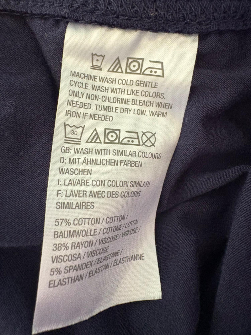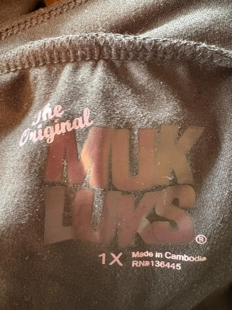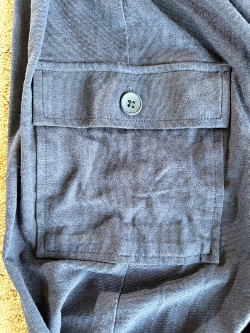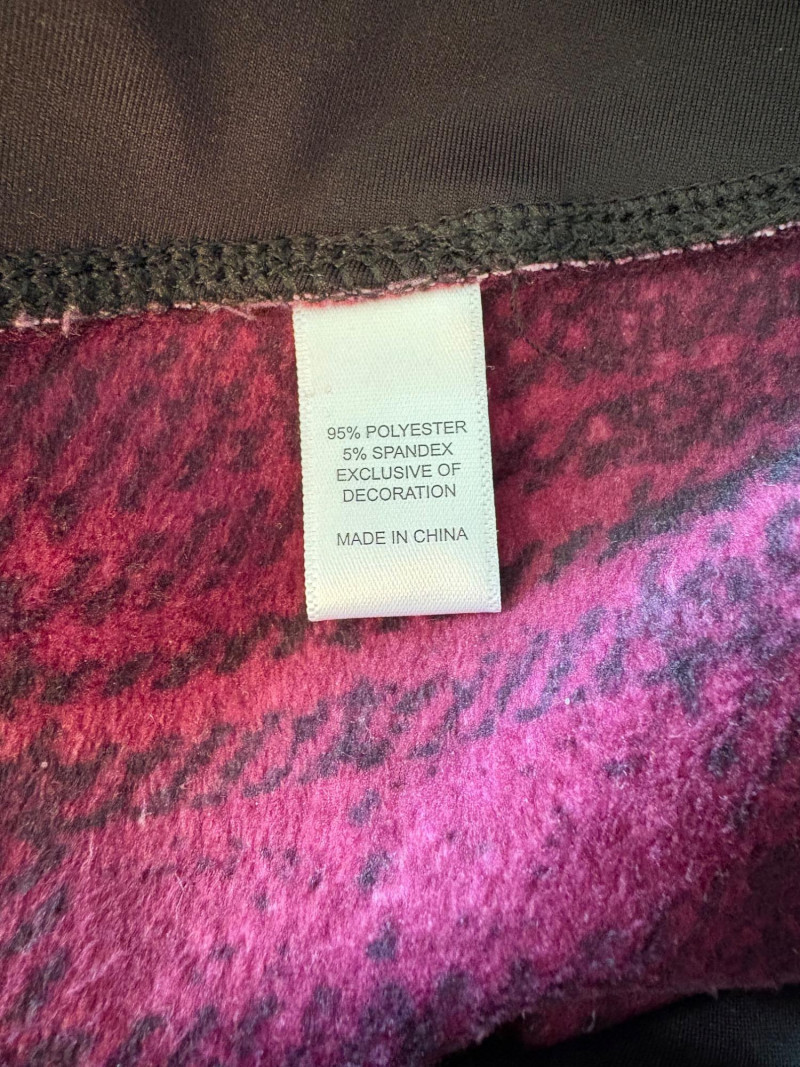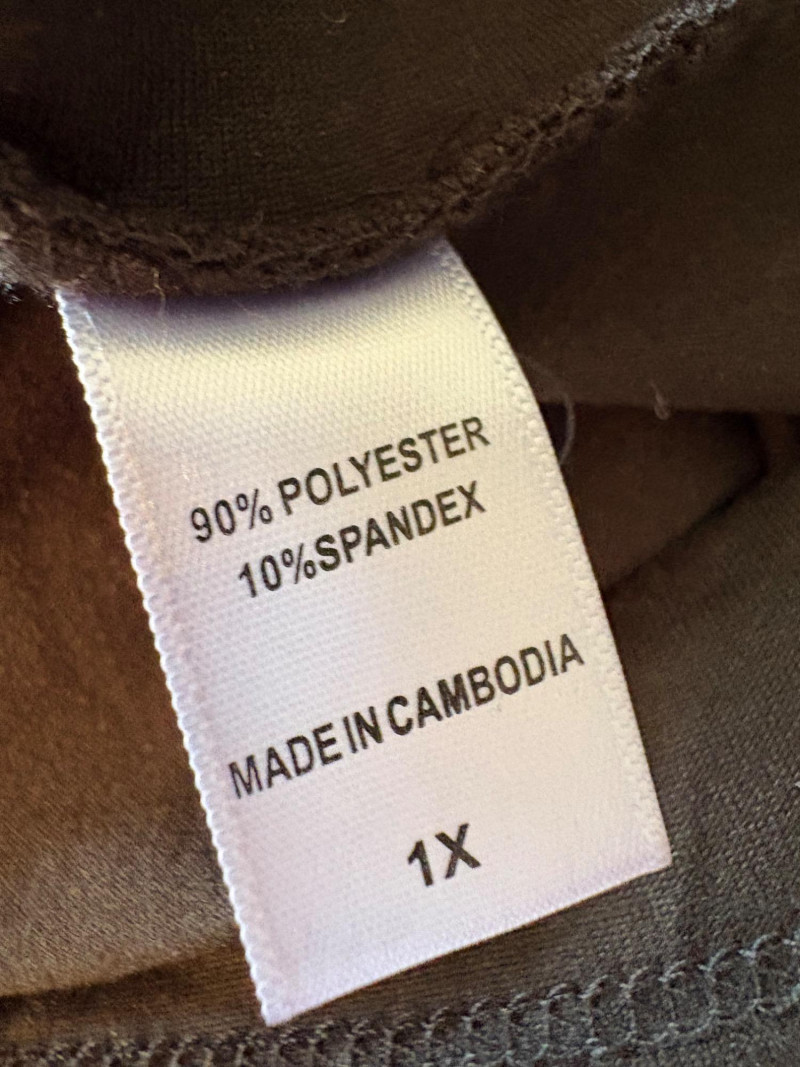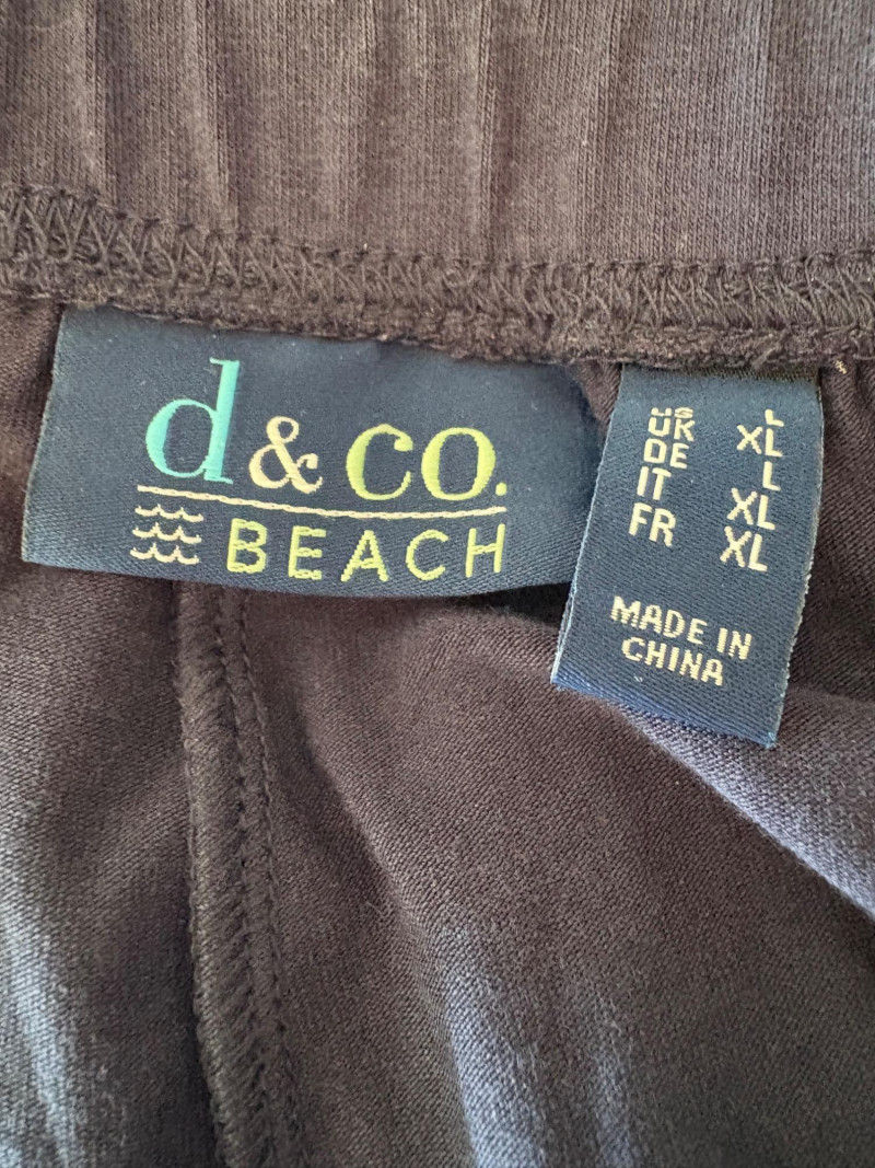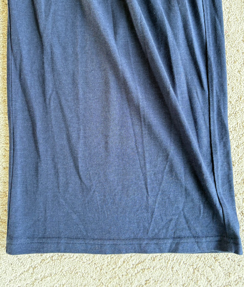 4 pairs of comfortable knit pants for hanging out at home on the sofa. All measure between 17" - 17.5" side to side at waist. Red plaid pants from Mukluks have flat elasticated waistband and tapered legs in incredibly soft fabric. Polyester/spandex blend. Size tag says 1X. They look more like a L. Black pants from Mukluks have flat elasticated waistband and tapered legs. Polyester/spandex blend. Size tag says 1X, but they look a bit smaller. Navy blue pants from D&Co have elasticated waistband, set-in front pockets, cargo pockets on the thighs, and straight legs. Cotton/rayon/spandex blend. Size tag says L. Black and purple plaid pair from Cuddle Duds have wide stretch waistband and tapered legs. Polyester/spandex blend. Size tag says XL.
