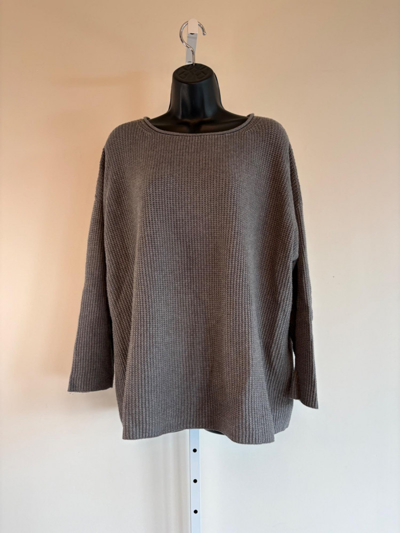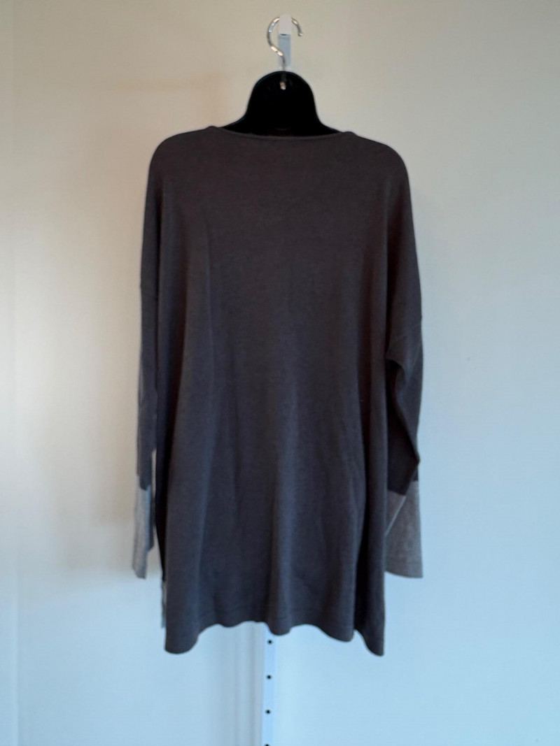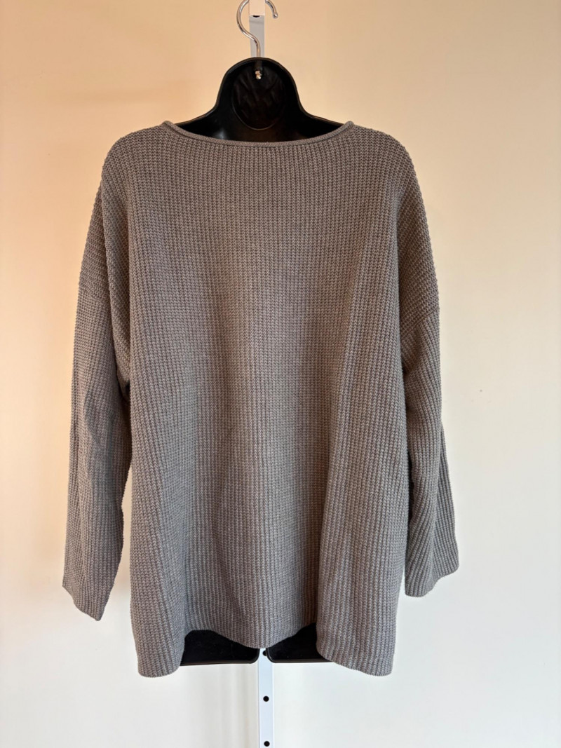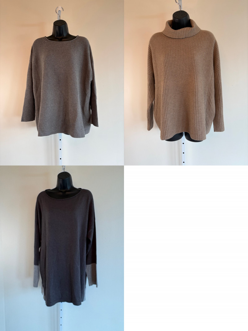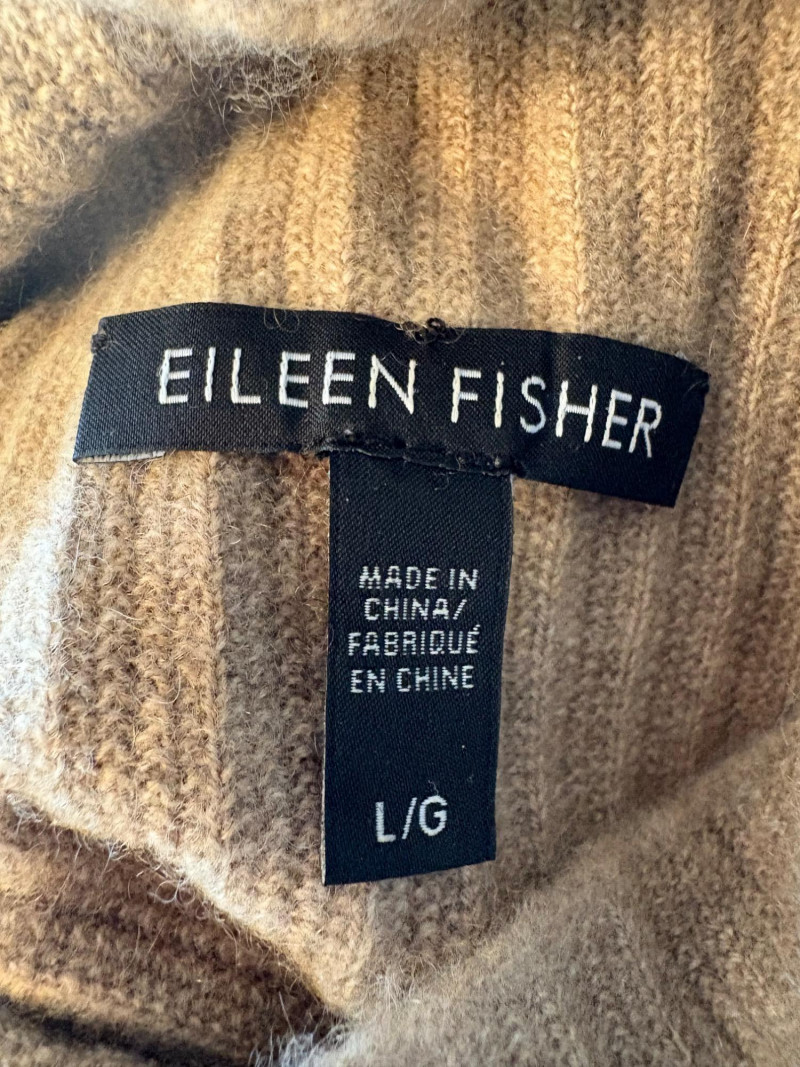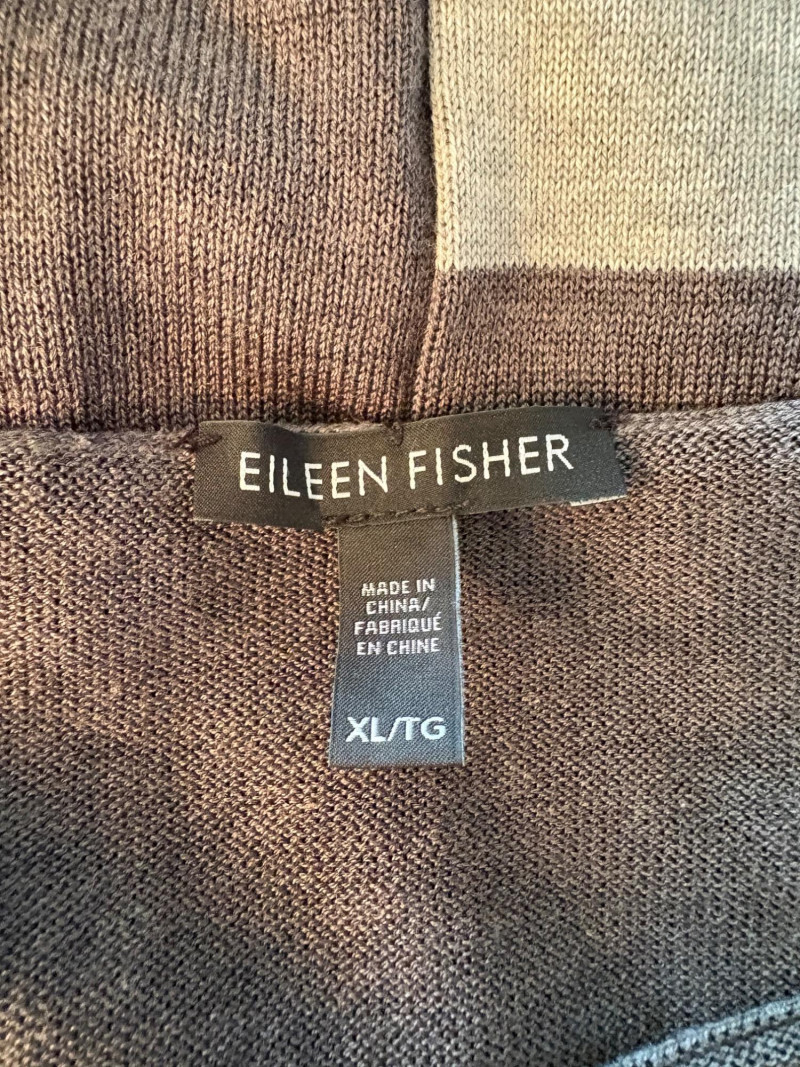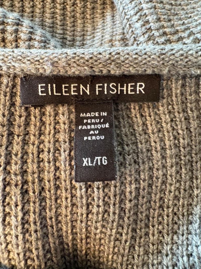 3 neutral tone sweaters from Eileen Fisher. All measure 26" pit to pit. Grey textured sweater has dropped shoulder seams, three-quarter sleeves, and rolled finish on neckline. 100% organic cotton. Size tag says XL. Brown/taupe ribbed sweater has dropped shoulder seams and turtleneck. 100% cashmere. Size tag says L. Smooth grey sweater/tunic has dark grey body with light grey lower sleeves and split hem inserts. Round neckline, dropped shoulder seams, and a little more length than most sweaters (30"). Ribbed bottom hem and sleeve cuffs with rolled finish on neckline. Lyocell/organic cotton/silk blend. Size tag says XL.