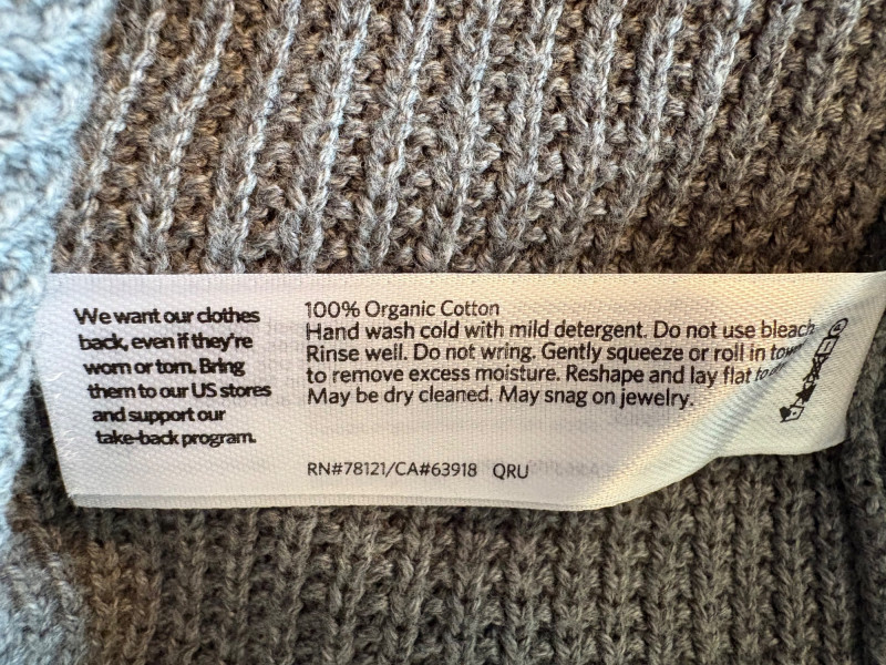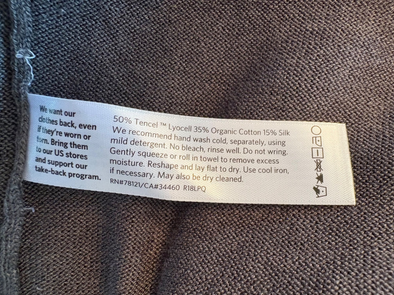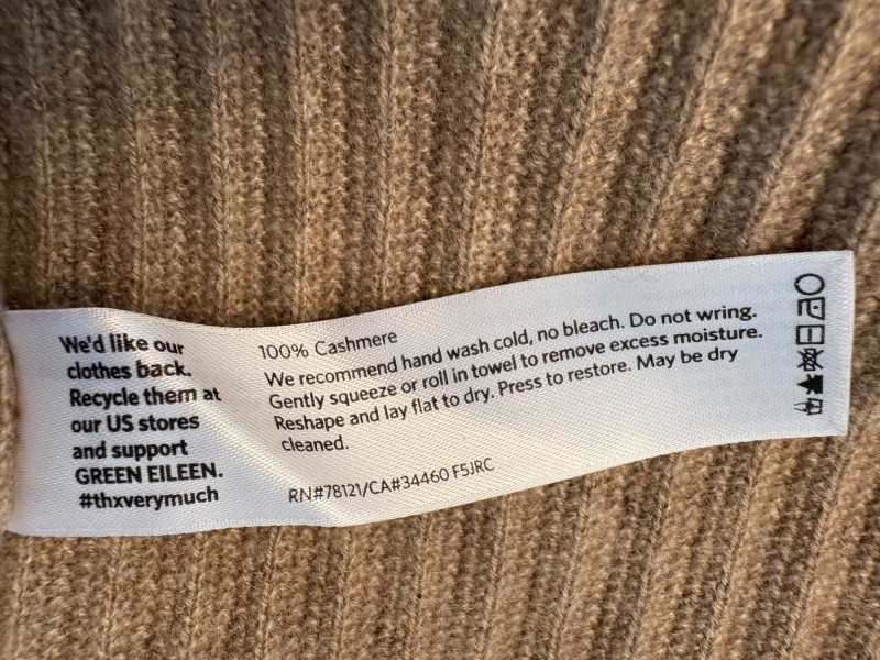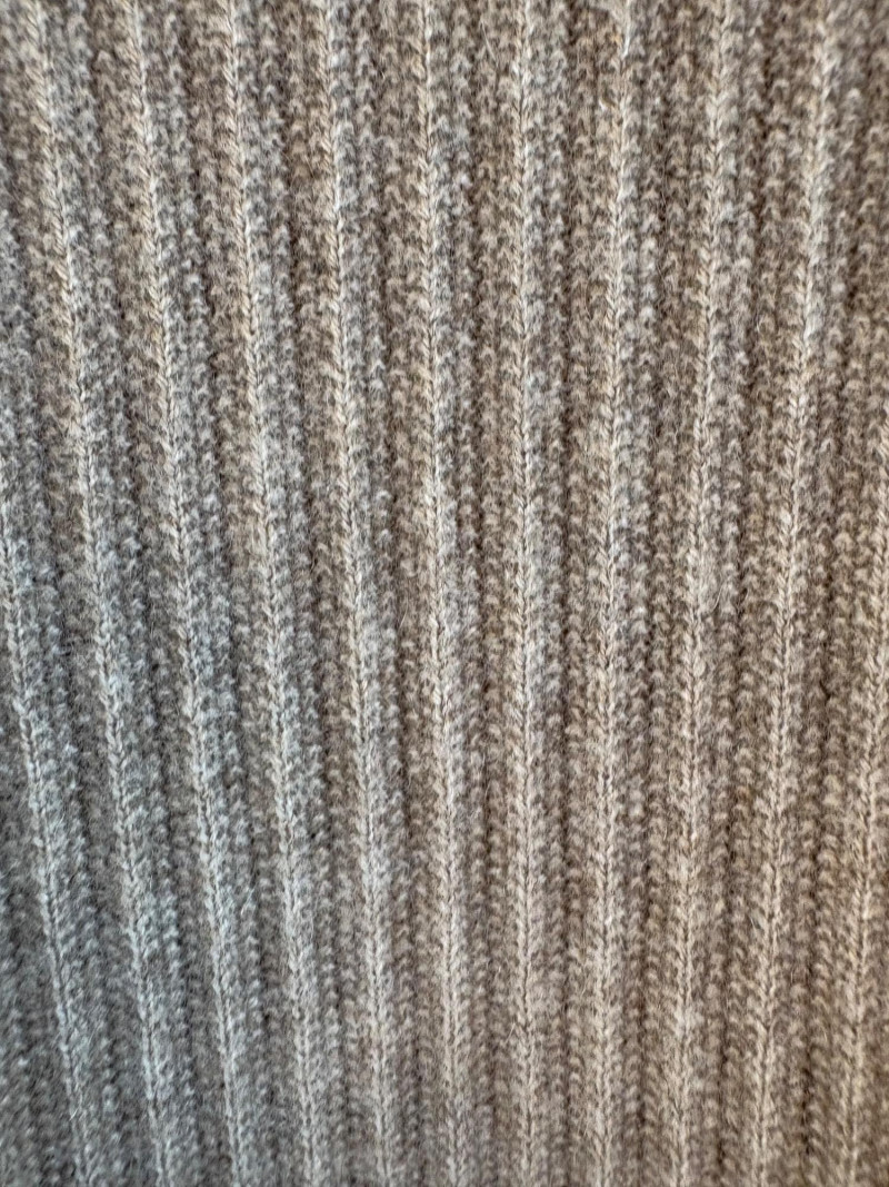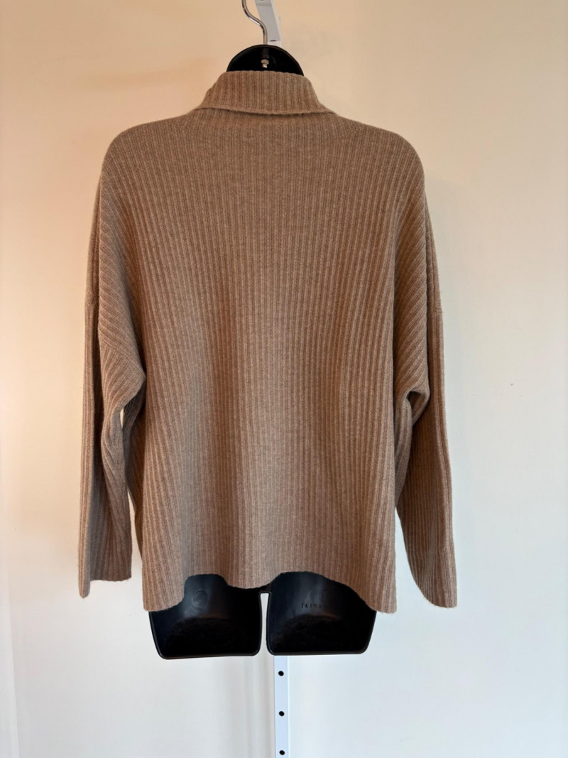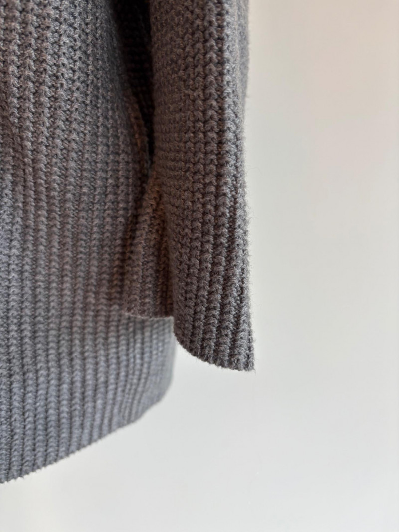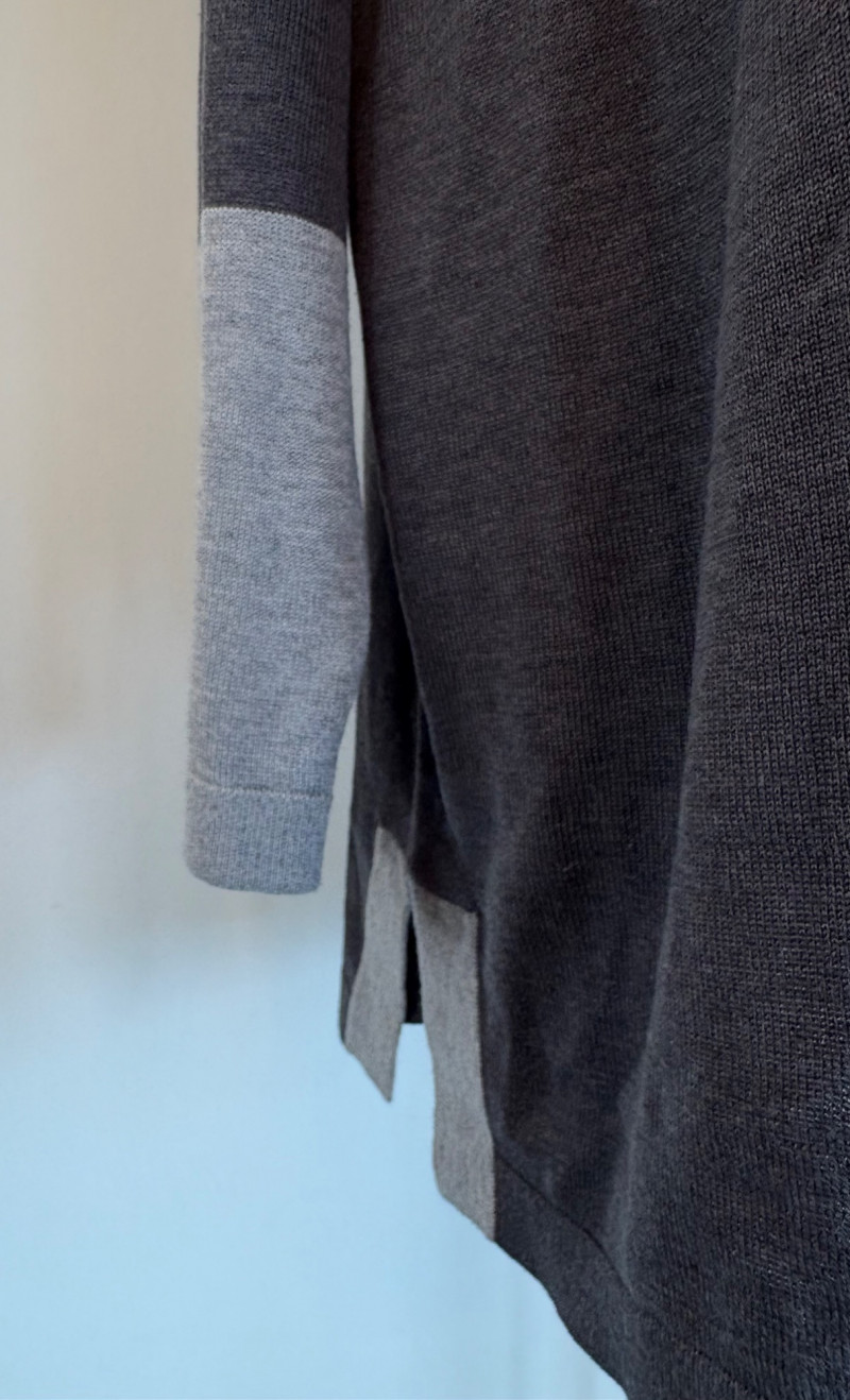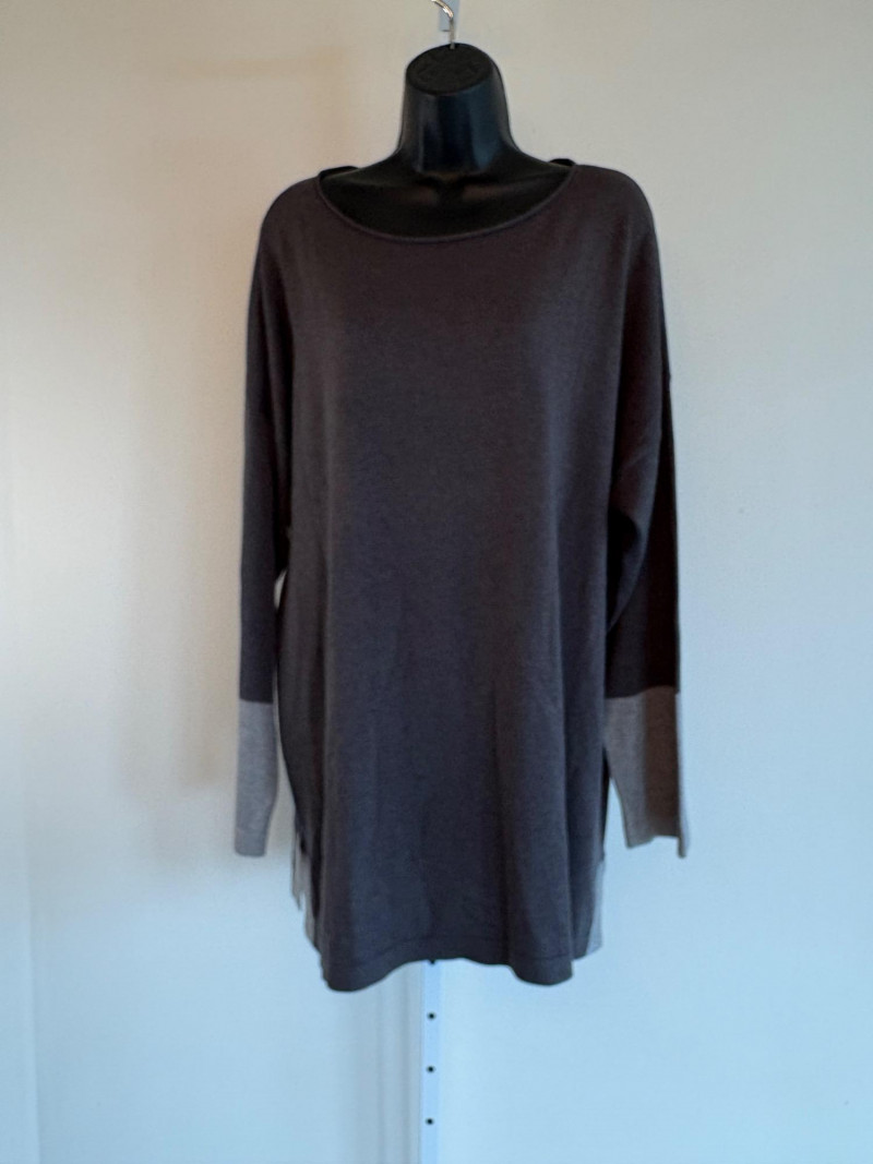 3 neutral tone sweaters from Eileen Fisher. All measure 26" pit to pit. Grey textured sweater has dropped shoulder seams, three-quarter sleeves, and rolled finish on neckline. 100% organic cotton. Size tag says XL. Brown/taupe ribbed sweater has dropped shoulder seams and turtleneck. 100% cashmere. Size tag says L. Smooth grey sweater/tunic has dark grey body with light grey lower sleeves and split hem inserts. Round neckline, dropped shoulder seams, and a little more length than most sweaters (30"). Ribbed bottom hem and sleeve cuffs with rolled finish on neckline. Lyocell/organic cotton/silk blend. Size tag says XL.