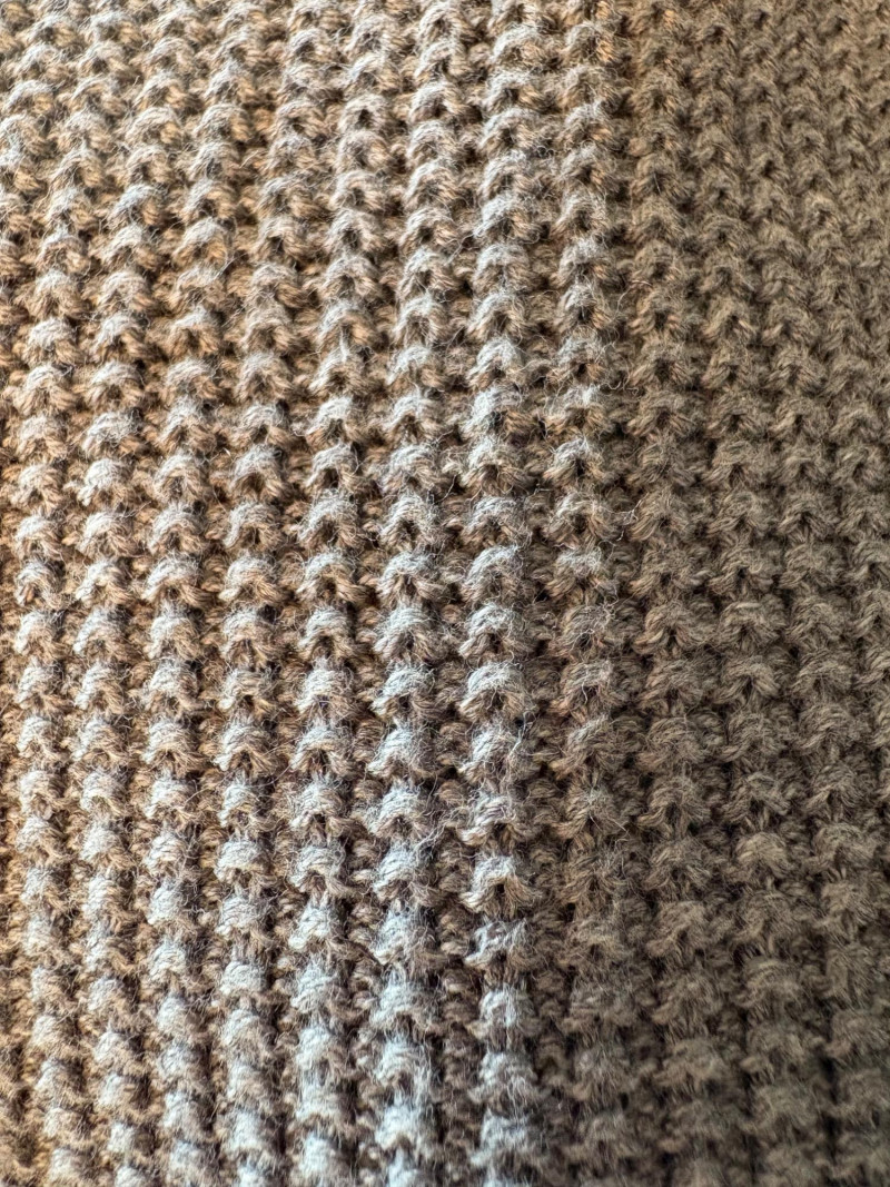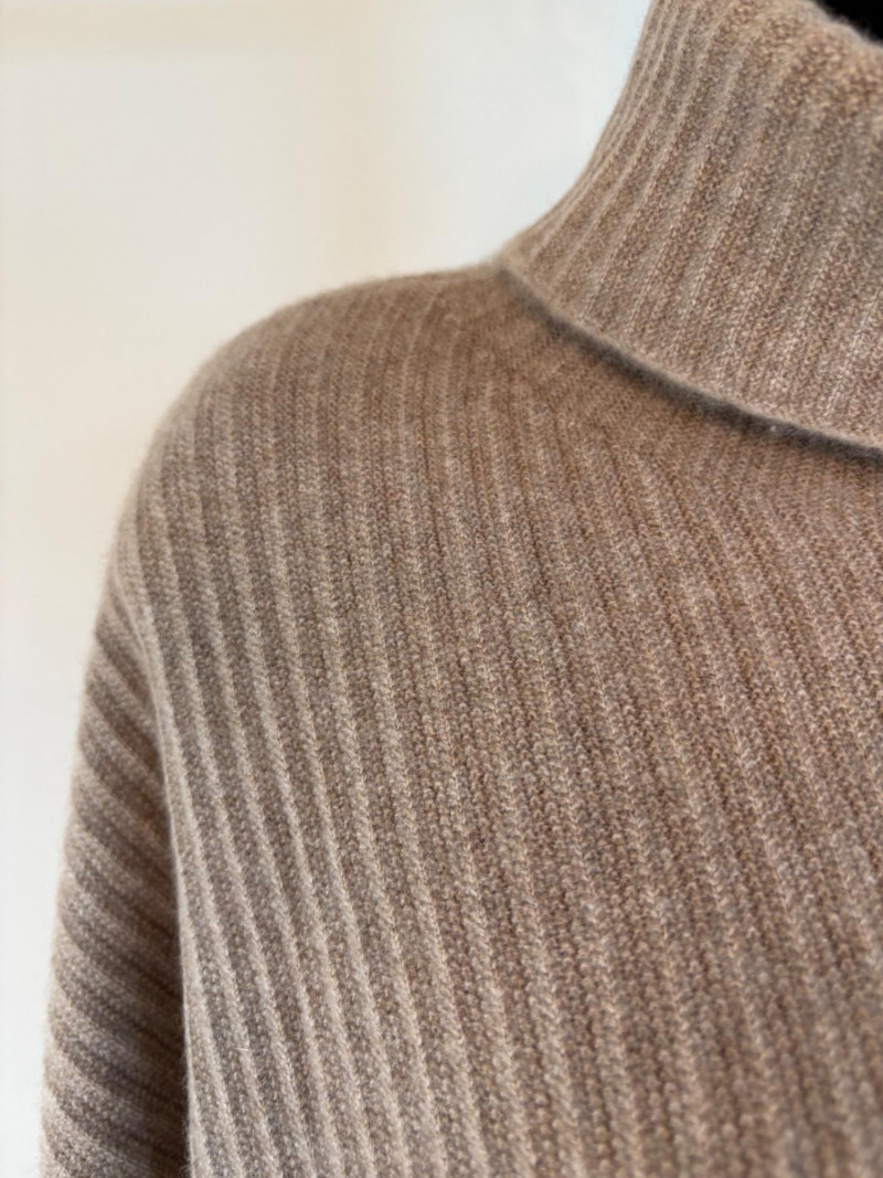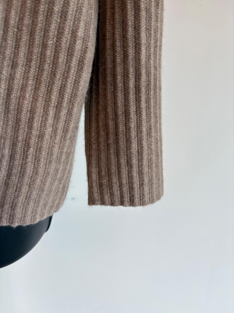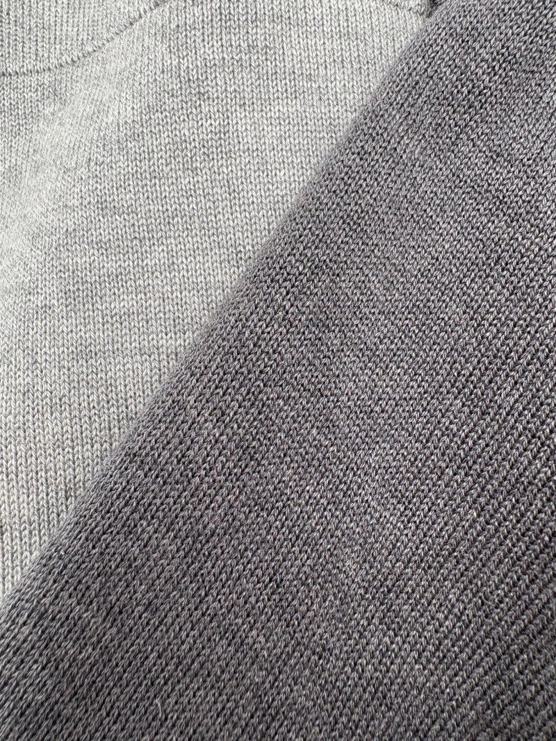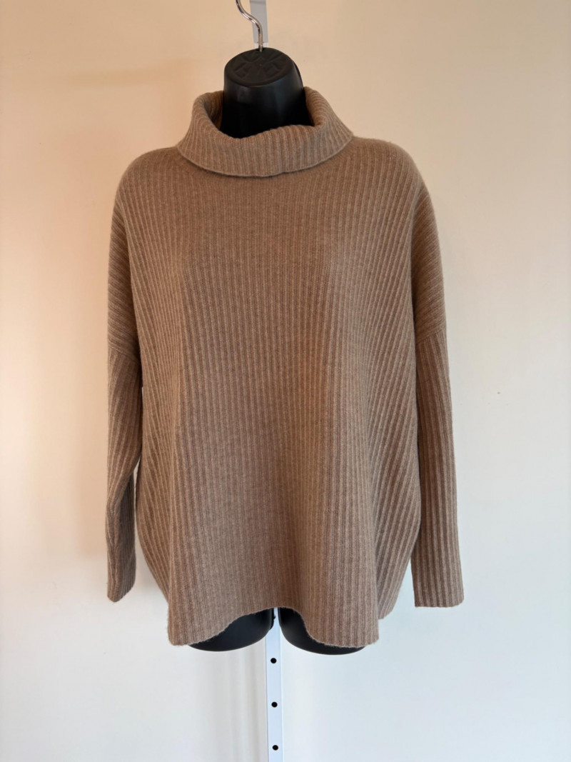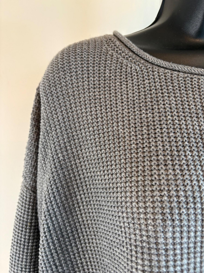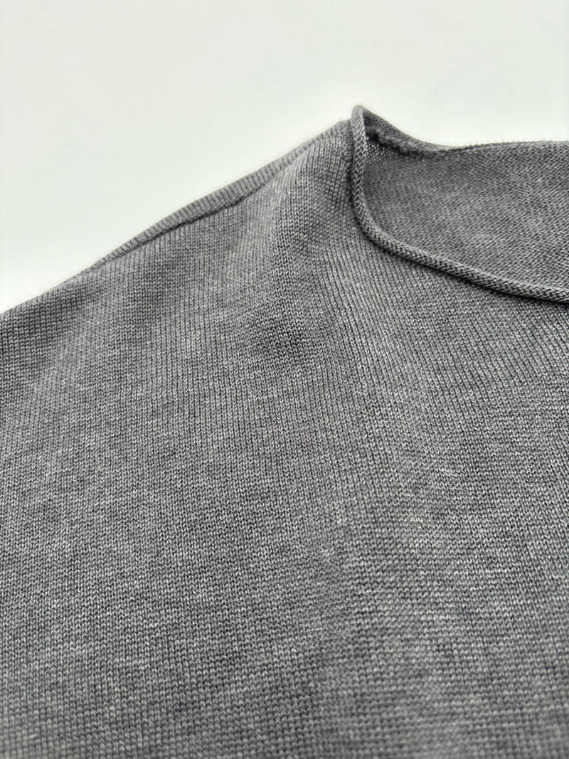 3 neutral tone sweaters from Eileen Fisher. All measure 26" pit to pit. Grey textured sweater has dropped shoulder seams, three-quarter sleeves, and rolled finish on neckline. 100% organic cotton. Size tag says XL. Brown/taupe ribbed sweater has dropped shoulder seams and turtleneck. 100% cashmere. Size tag says L. Smooth grey sweater/tunic has dark grey body with light grey lower sleeves and split hem inserts. Round neckline, dropped shoulder seams, and a little more length than most sweaters (30"). Ribbed bottom hem and sleeve cuffs with rolled finish on neckline. Lyocell/organic cotton/silk blend. Size tag says XL.