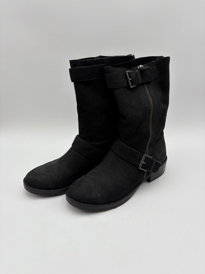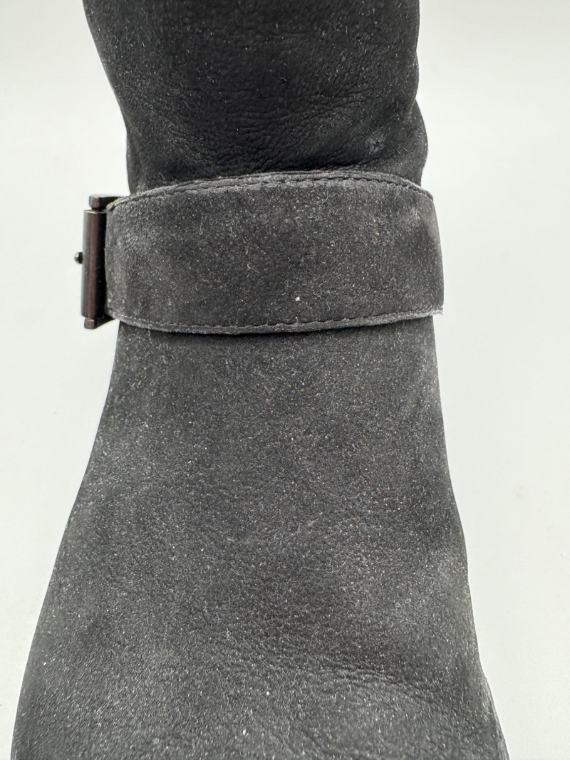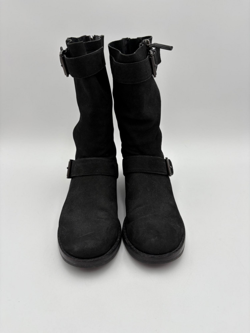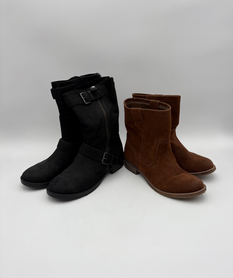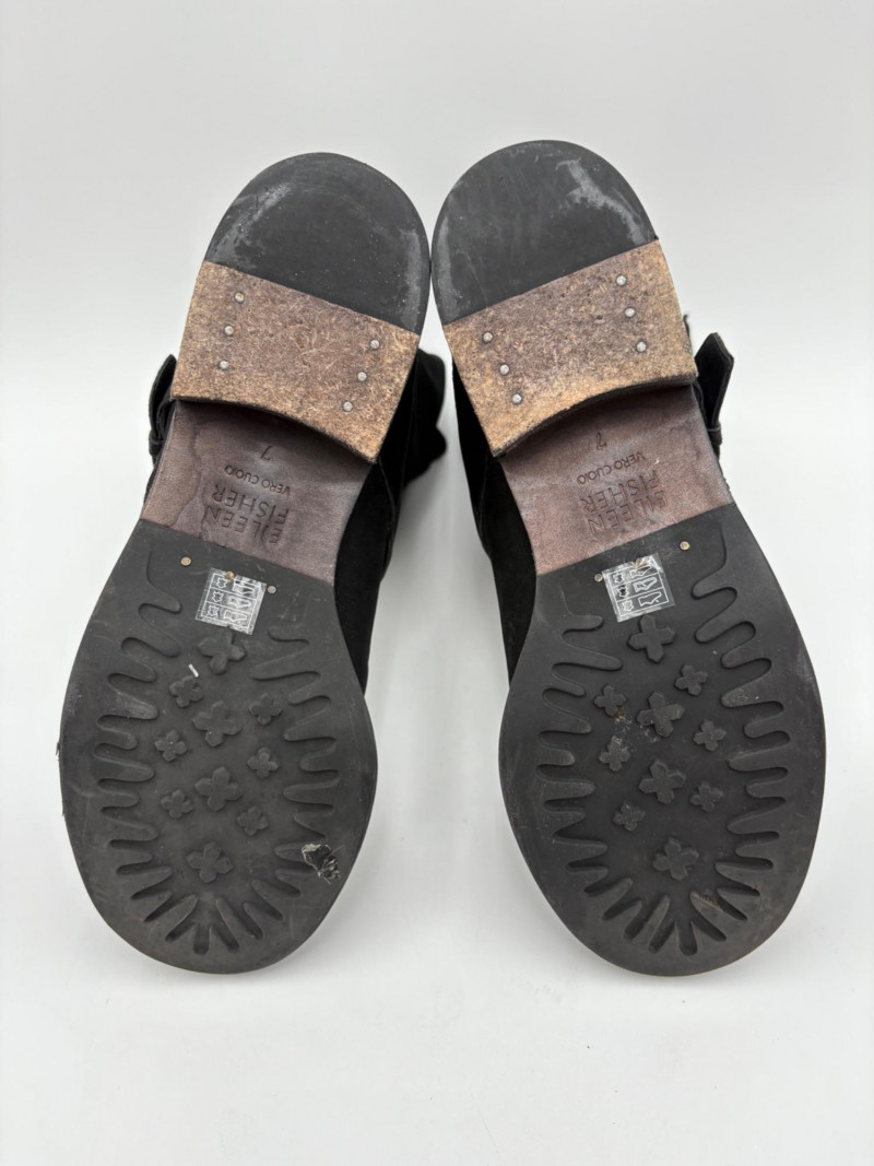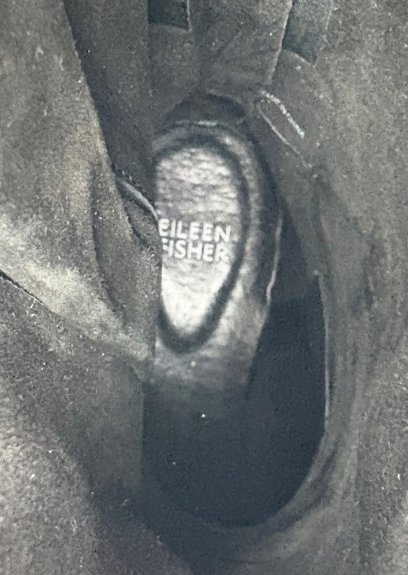 Eileen Fisher black suede engineer-style boots with back & side zips, stacked heel, and buckle detailing. Size 7. Diba brown ankle boots with stacked heel and top tabs (no material tag, but the brand usually works with leather). No size found, but probably a 7 or 7.5 given client's shoe size.
