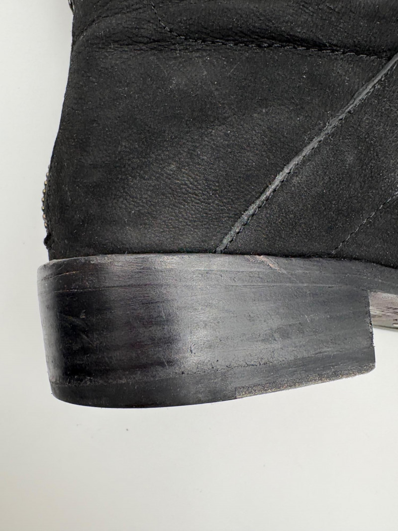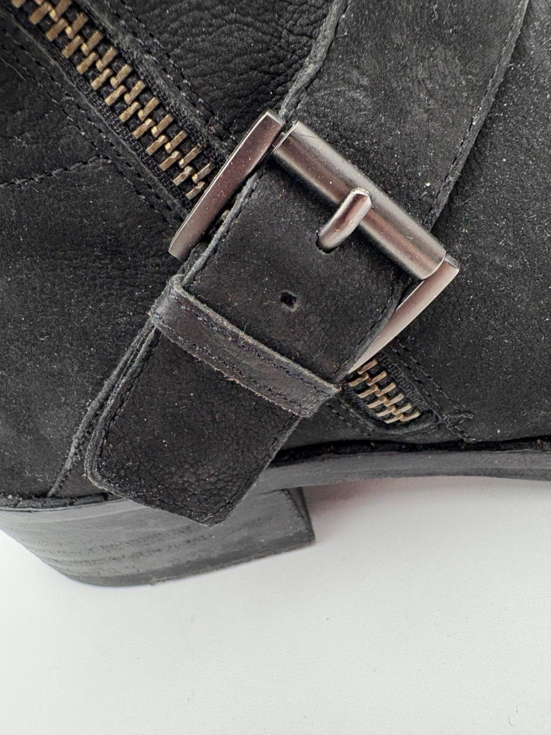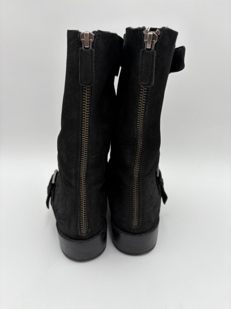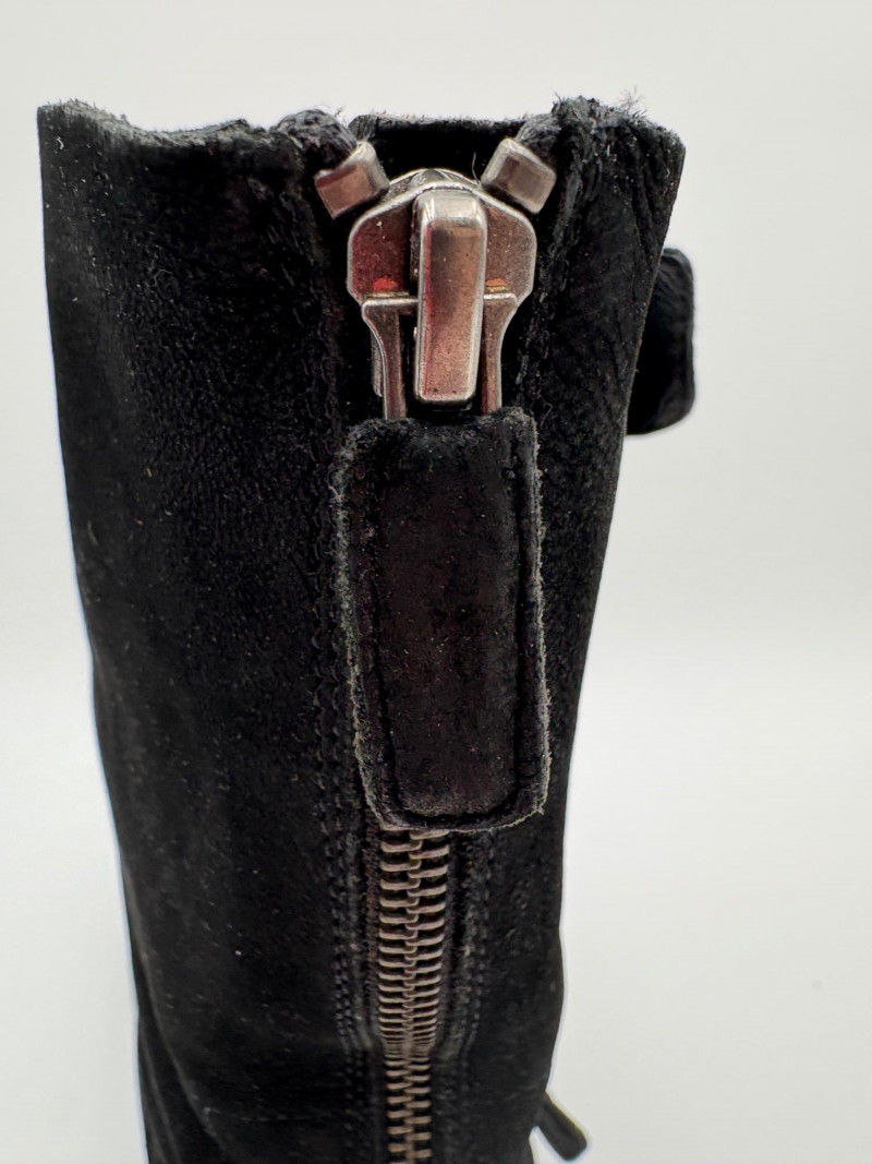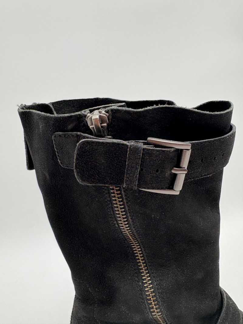 Eileen Fisher black suede engineer-style boots with back & side zips, stacked heel, and buckle detailing. Size 7. Diba brown ankle boots with stacked heel and top tabs (no material tag, but the brand usually works with leather). No size found, but probably a 7 or 7.5 given client's shoe size.