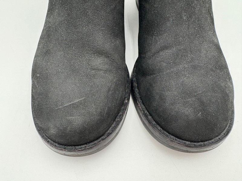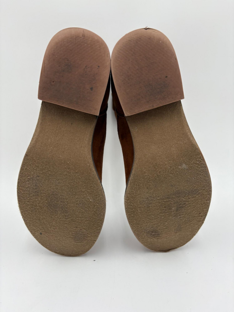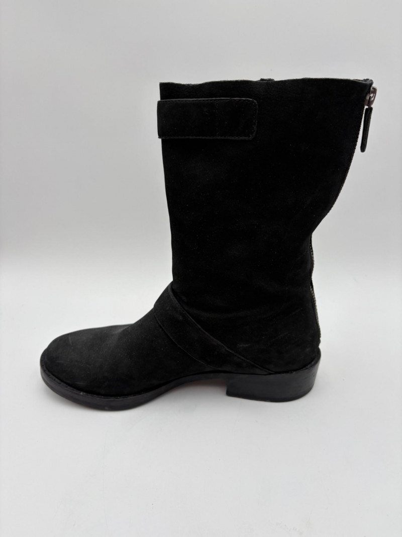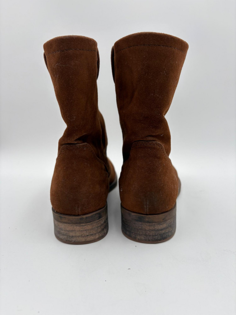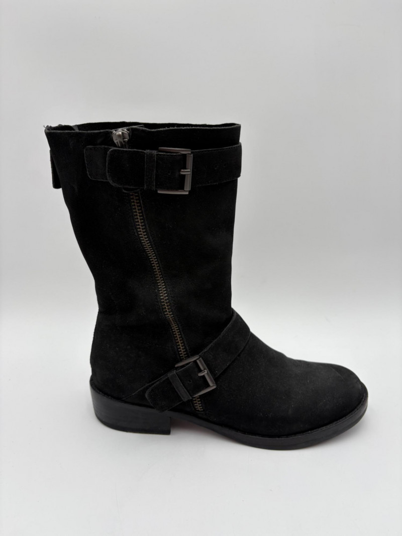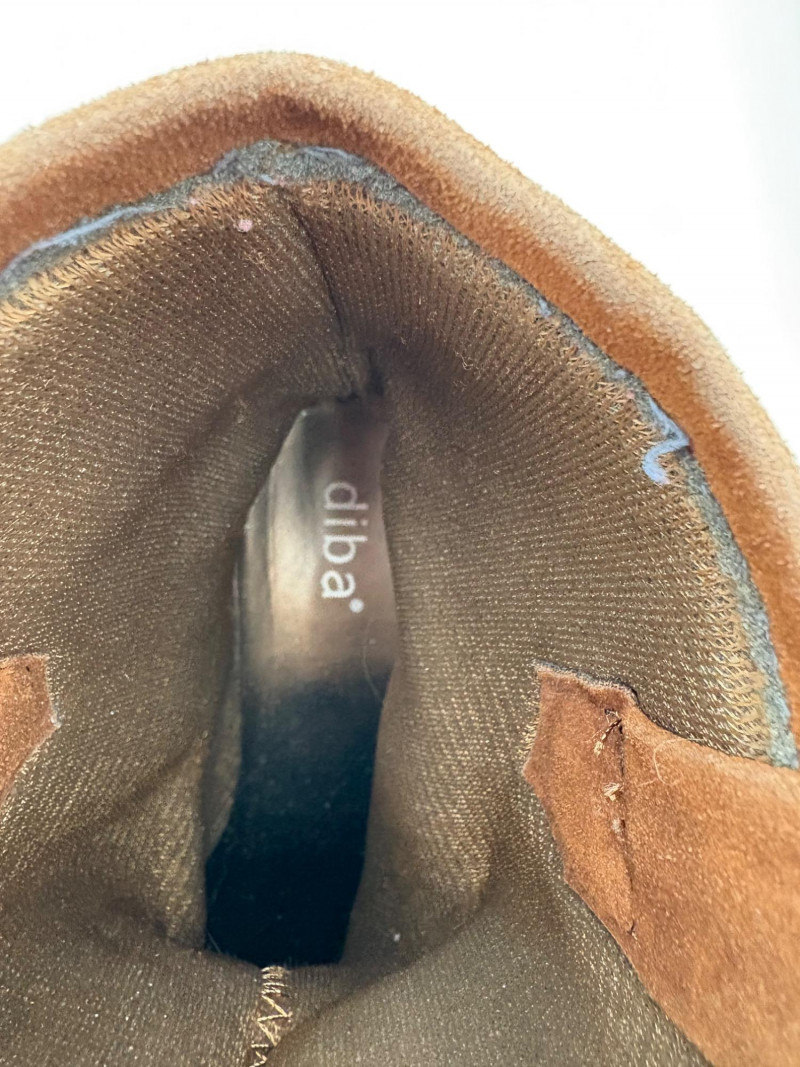 Eileen Fisher black suede engineer-style boots with back & side zips, stacked heel, and buckle detailing. Size 7. Diba brown ankle boots with stacked heel and top tabs (no material tag, but the brand usually works with leather). No size found, but probably a 7 or 7.5 given client's shoe size.
