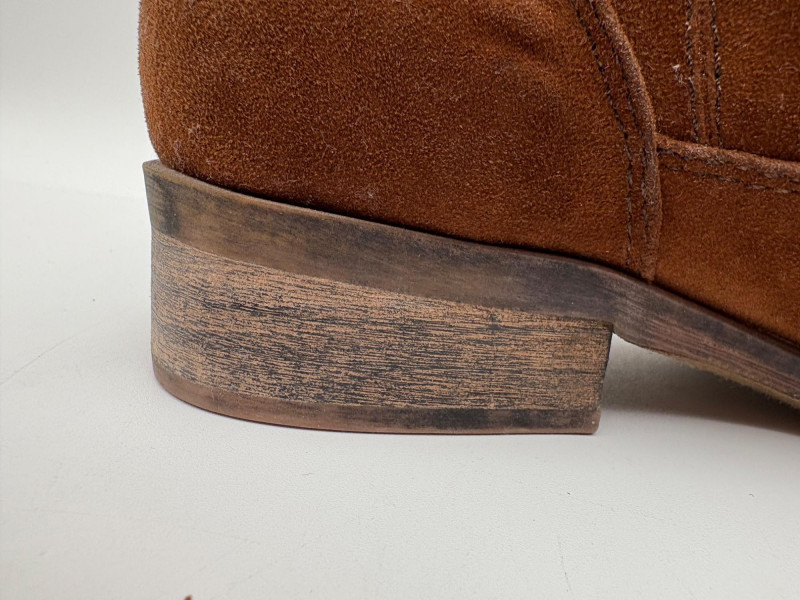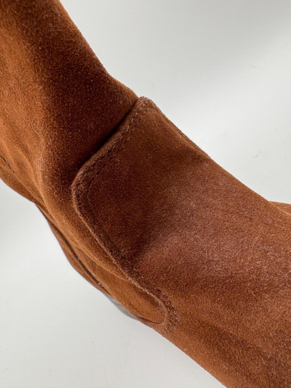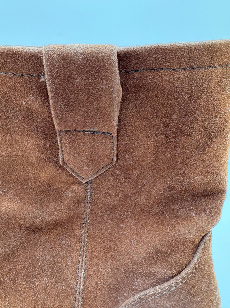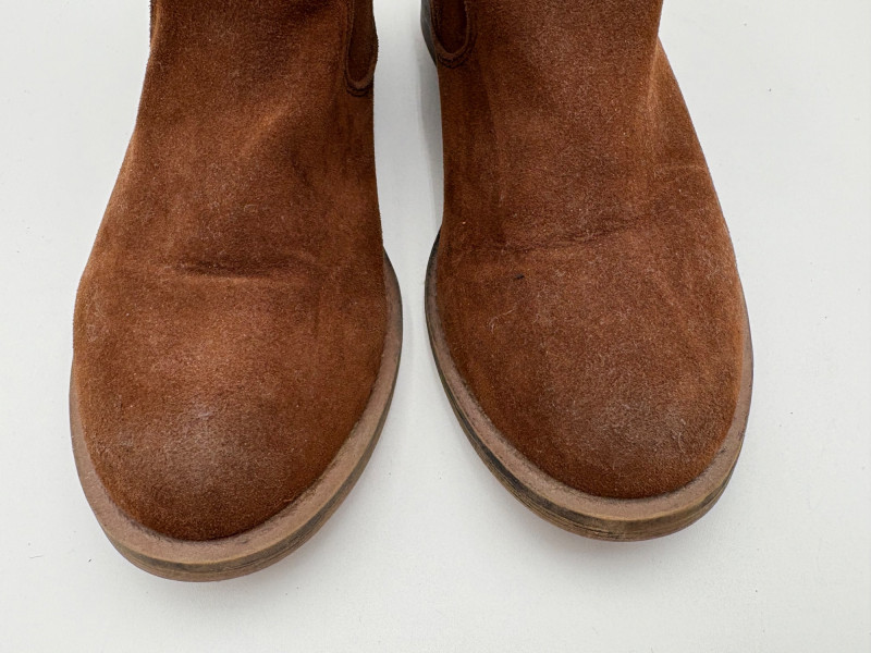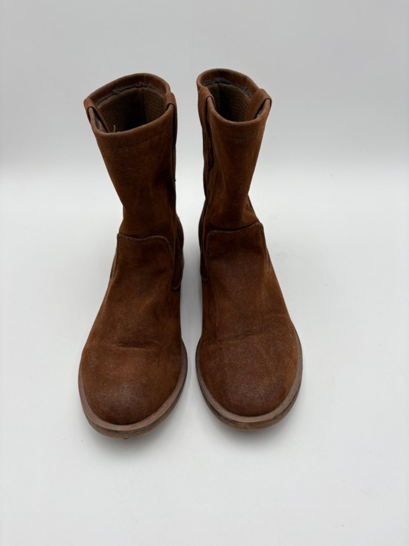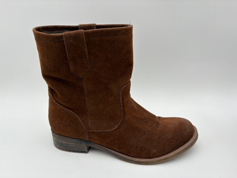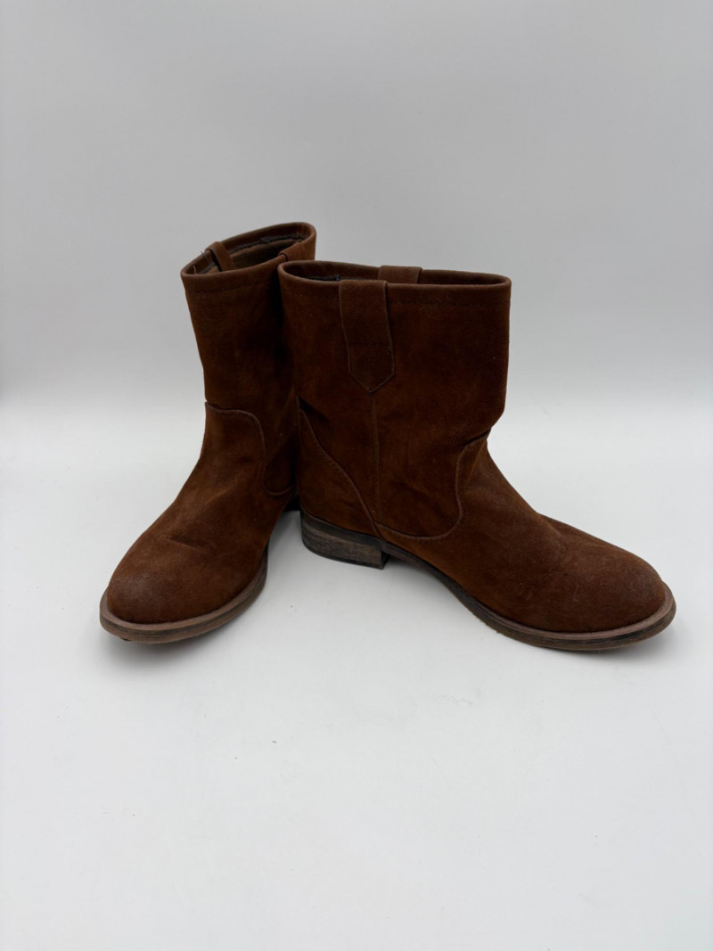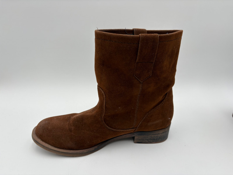 Eileen Fisher black suede engineer-style boots with back & side zips, stacked heel, and buckle detailing. Size 7. Diba brown ankle boots with stacked heel and top tabs (no material tag, but the brand usually works with leather). No size found, but probably a 7 or 7.5 given client's shoe size.