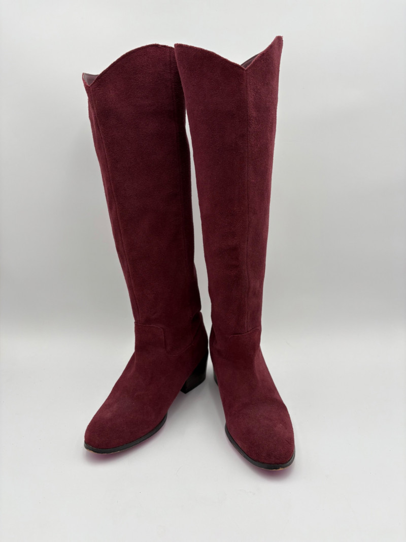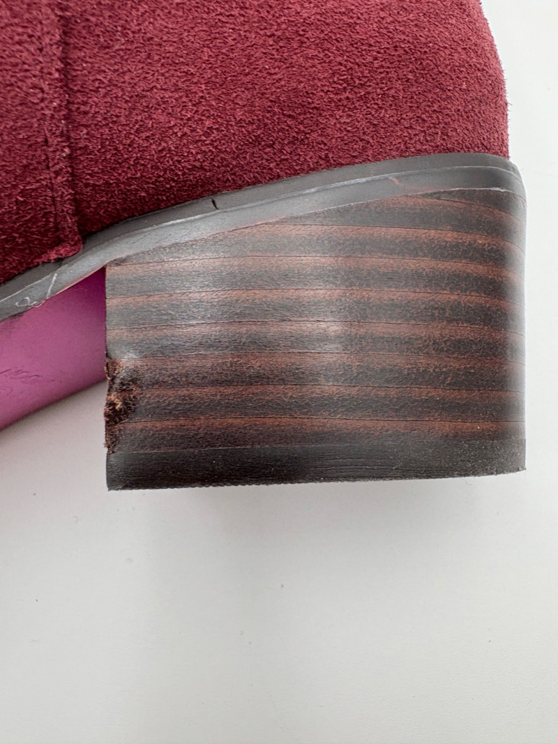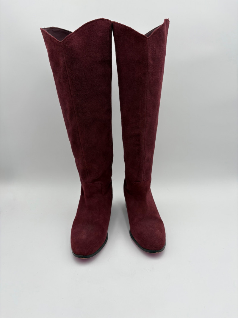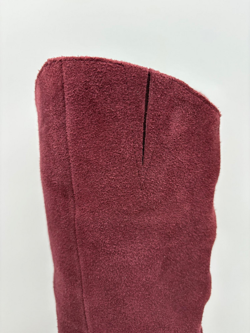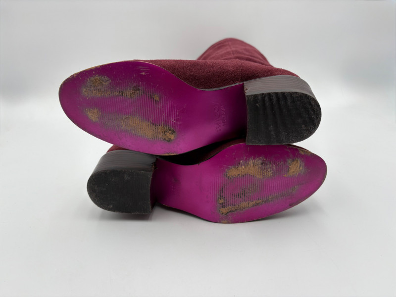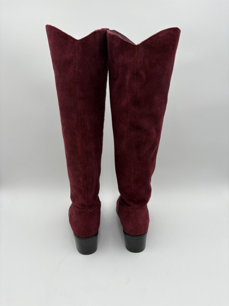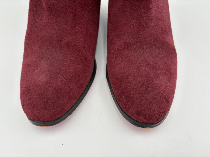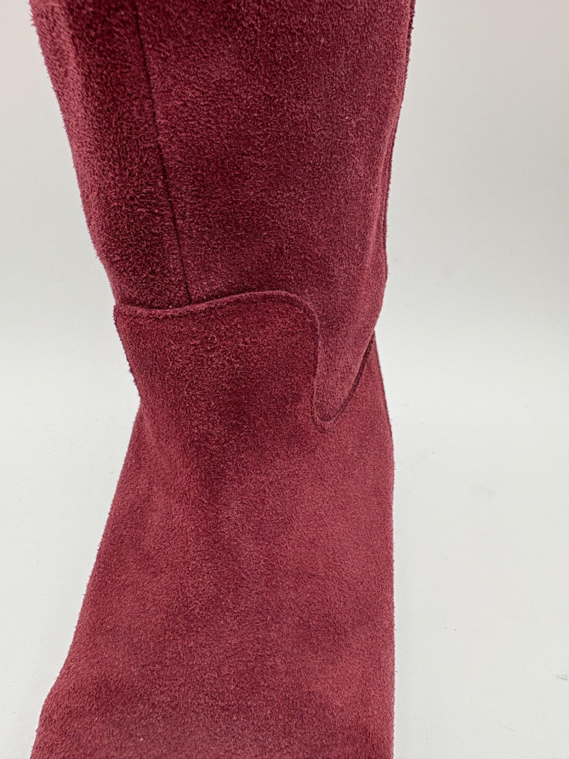 Report boots have leather & stretch uppers on rubber sole/heel with inside zip. Size 7. Twiggy London burgundy soft suede boots are pull-on with a stacked heel. Size 7. (Note some damage on heels- see last 2 photos).