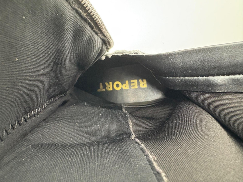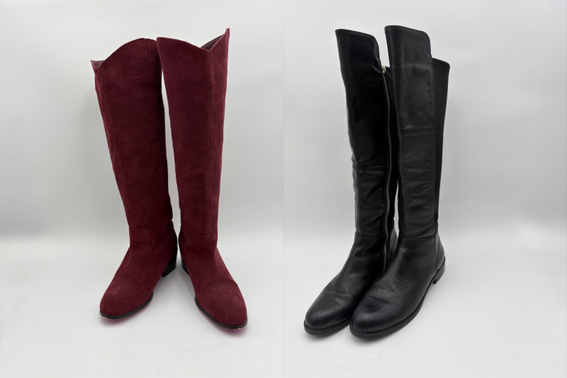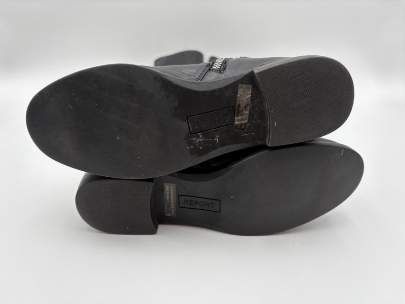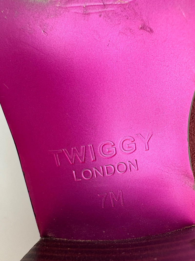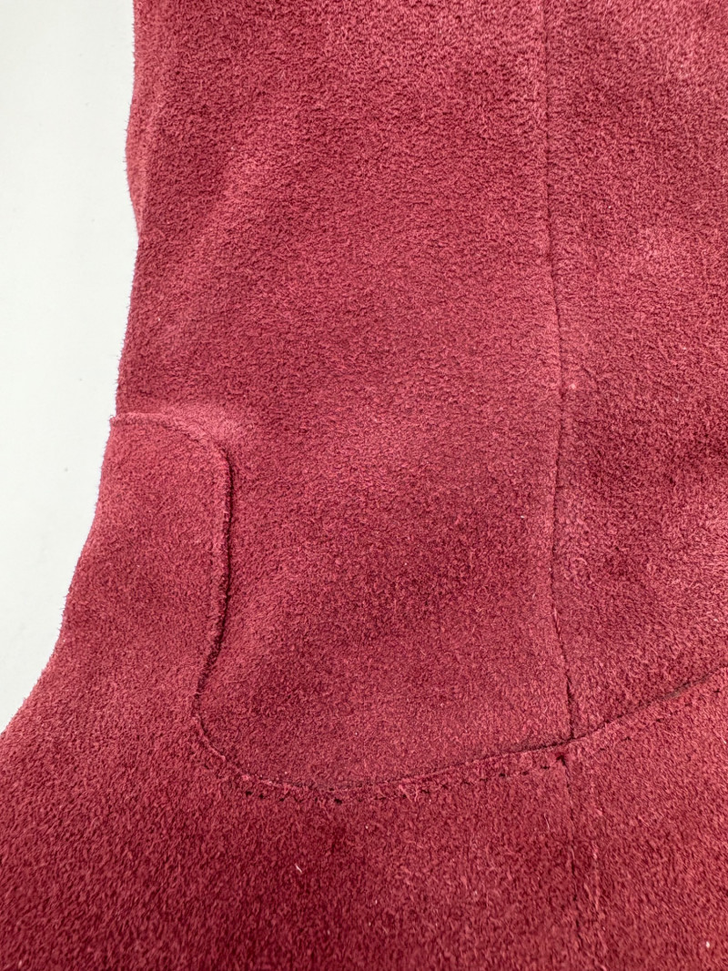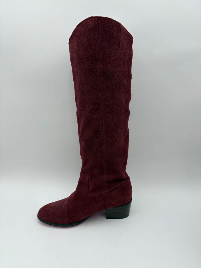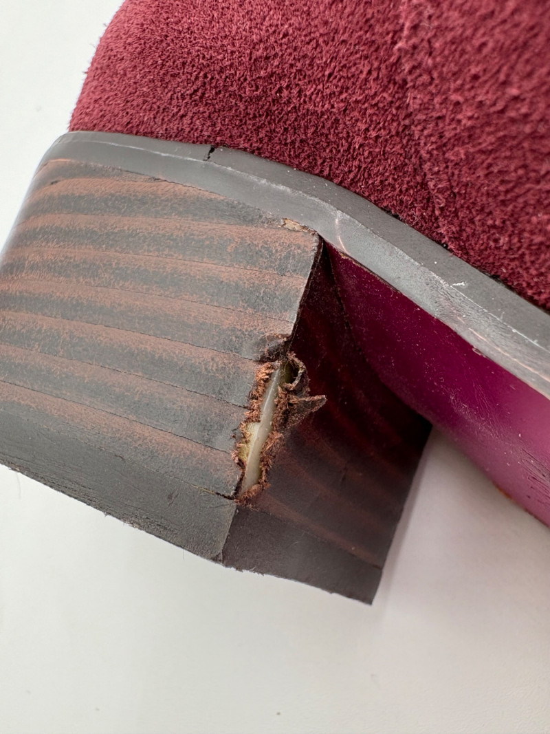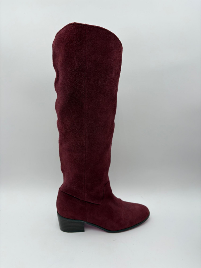Report boots have leather & stretch uppers on rubber sole/heel with inside zip. Size 7. Twiggy London burgundy soft suede boots are pull-on with a stacked heel. Size 7. (Note some damage on heels- see last 2 photos).