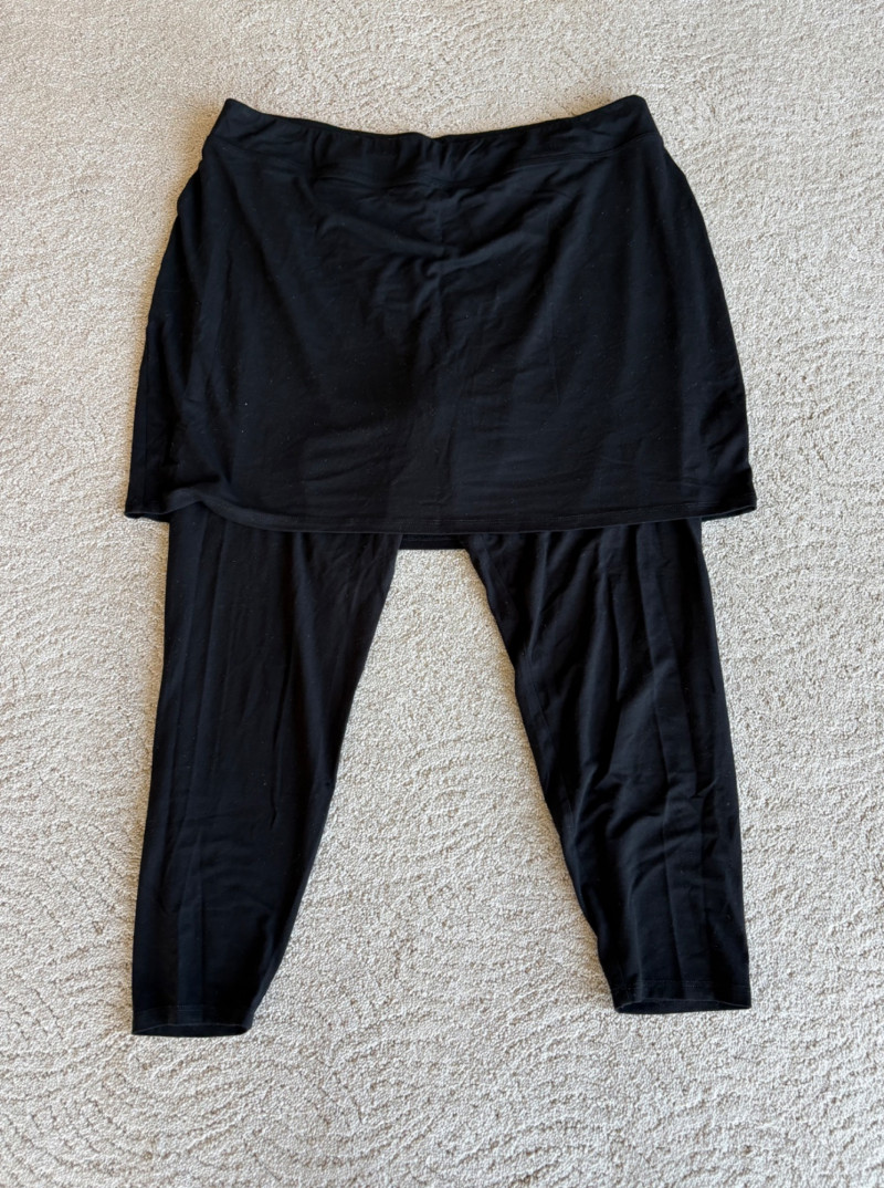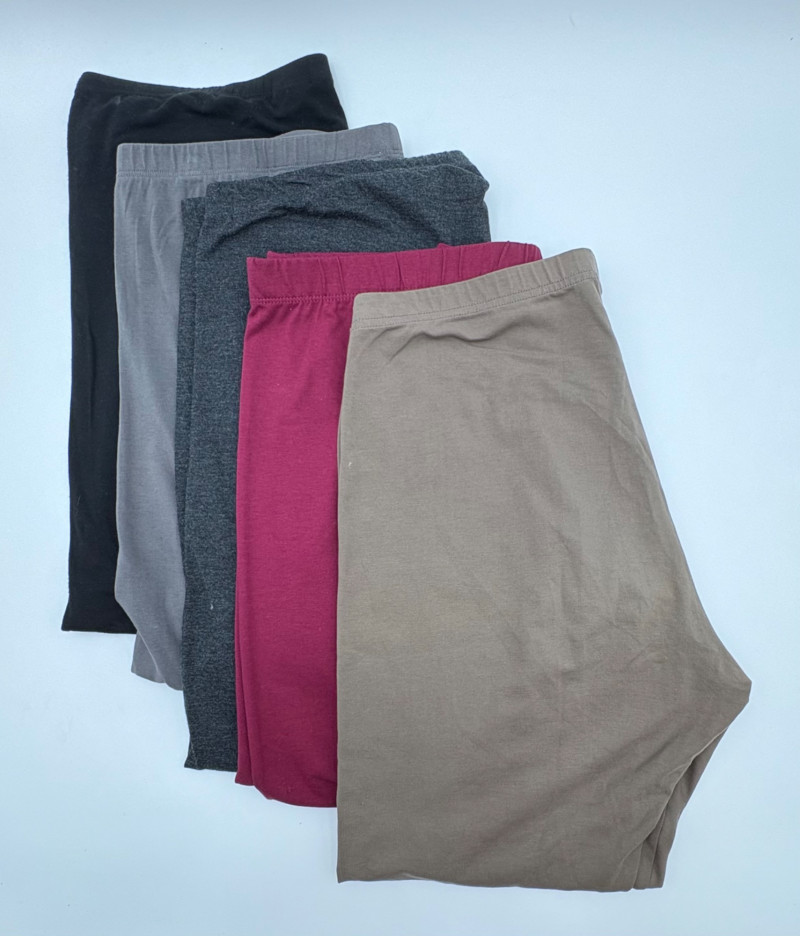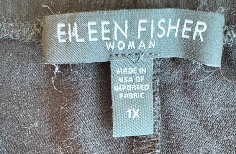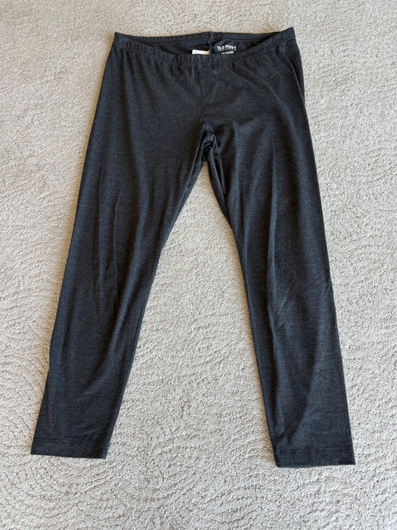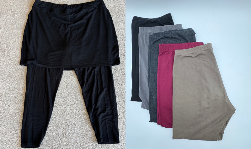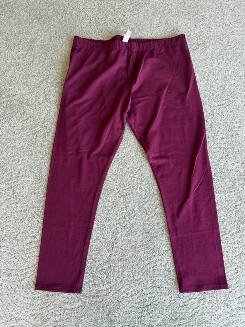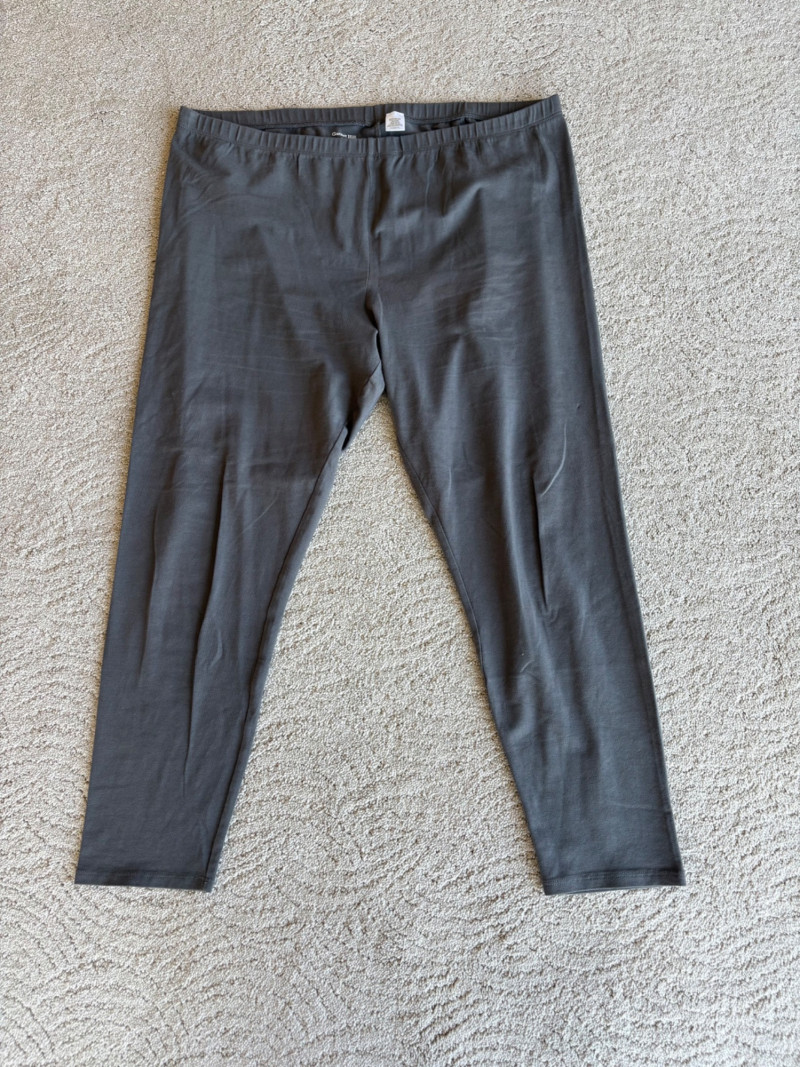 6 pairs of leggings from various makers. All measure between 17' - 17.5" side to side at the waist. - Smooth black pair from Eileen Fisher are rayon/spandex blend. Size tag says 1X - Dark grey pair from Old Navy are cotton/polyester/spandex blend. Size tag says XXL. - Burgundy pair from No Boundaries are cotton/spandex blend. Size tag says XXL. - Lighter grey pair from Garnet Hill are cotton/spandex blend. Size tag says XL - Brown pair from J Jill are cotton/spandex blend. Size tag says L - Black combination skirt/leggings from Eileen Fisher are viscose/spandex blend. Skirt measures 24" from waistband to bottom hem. Size tag says XL. Note there is light wear on the skirt - again a speed date with your sweater shaver will resolve.