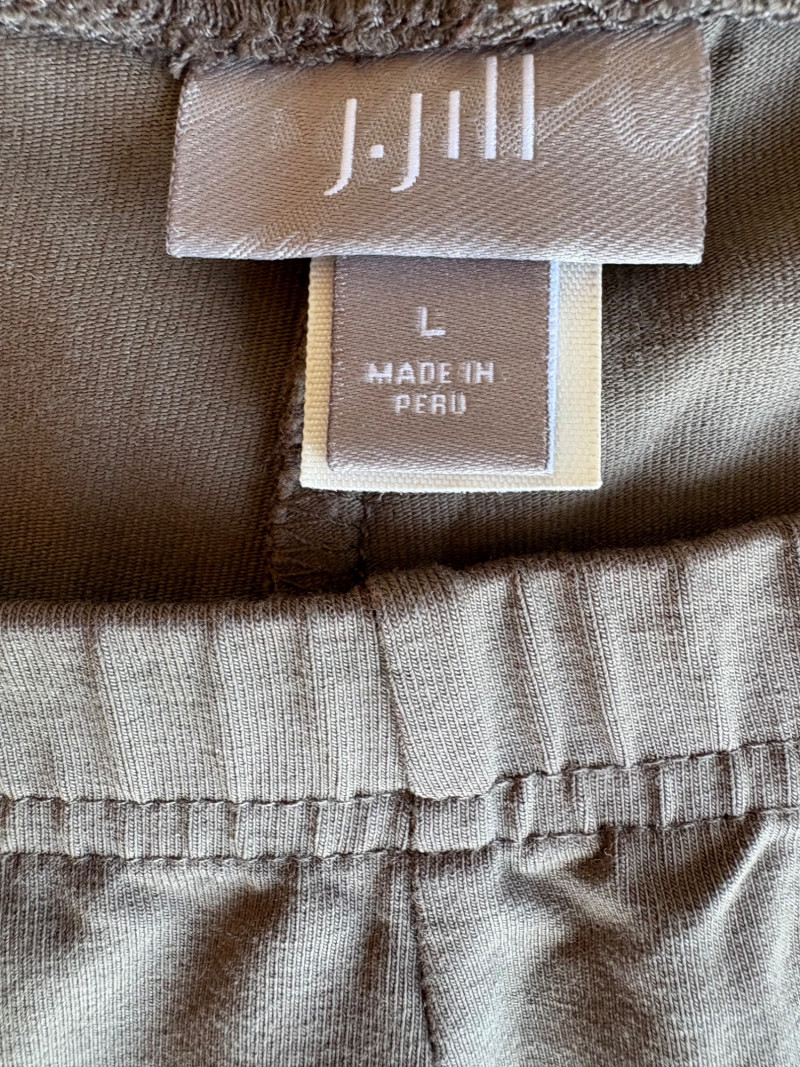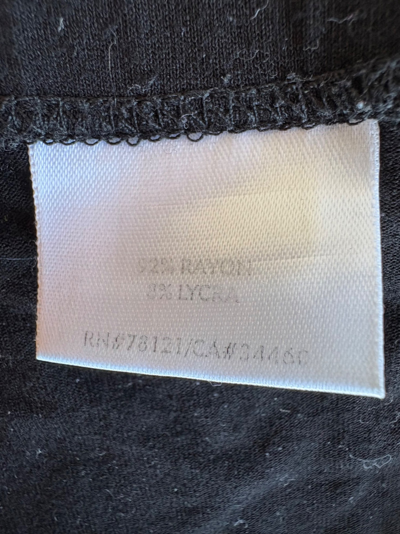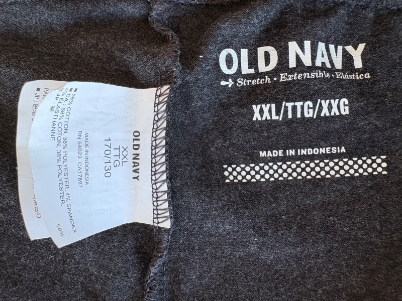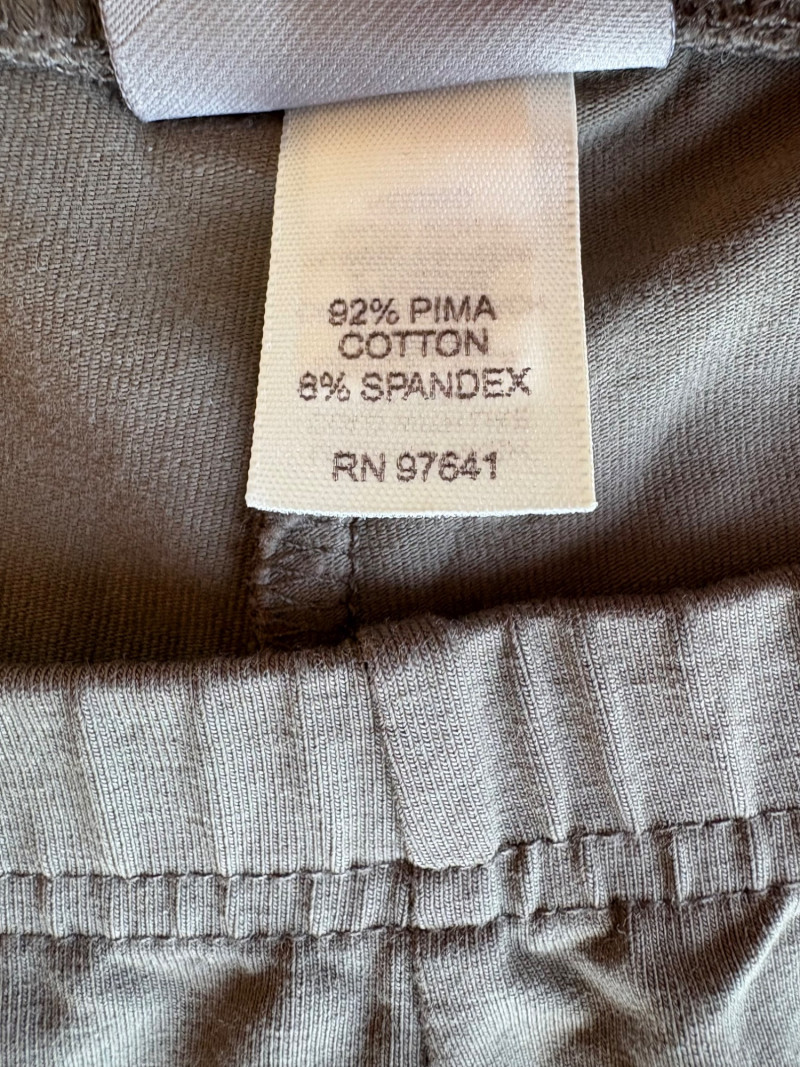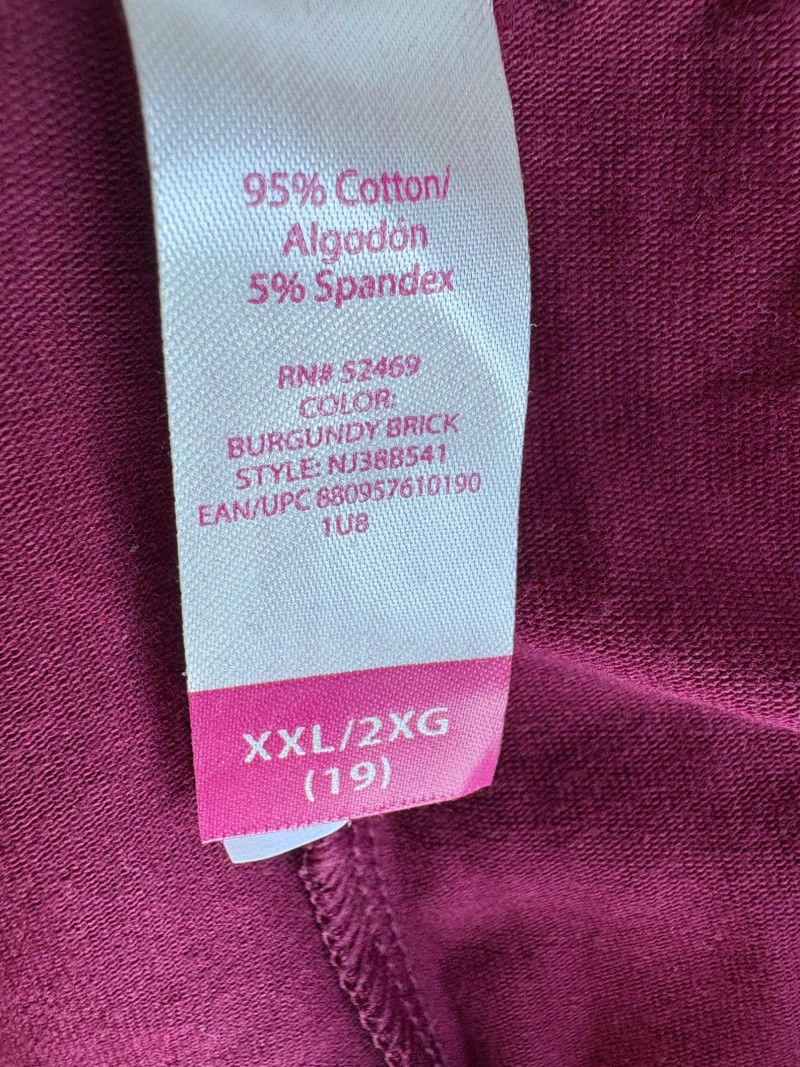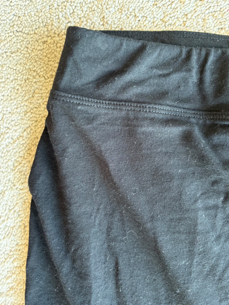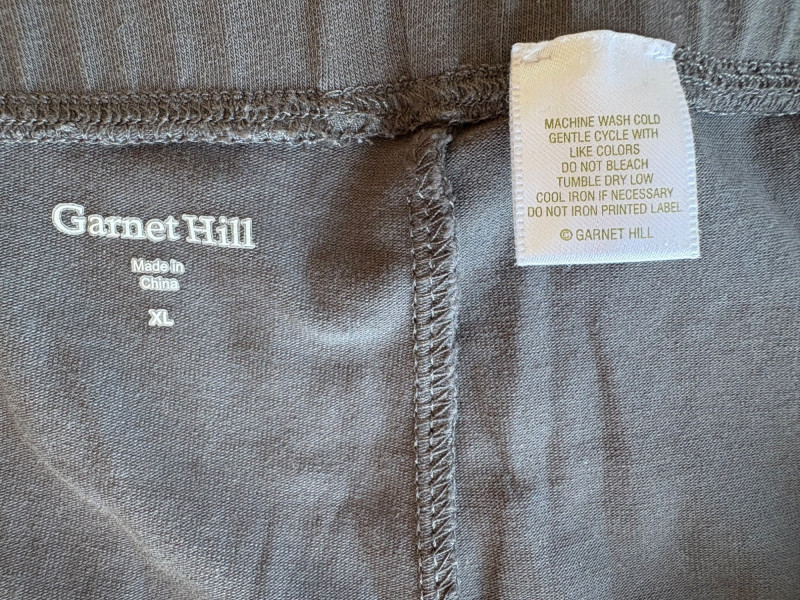 6 pairs of leggings from various makers. All measure between 17' - 17.5" side to side at the waist. - Smooth black pair from Eileen Fisher are rayon/spandex blend. Size tag says 1X - Dark grey pair from Old Navy are cotton/polyester/spandex blend. Size tag says XXL. - Burgundy pair from No Boundaries are cotton/spandex blend. Size tag says XXL. - Lighter grey pair from Garnet Hill are cotton/spandex blend. Size tag says XL - Brown pair from J Jill are cotton/spandex blend. Size tag says L - Black combination skirt/leggings from Eileen Fisher are viscose/spandex blend. Skirt measures 24" from waistband to bottom hem. Size tag says XL. Note there is light wear on the skirt - again a speed date with your sweater shaver will resolve.